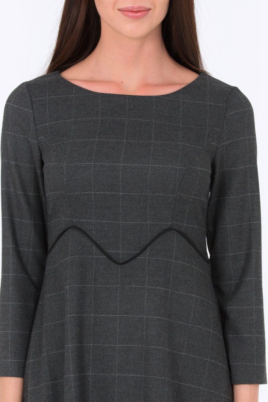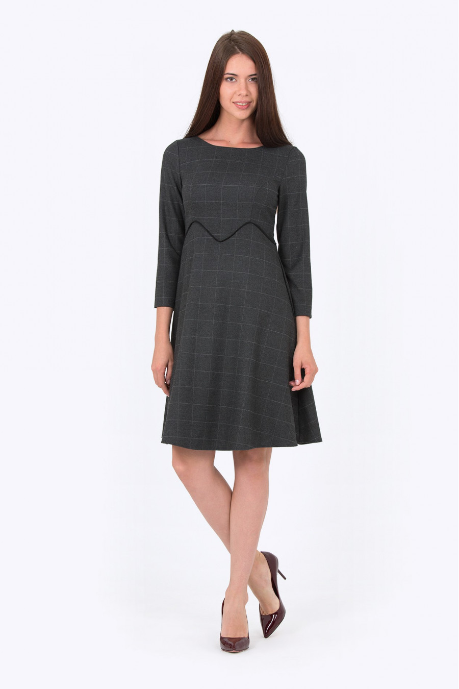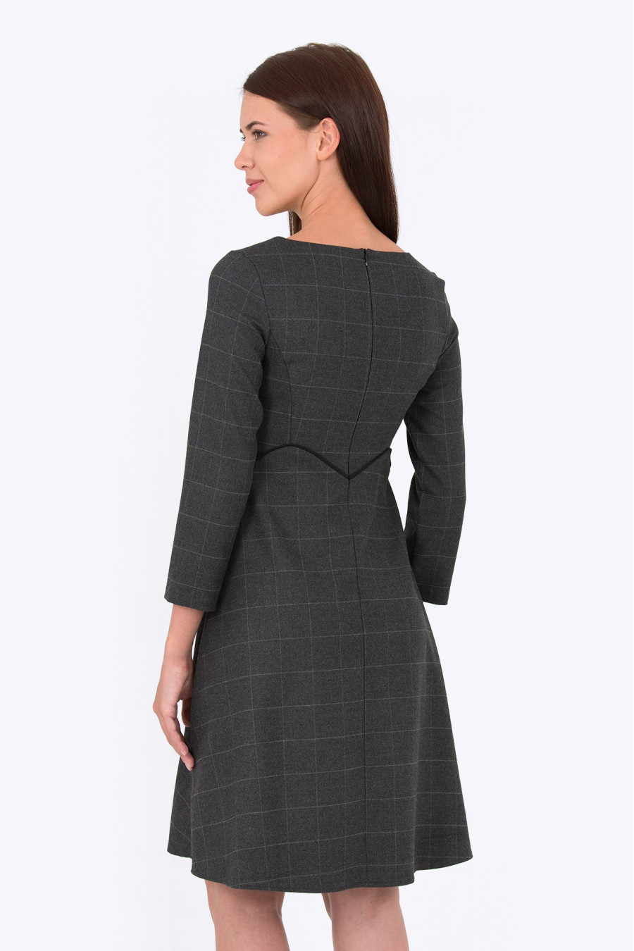 Приталенное платье в клетку, отрезное по линии талии. Ткань мягкая, с эффектом шерсти темно-серого цвета. Рукава 3/4, без подклада. Платье хорошо сидит по фигуре, формирует силуэт песочные часы. Хорошо подойдет для повседневной носки. Длина градируется от размера к размеру: 42 размер - 92 см 54 размер - 104 см. Рост фотомодели 172 см. Длина: 92 см.