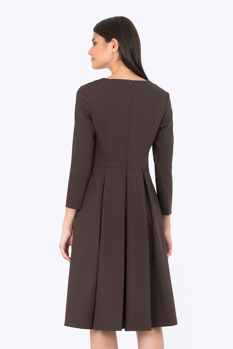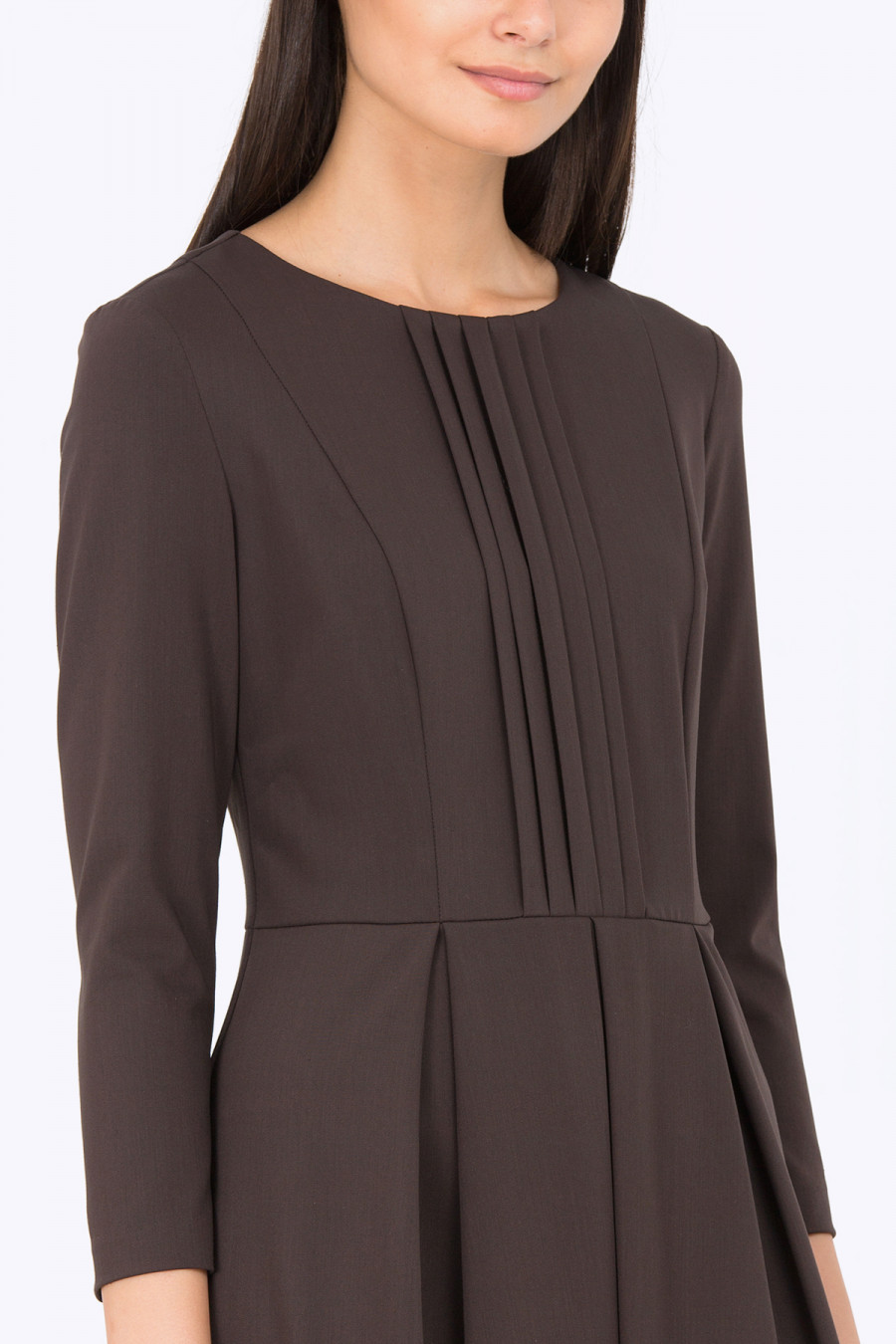 Элегантное платье приятного темно-шоколадного цвета. Ткань плотная, гладкая, очень приятная к телу. Платье отрезное по линии талии, юбка с аккуратными складками. Полочка по центру также оформлена небольшими складками. Без подкладки. Очень женственная модель на повседневную носку. Хорошо подойдет для осенне-зимнего периода. Длина градируется от размера к размеру: 42 размер - 104 см, 52 размер - 108 см. Рост фотомодели 172 см. Длина: 101 см.
