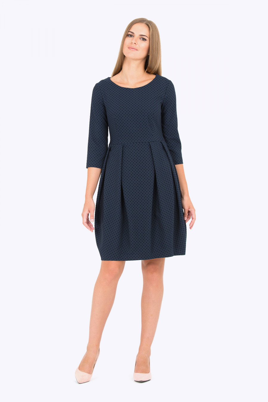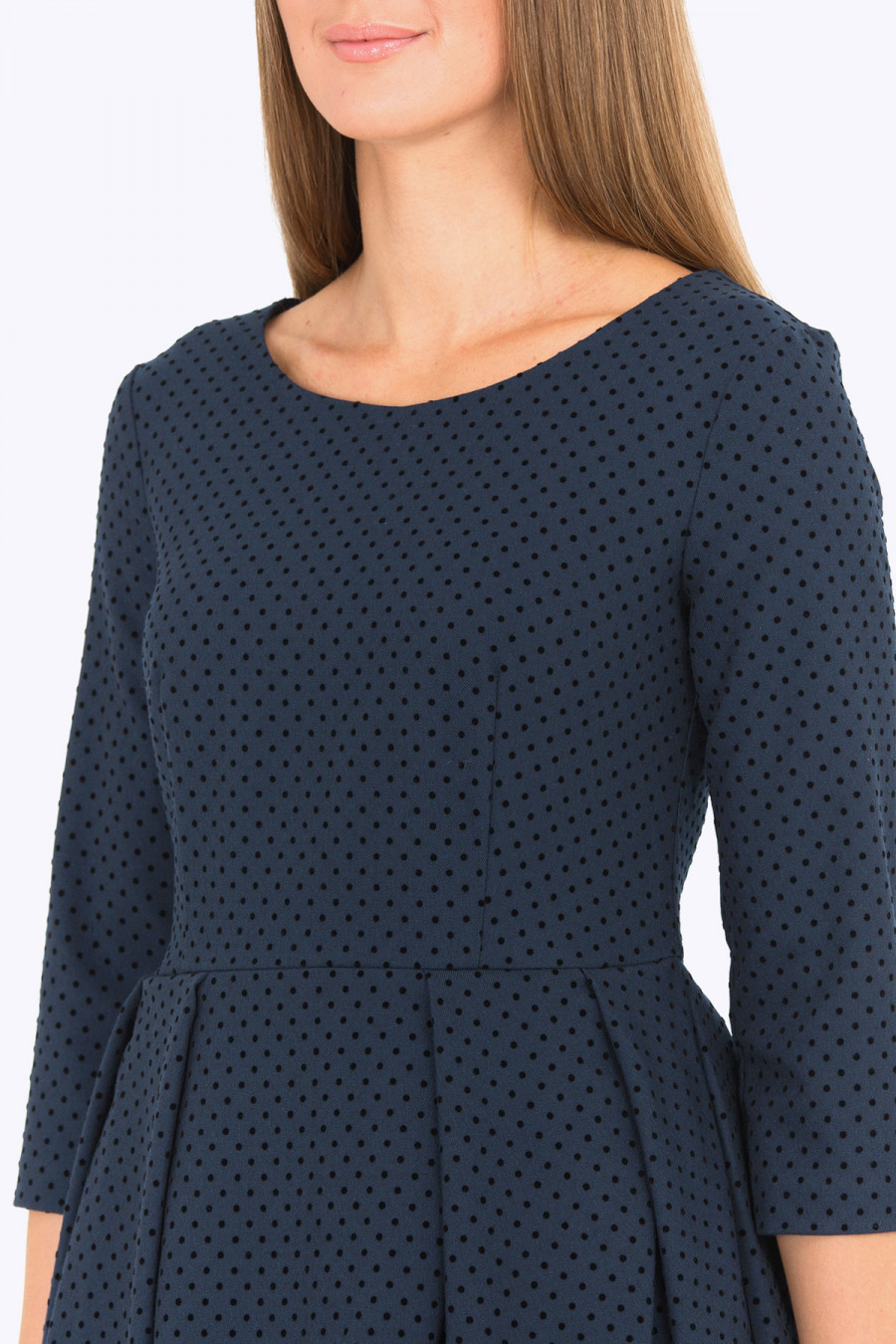 Элегантное приталенное платье. Ткань мягкая, фактурная с объемным темно-синим принтом. Платье отрезное по линии талии, юбка-колокол с аккуратными складками. Без подкладки, рукава 3/4. Очень комфортная и неприхотливая в носке модель. Подойдет и для офиса и для торжественного мероприятия. Длина градируется от размера к размеру: 42 размер - 90 см, 52 размер - 100 см. Рост фотомодели 172 см. Длина: 90 см.