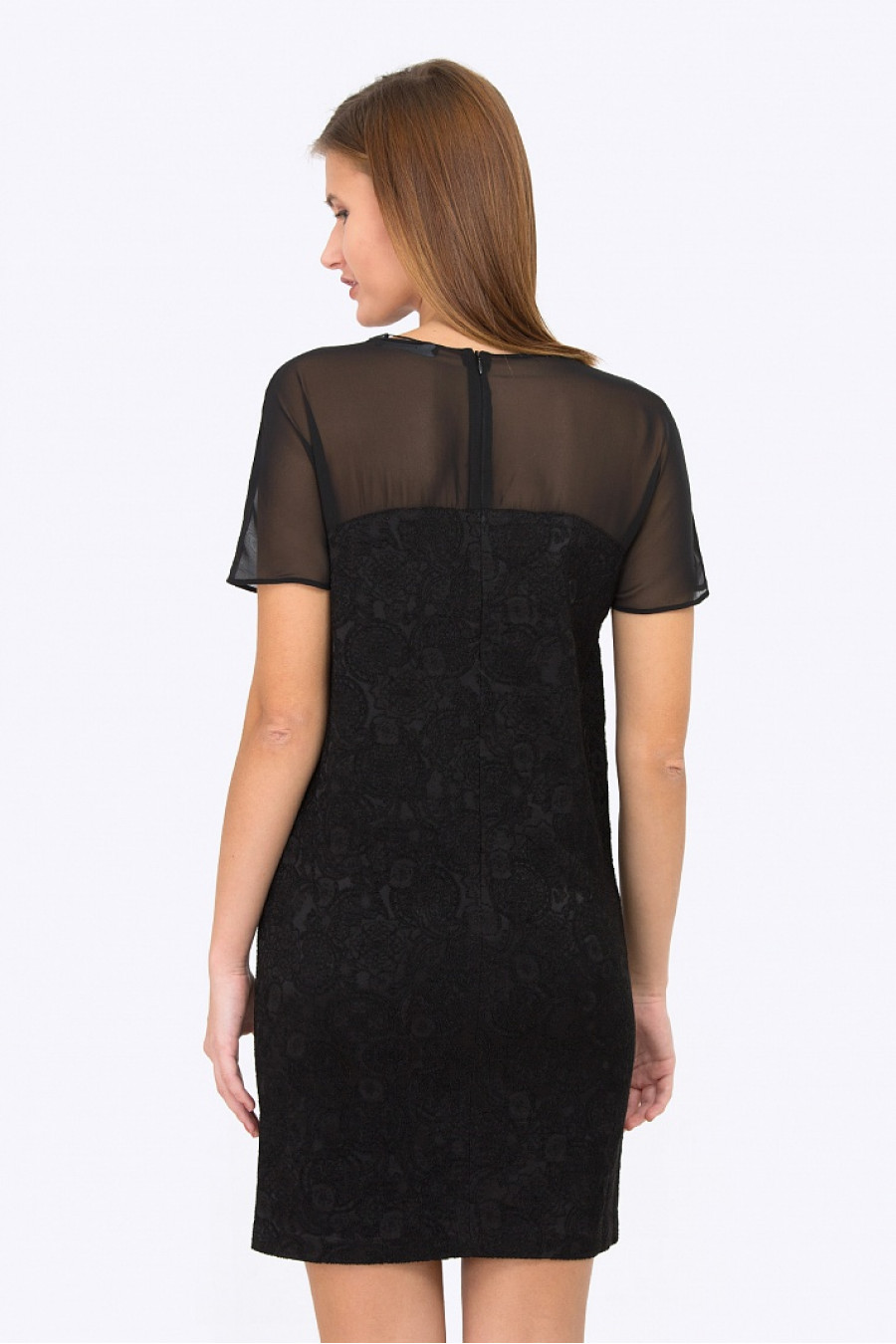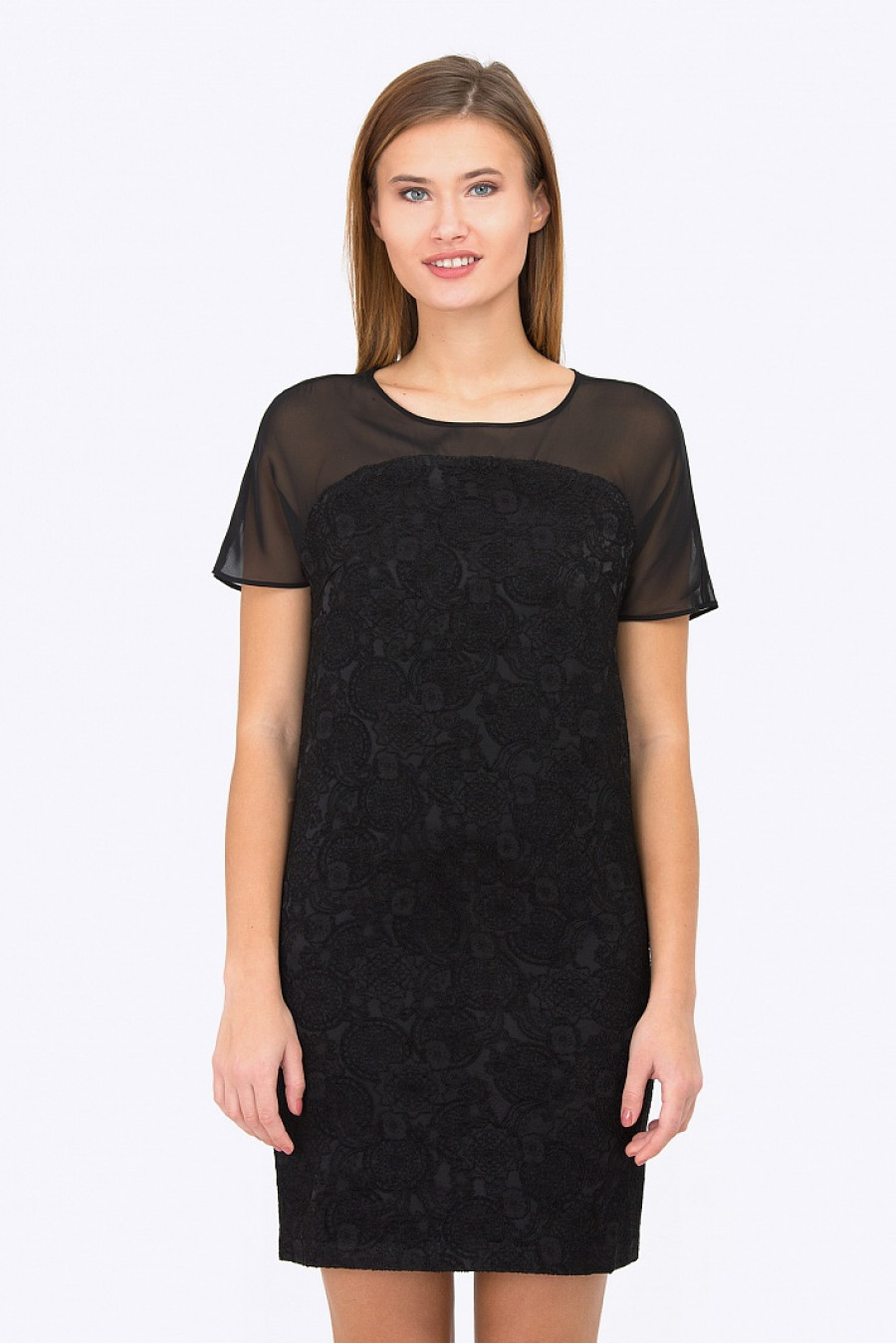 Нарядное платье прямого кроя из черного жаккарда и фигурной кокеткой из шифона. Ткань - эластичная структурная, с эффектом глянца. Стильная модель без лишних делай, красивое сочетание тканей - изюминка этого платья. Идеально подойдет для праздничного мероприятия. Рост фотомодели 175 см. Длина градируется от размера к размеру.