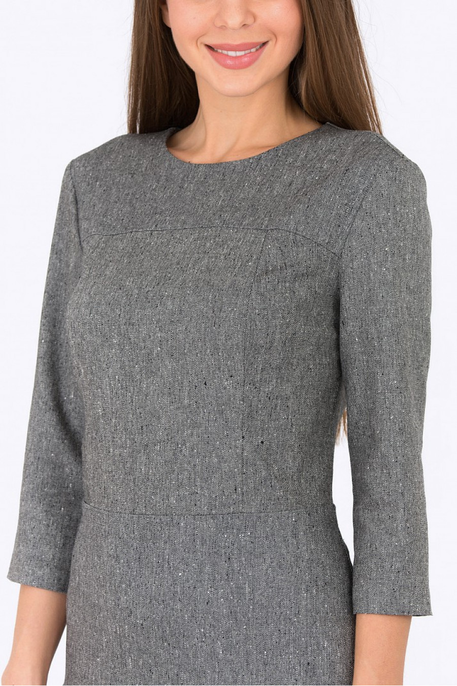 Элегантное приталенное платье серого цвета. Ткань фактурная с эффектом эластичности. Юбка с легким расклешением, ложится по фигуре с мягкими складками. Рукава 3/4, без подкладки. Отличный вариант на повседневную носку. Платье по длине не градируется.