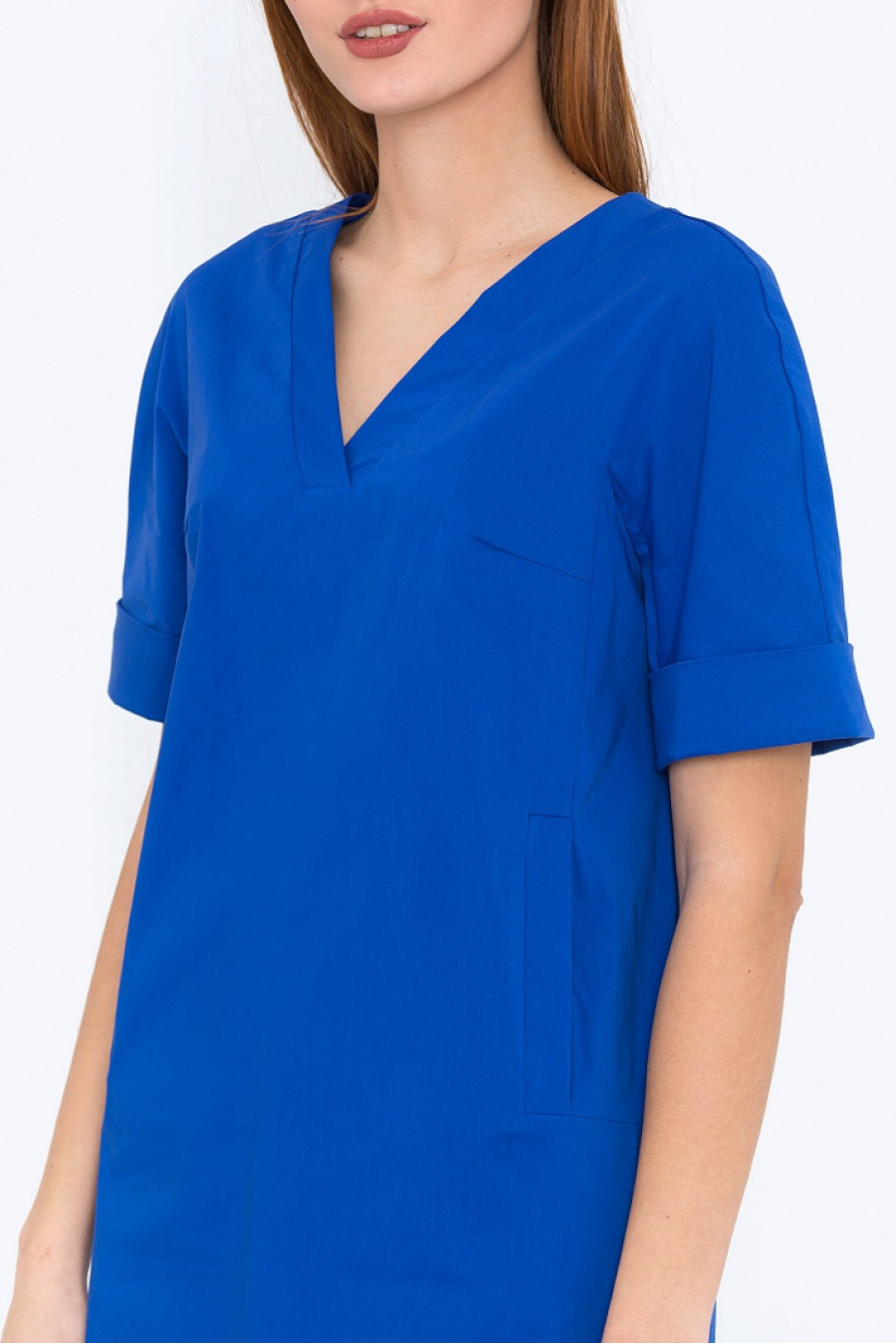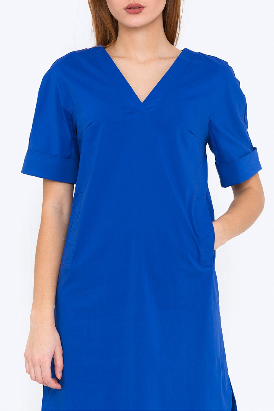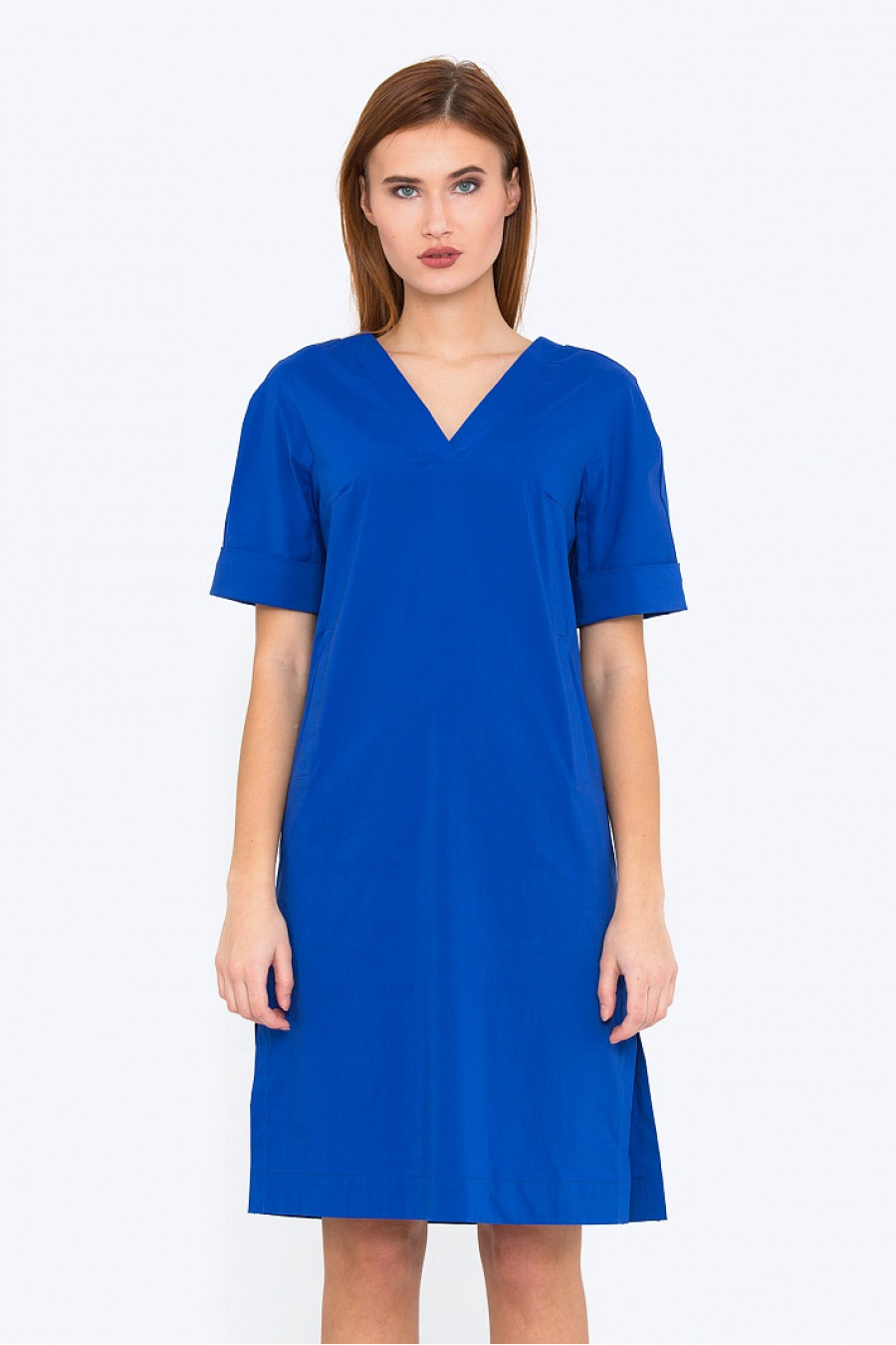 Платье прямого кроя с разрезами по бокам и V-образным вырезом. Есть два функциональных кармана. Без подкладки. Стильное платье на каждый день.Длина градируется от размера к размеру.