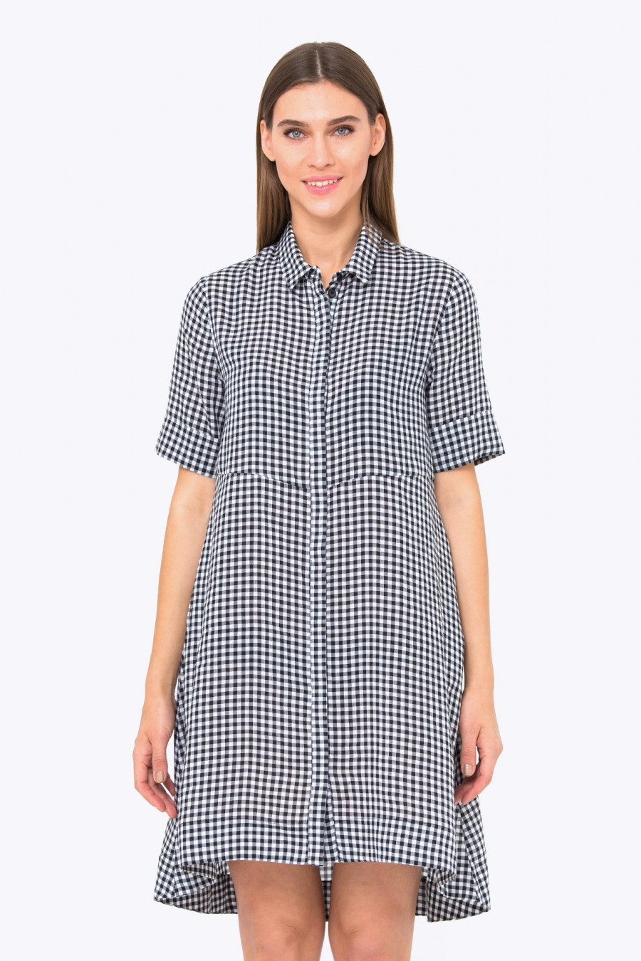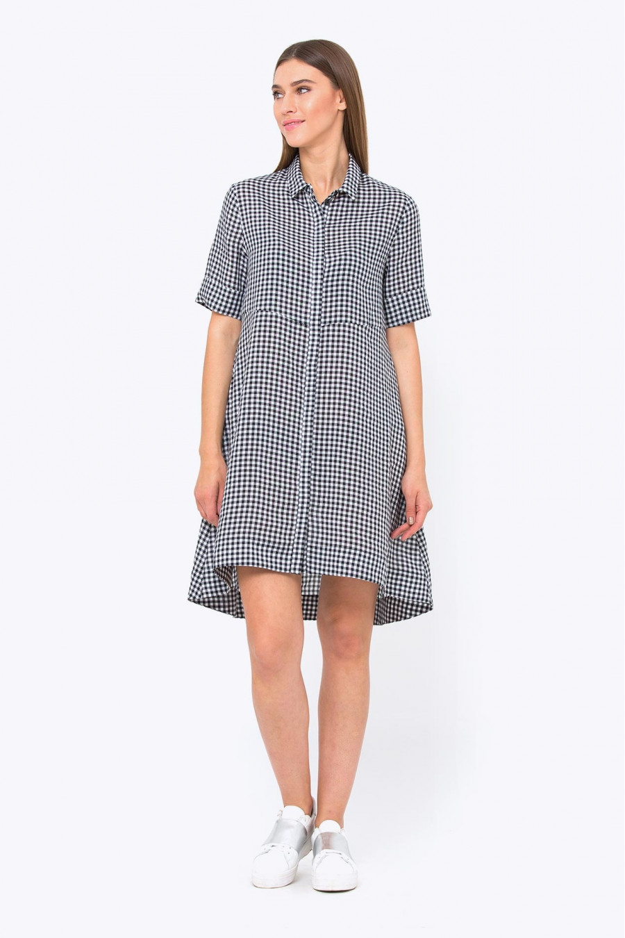 Платье-рубашка с асимметричным низом.В боковых швах карманы. Модель свободного кроя, не сковывает движения и создает стильный образ. Длина по спинке -100 см. Длина спереди - 85 см. Длина градируется от размера к размеру. Рост фотомодели 178см.