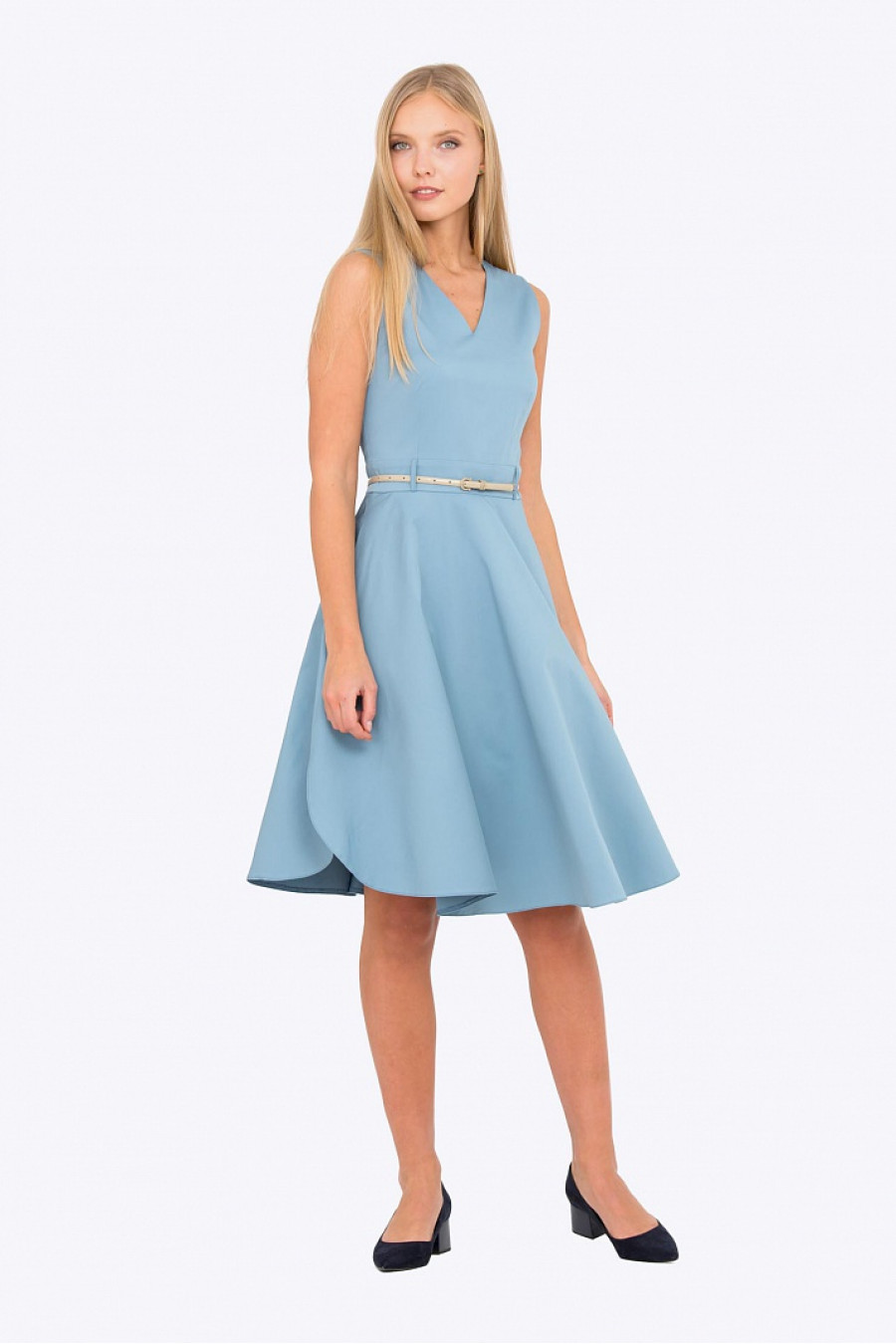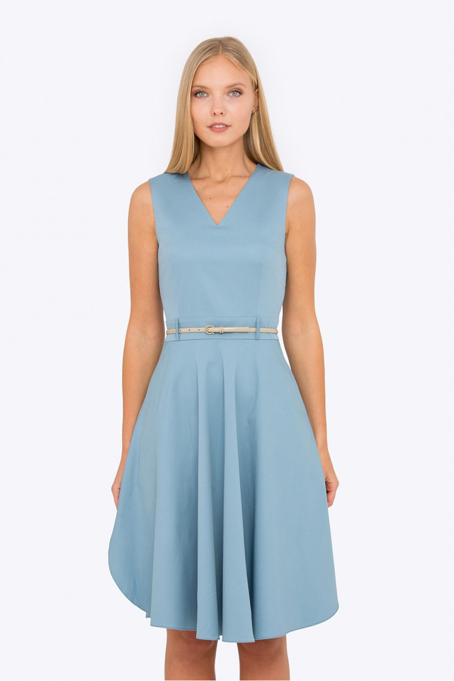 Приталенное платье с V-образным вырезом. Ткань приятная к телу серо-голубого цвета. Модель отрезная по лини талии, застежка-молния на спинке, есть шлевки, ремешок продается отдельно. Стильное летнее платье на каждый день или праздничное мероприятие. Рост фотомодели 173 см.