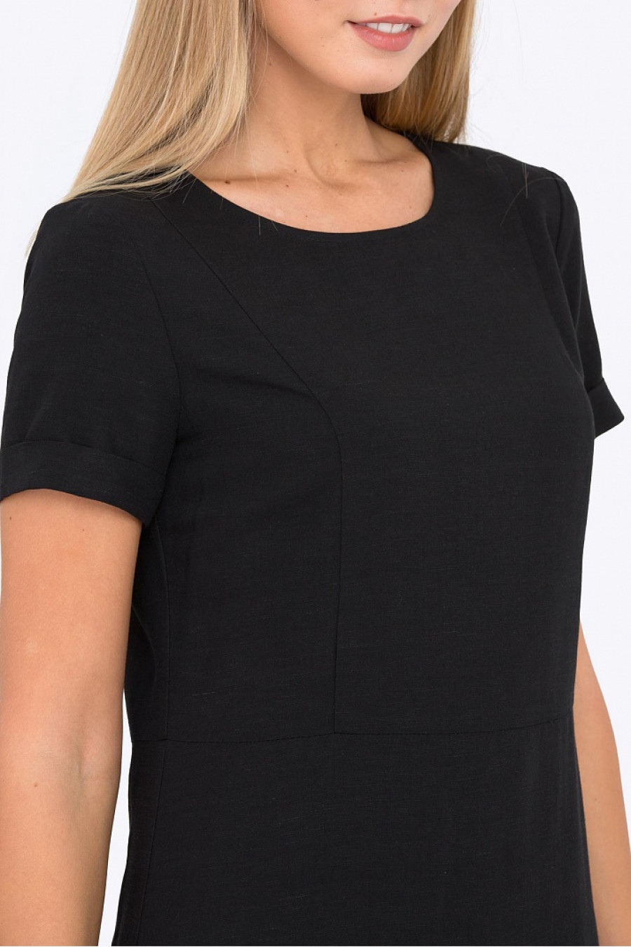 Легкое платье А- силуэта из легкого текстиля. Сзади застежка на пуговицу, короткие рукава.Модель хорошо сидит по фигуре и удобное в носке. Без подкладки. Маленькое черное платье на все случаи жизни. Рост фотомодели 173 см.