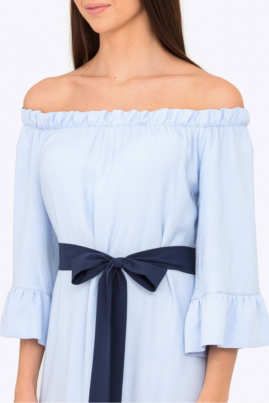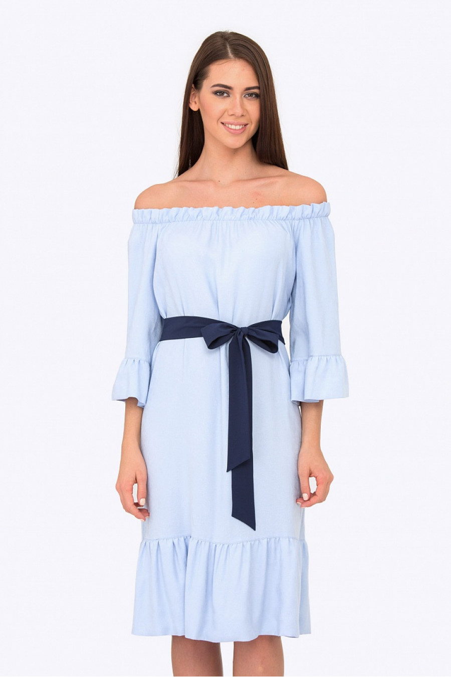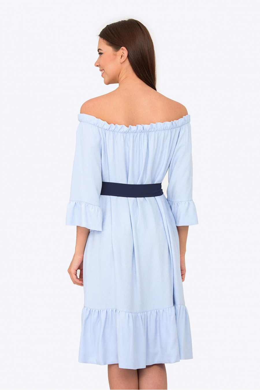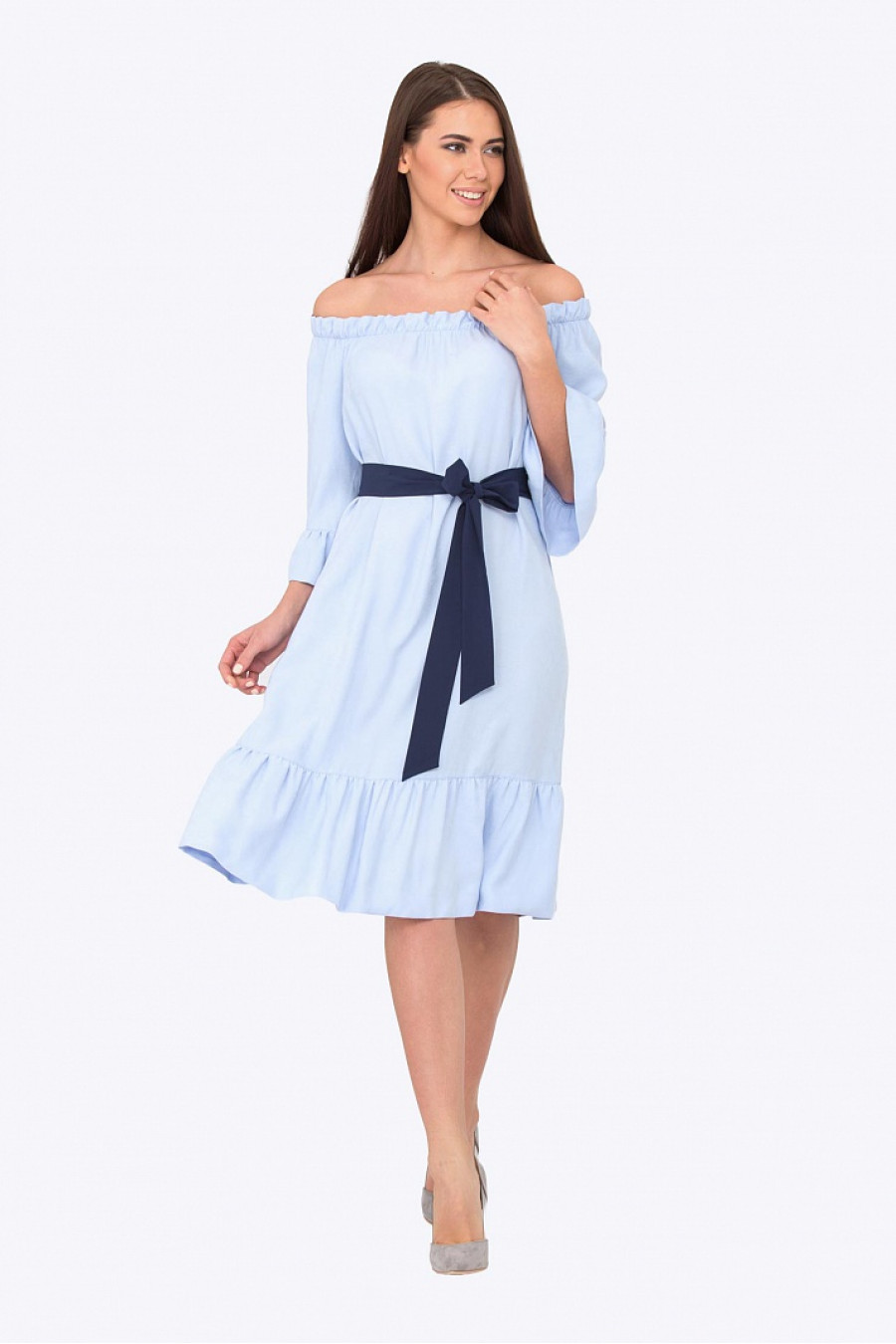 Изящное платье с декольте. Отделано рюшами по подолу и рукавам. В комплекте пояс контрастного цвета. Длина градируется от размера к размеру.