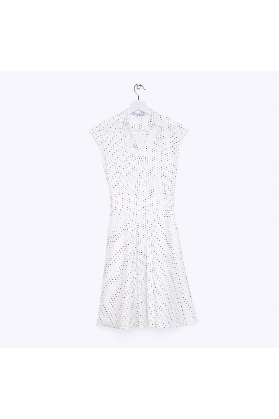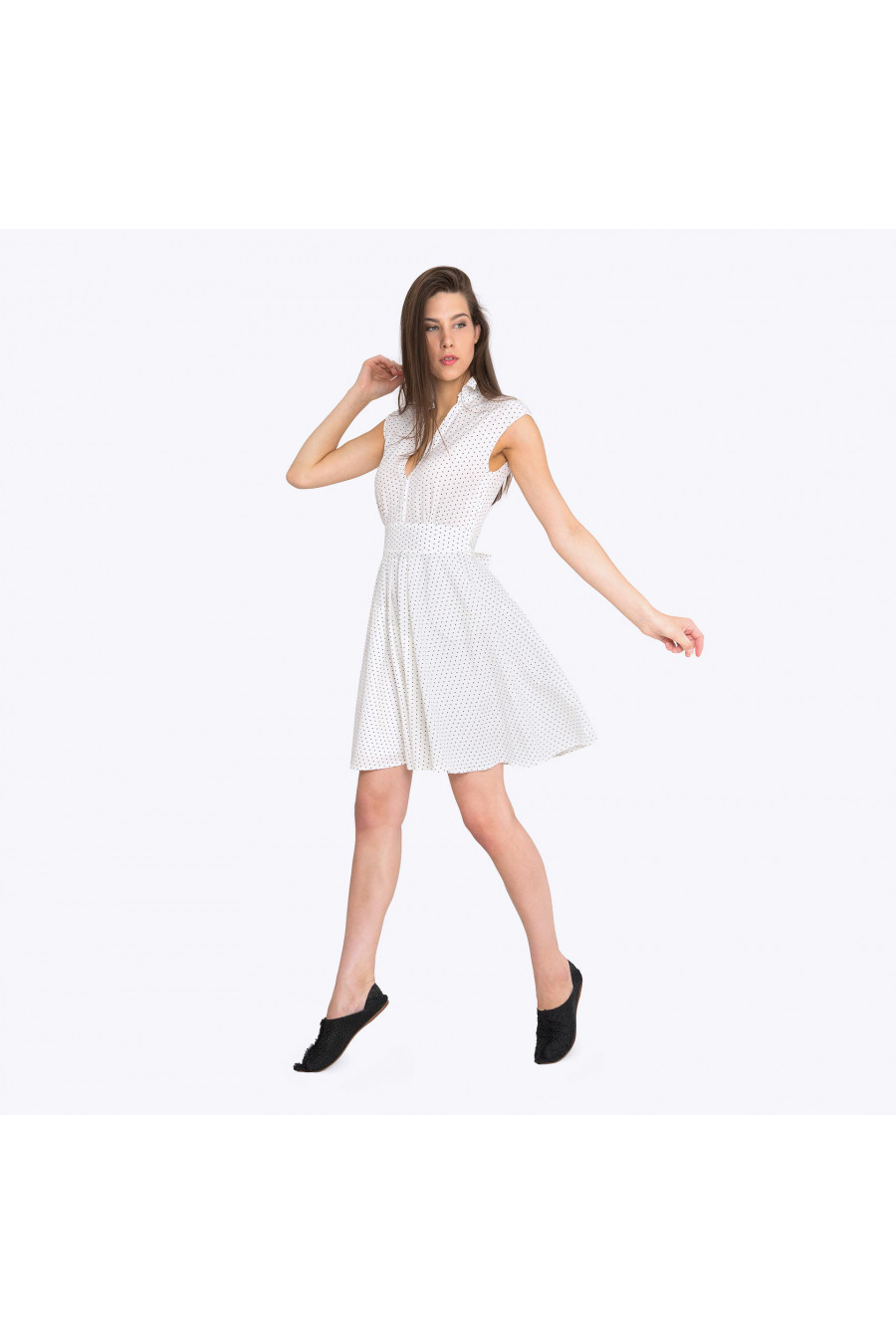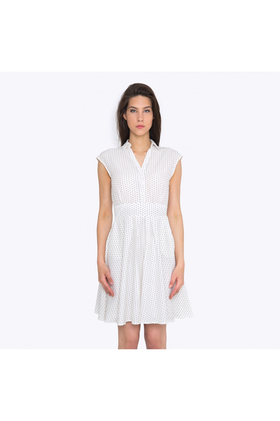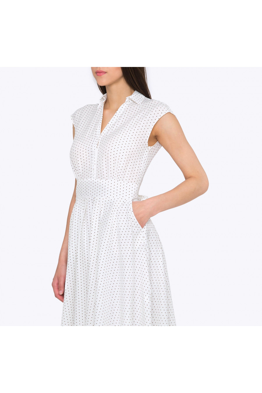 Платье приталенного силуэта, с бантом на поясе. Ткань с принтом горох. Модель с застежкой-планкой на пуговицах, по бокам функциональные карманы, на юбке есть подкладка. Легкое, женственное платье на каждый день и для летней вечеринке. Рост фотомодели 178 см.