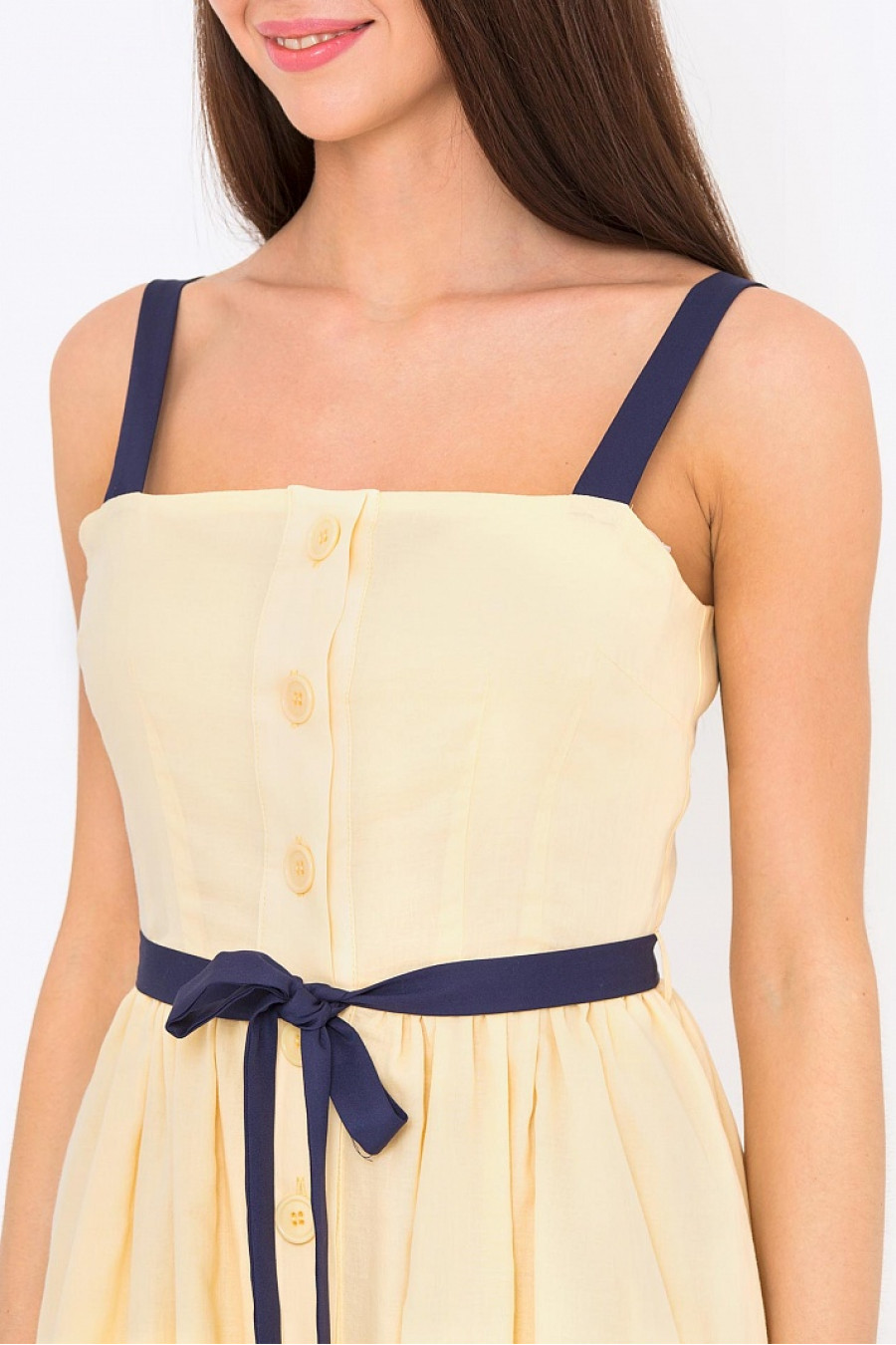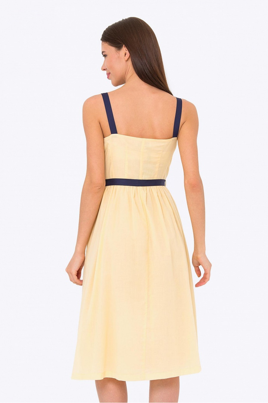 Платье на широких бретельках. Застежка на пуговицы. Есть тканевый пояс. Модель приталенного силуэта. Платье хорошо сидит по фигуре, подойдет для повседневной носке.