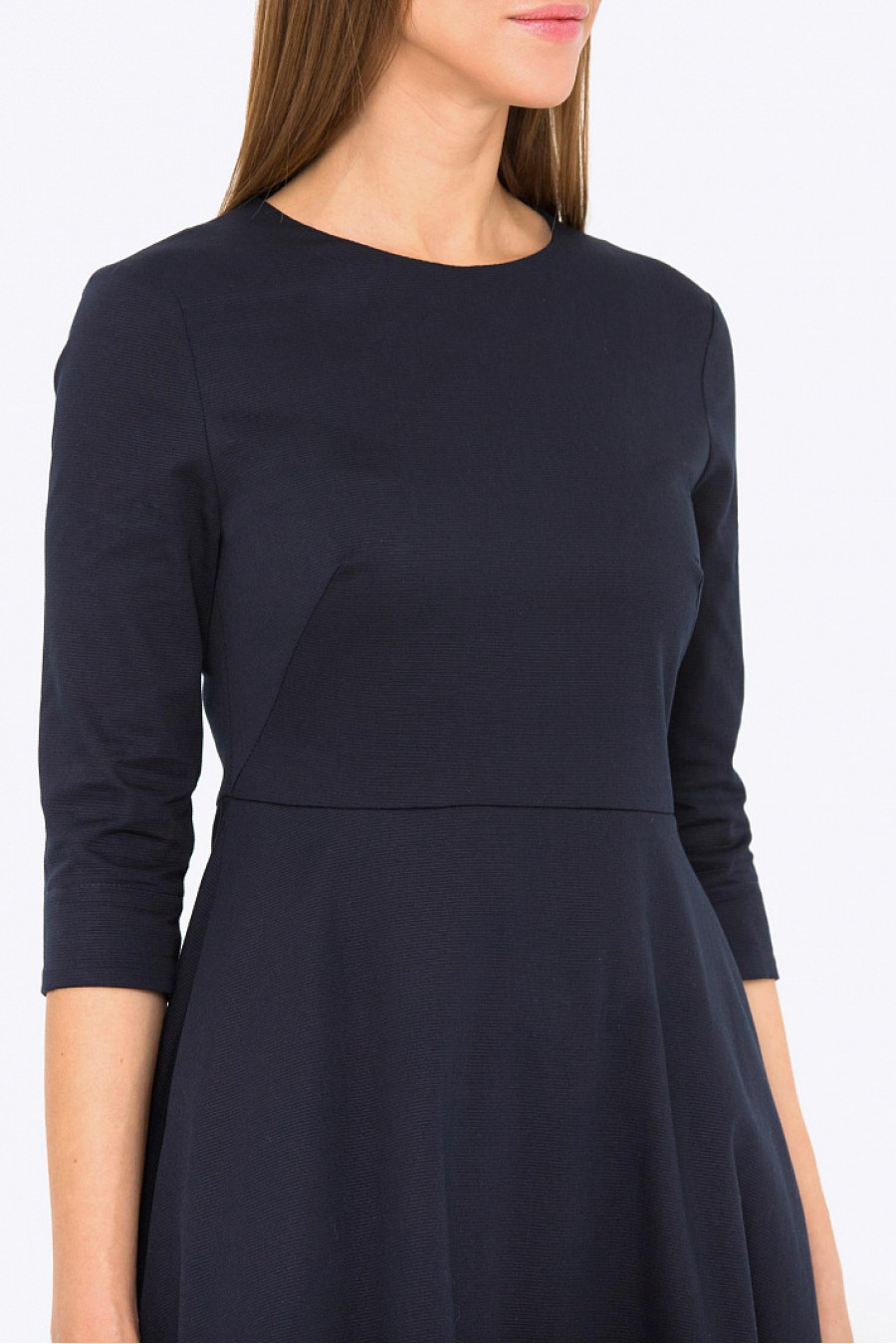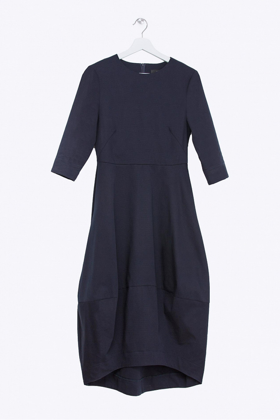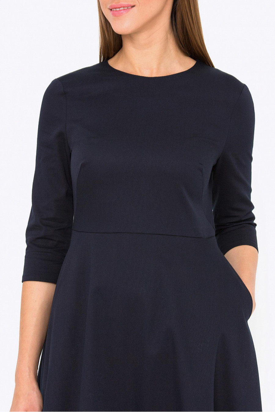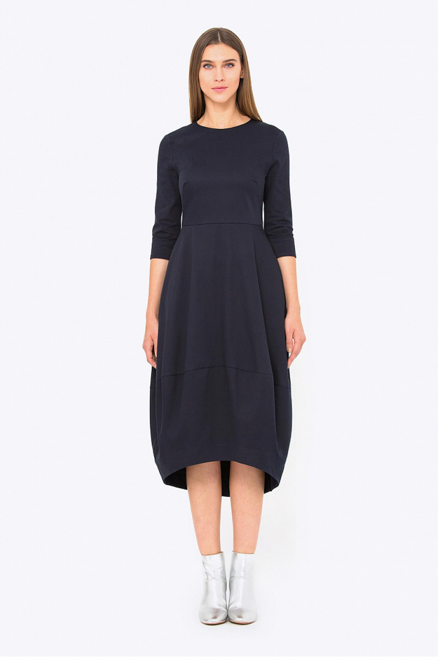 Платье миди приталенного кроя. Модель с асимметричным низом, в боковых швах функциональные карманы. Застежка-молния на спинке. Без подкладки. Ткань структурная, синего цвета. Стильное платье на каждый день, а с яркими аксессуарами подойдет для вечернего выхода в свет. Рост фотомодели 178 см.