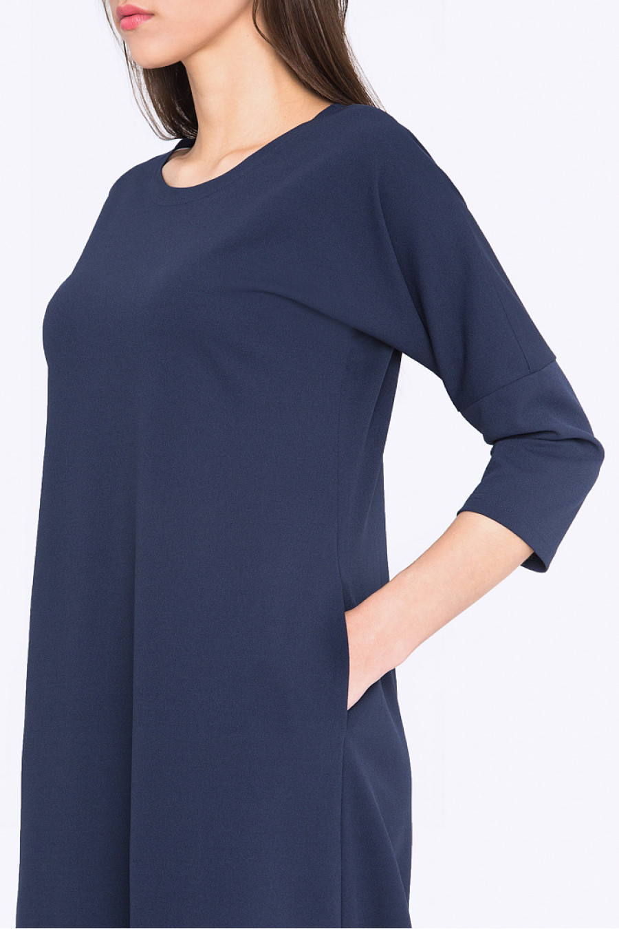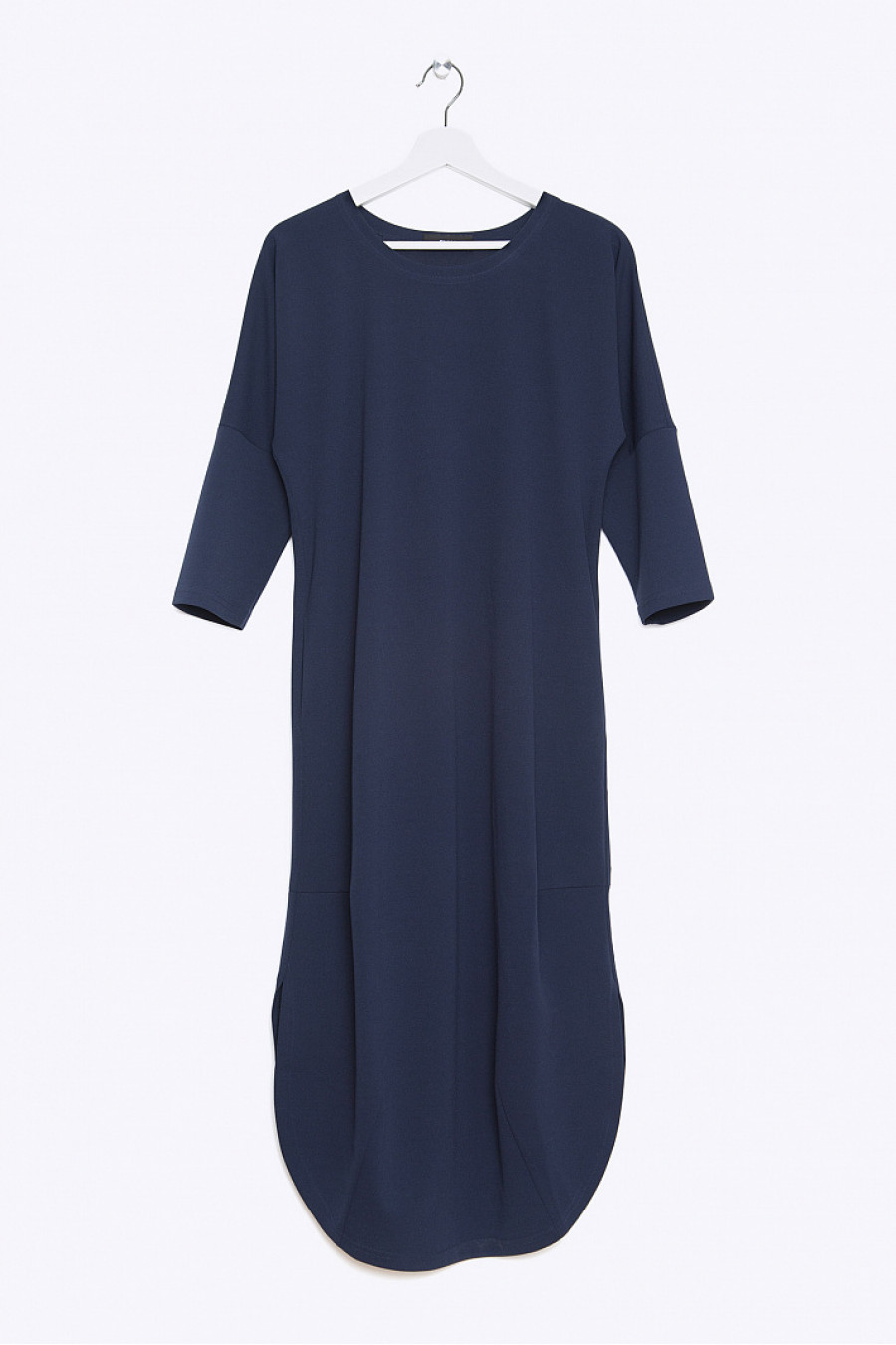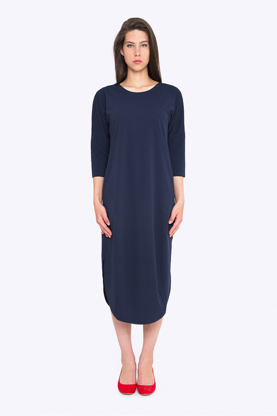 Платье миди свободного кроя, с разрезами по бокам. Ткань эластичная темно-синего цвета. В боковых швах есть функциональные карманы. Платье без подкладки. Модель хорошо сидит по фигуре,не сковывает движения. Стильное платье на каждый день. Рост фотомодели 178см.