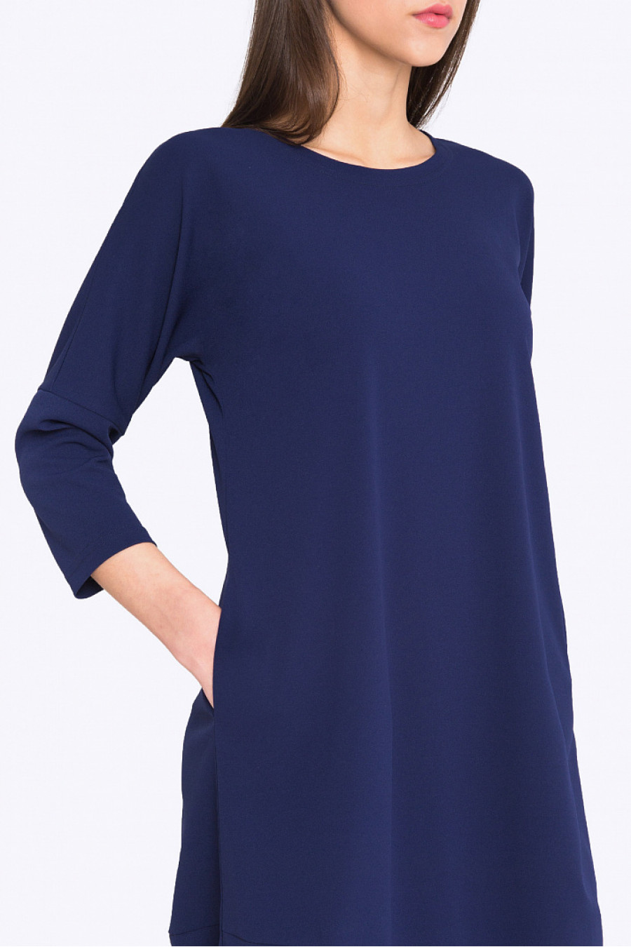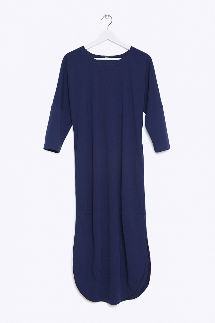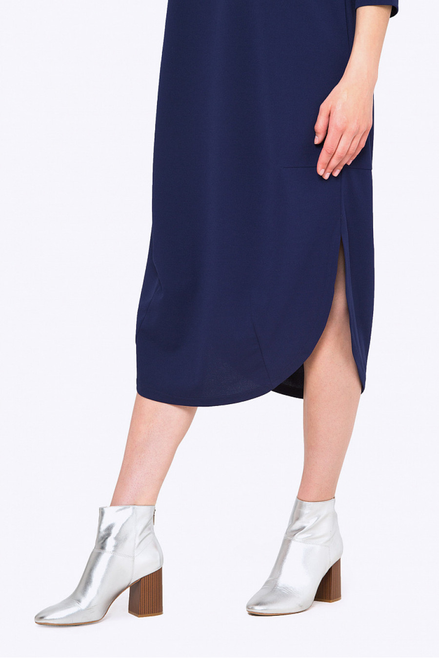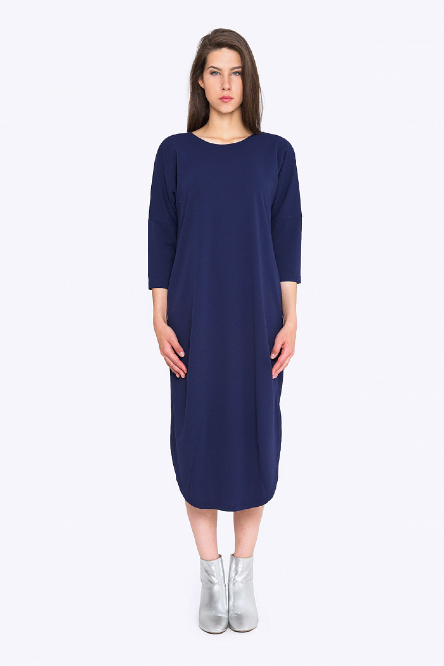 Платье миди свободного кроя, с разрезами по бокам. Ткань эластичная темно-синего цвета. В боковых швах есть функциональные карманы. Платье без подкладки. Модель хорошо сидит по фигуре,не сковывает движения. Стильное платье на каждый день. Рост фотомодели 178см.