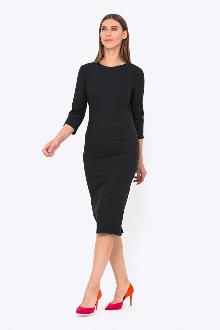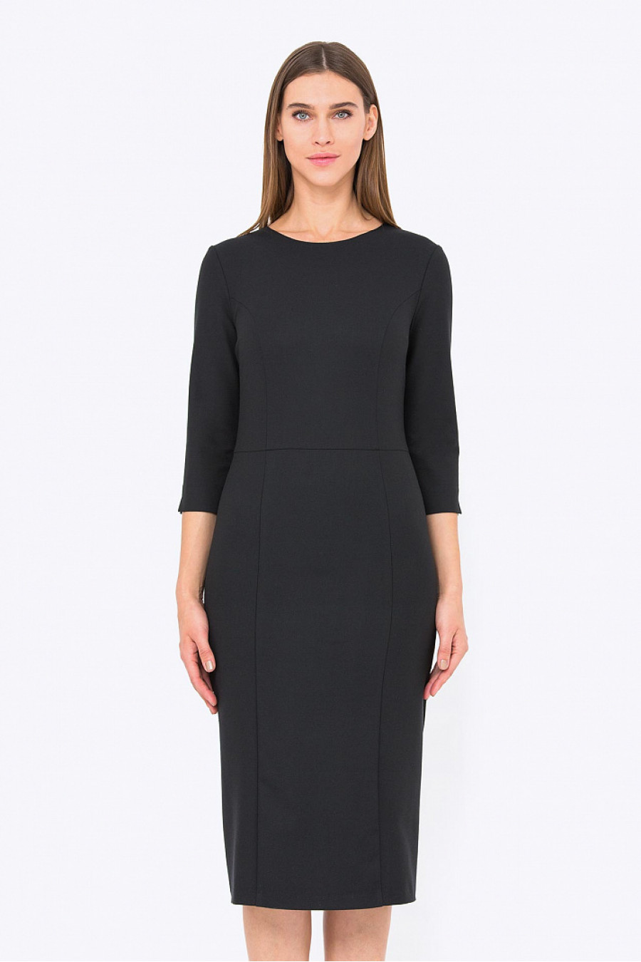 Платье-футляр. Ткань средней плотности, эластичная, черного цвета. Модель с подкладкой, рукава 3/4, сзади застежка-молния. Модель хорошо подойдет для женщин с фигурой типа песочные часы. Стильное платье на каждый день и на выход. Рост фотомодели 178см. Длина градируется от размера к размеру.