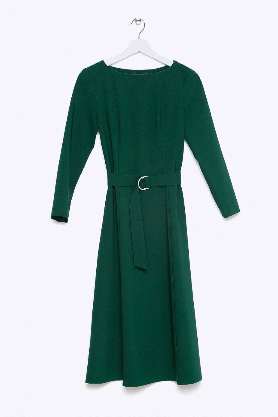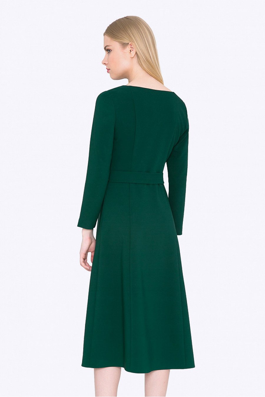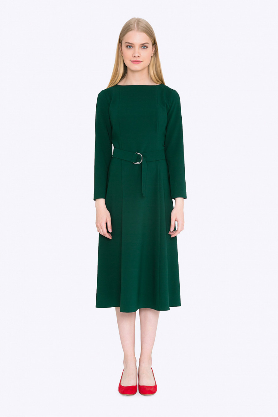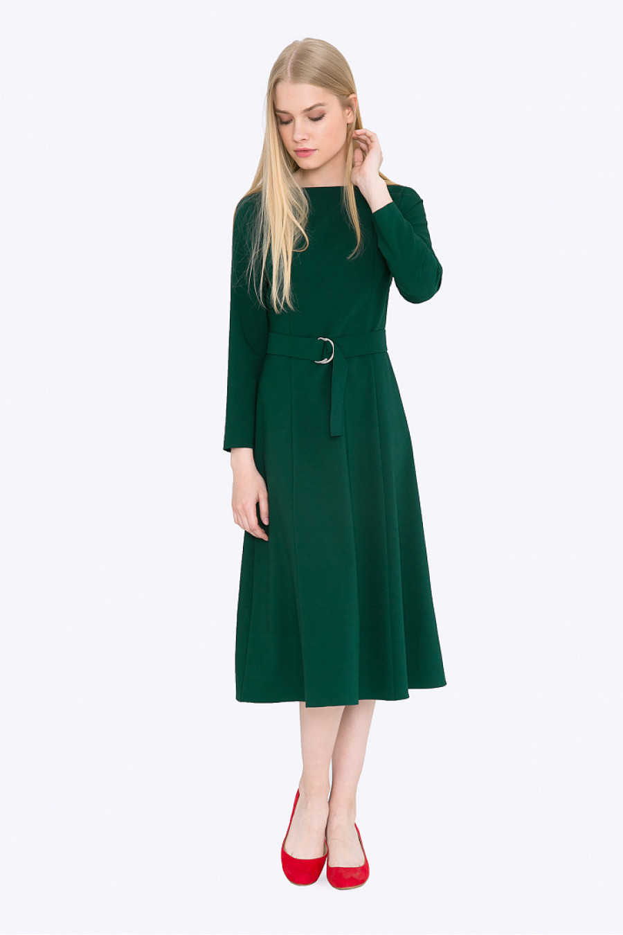 Платье-миди приталенного силуэта, расклешенное к низу. Ткань плотная. Без подкладки. Застежка-молния сбоку, в комплект входит тканевый пояс с пряжкой. Женственная элегантная модель, для офиса и на выход. Длина градируется от размера к размеру. Рост фотомодели 170см.