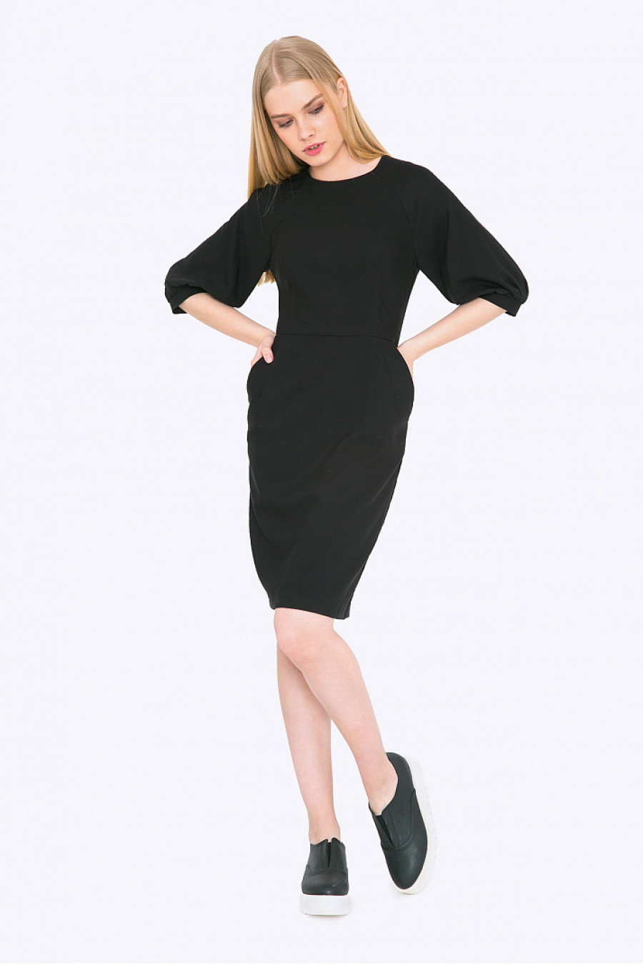 Платье - футляр с широкими рукавами. Ткань эластичная, средней плотности черного цвета. Застежка - молния на спинке, по бокам функциональные карманы. Есть подкладка. Модель красиво подчеркивает фигуру. Прекрасный выбор для офиса и праздничного мероприятия. Рост фотомодели 170 см.
