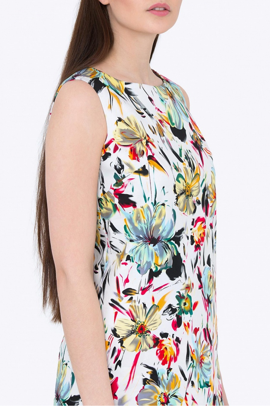 Платье прямого силуэта без рукавов. Ткань приятная, принт цветочный. Без подкладки.Стильное платье на каждый день, хорошо сочетается как с обувью на плоском ходу, так и с босоножками на высоком каблуке. Рост фотомодели 175см.