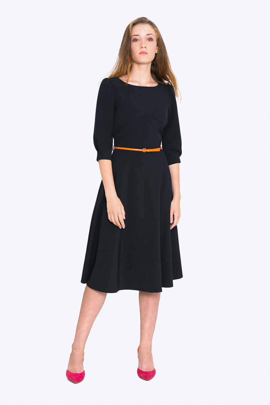 Женственное платье классического силуэта, который подчеркивает все достоинства фигуры. Ткань плотная синего цвета. Рукав 3/4 с легкими сборками по плечу, есть два элегантных кармана по бокам. На поясе есть шлевки, ремешок в комплект не входит. Платье отлично подойдет для повседневной носки, а с аксессуарами станет отличным выбором для романтического свидания. Рост фотомодели 173 см.