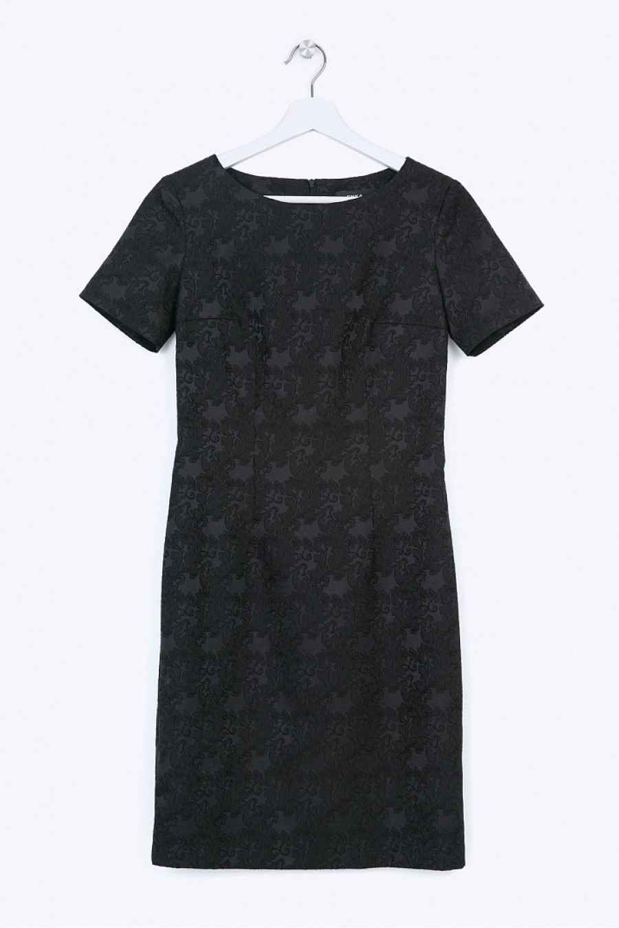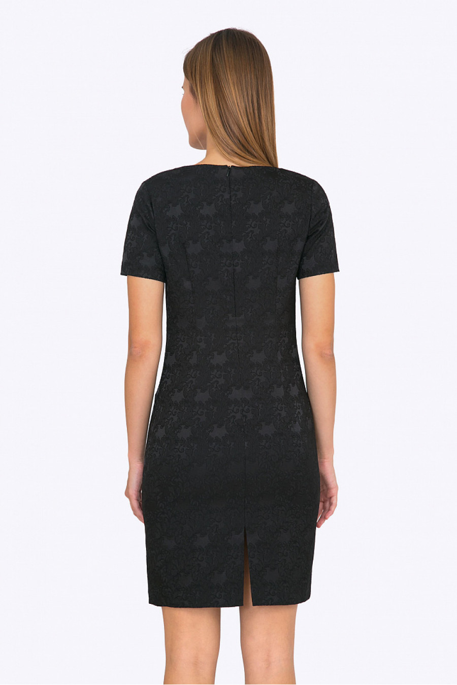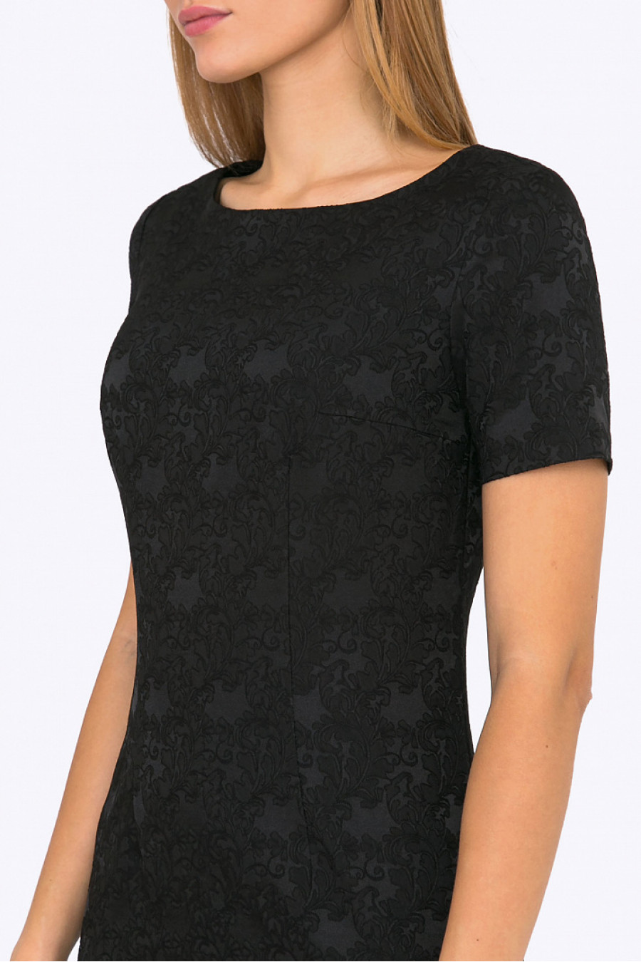 Приталенное платье мини. Ткань жаккардовая черного цвета. Модель хорошо сидит и выгодно подчеркивает привлекательные изгибы женской фигуры. Стильная модель для праздничного мероприятия. Без подкладки. Рост фотомодели 175 см.