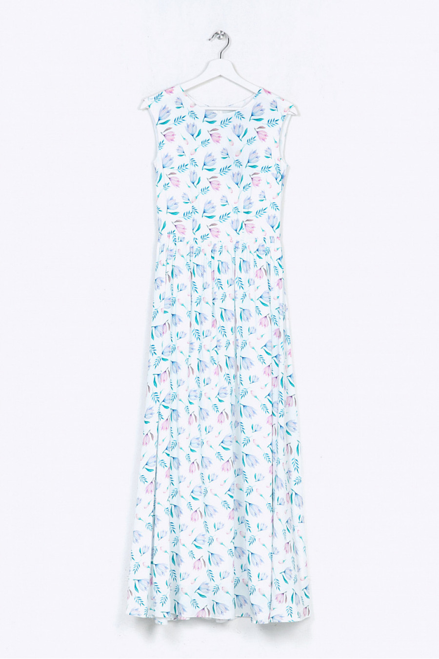 Длинное отрезное по линии талии платье с лифом без рукавов. Выполненоиз лёгкой дышащей вискозы белого цвета с нежным цветочным орнаментов в розовой,лиловой, голубой цветовой гамме. Юбка модели имеет расклешённый книзу свободный
