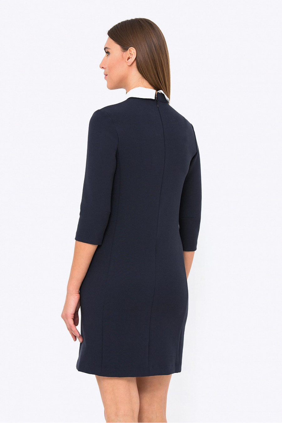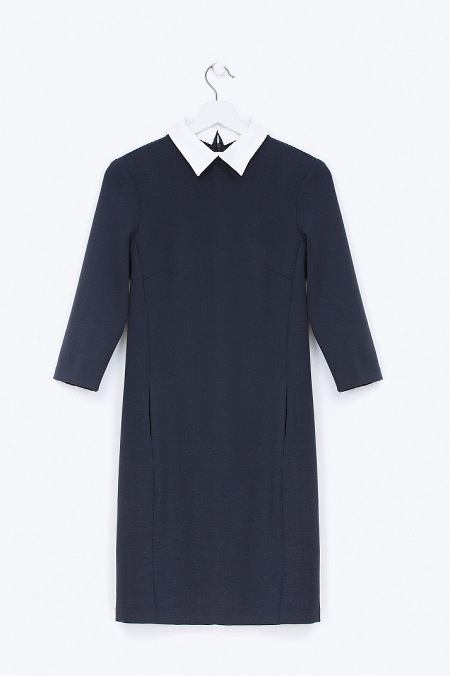 Стильное платье свободногосилуэта темно-синего цвета. Ткань плотная с эффектом эластичности. Без подкладки, рукав 3/4, на спинке застежка-молния. Аккуратный белый воротничок пристегивается на пуговицах. В боковых рельефах есть удобные функциональные кармашки. Замечательное офисное платье.Длина градируется от размера к размеру.
