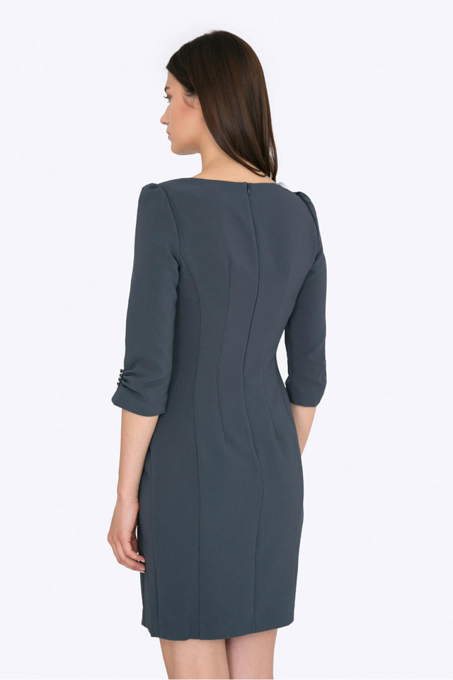 Изящное платье-футляр.Ткань плотная, эластичная, приятная на ощупь. Рукава 3/4, оформлены складками с декоративными пуговицами. Без подкладки. Благодаря вертикальным рельефам платье стройнит, подчеркивает привлекательные изгибы женской фигуры. Отличный вариант для офиса или вечеринки. Рост фотомодели 178см.
