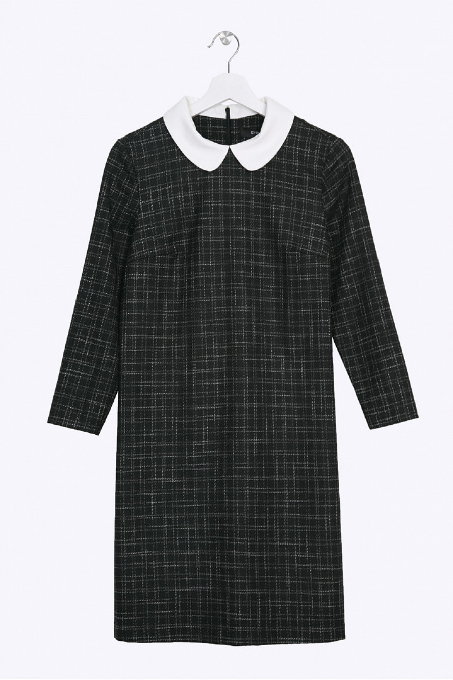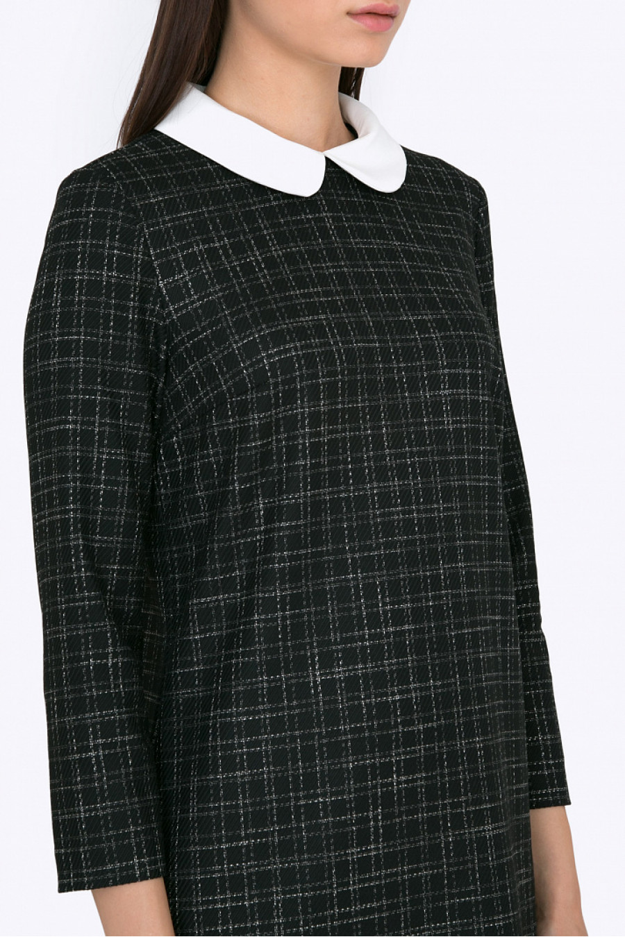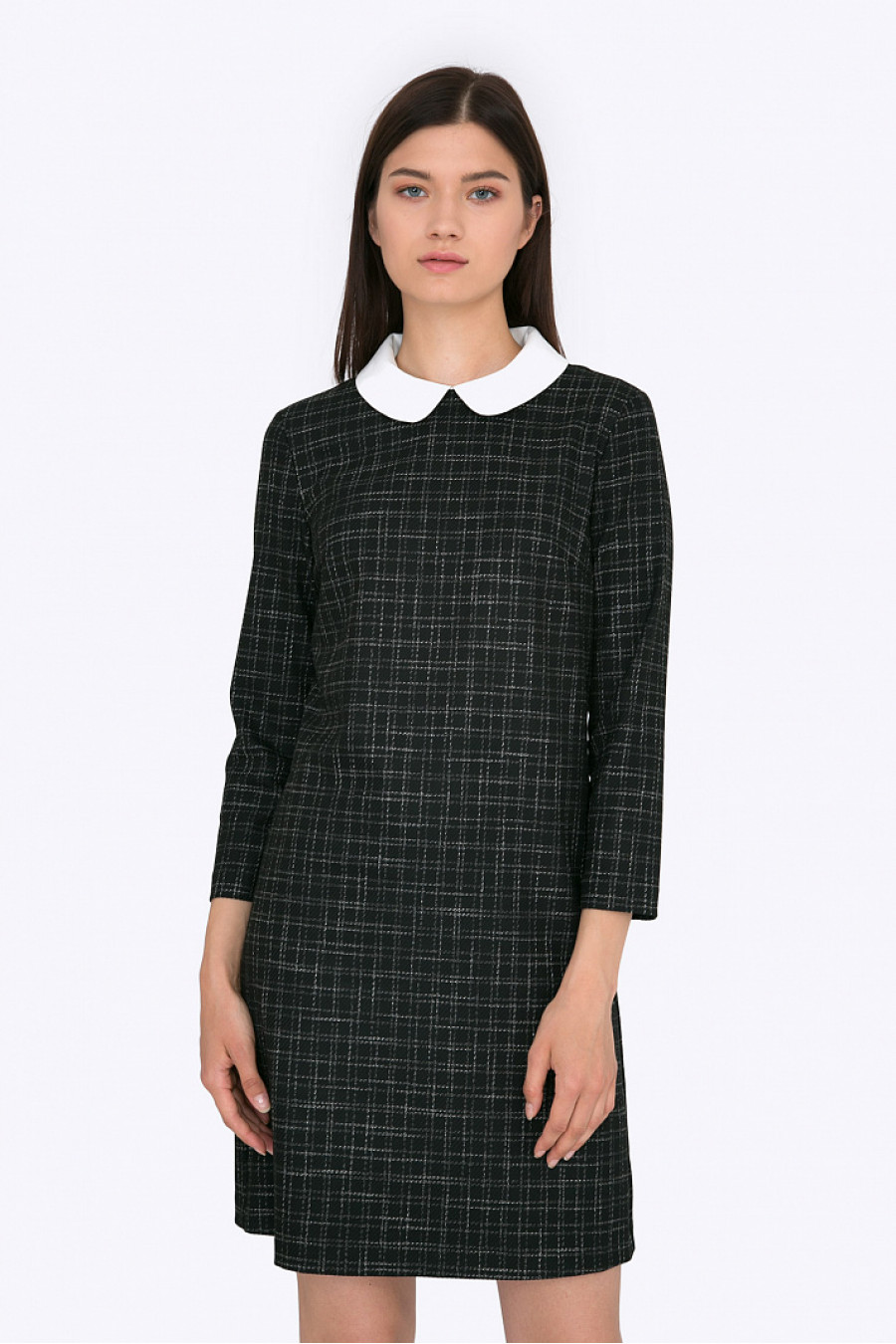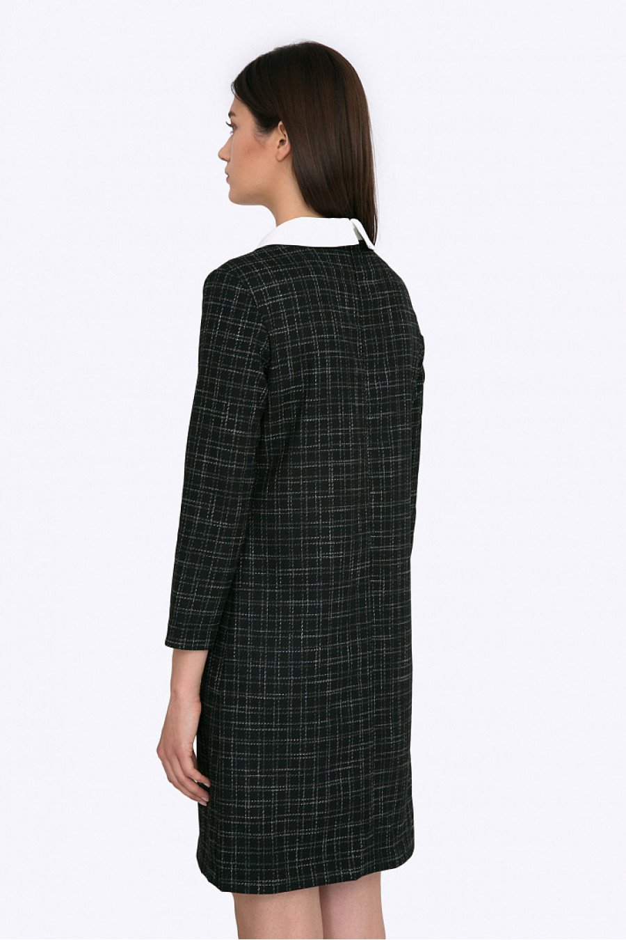 Теплое платье в клетку прямого кроя. Ткань приятная к телу. Без подкладки. Благодаря закругленному белому воротнику платье смотрится очень стильно. Модель визуально стройнит и хорошо сидит по фигуре. Длина градируется от размера к размеру: 42 размер - 90 см, 54 размер - 94 см. Рост фотомодели 178см.