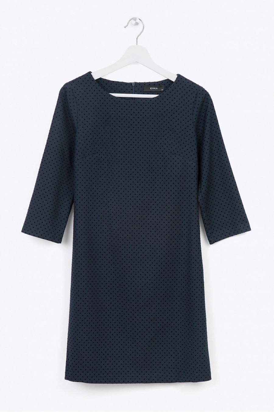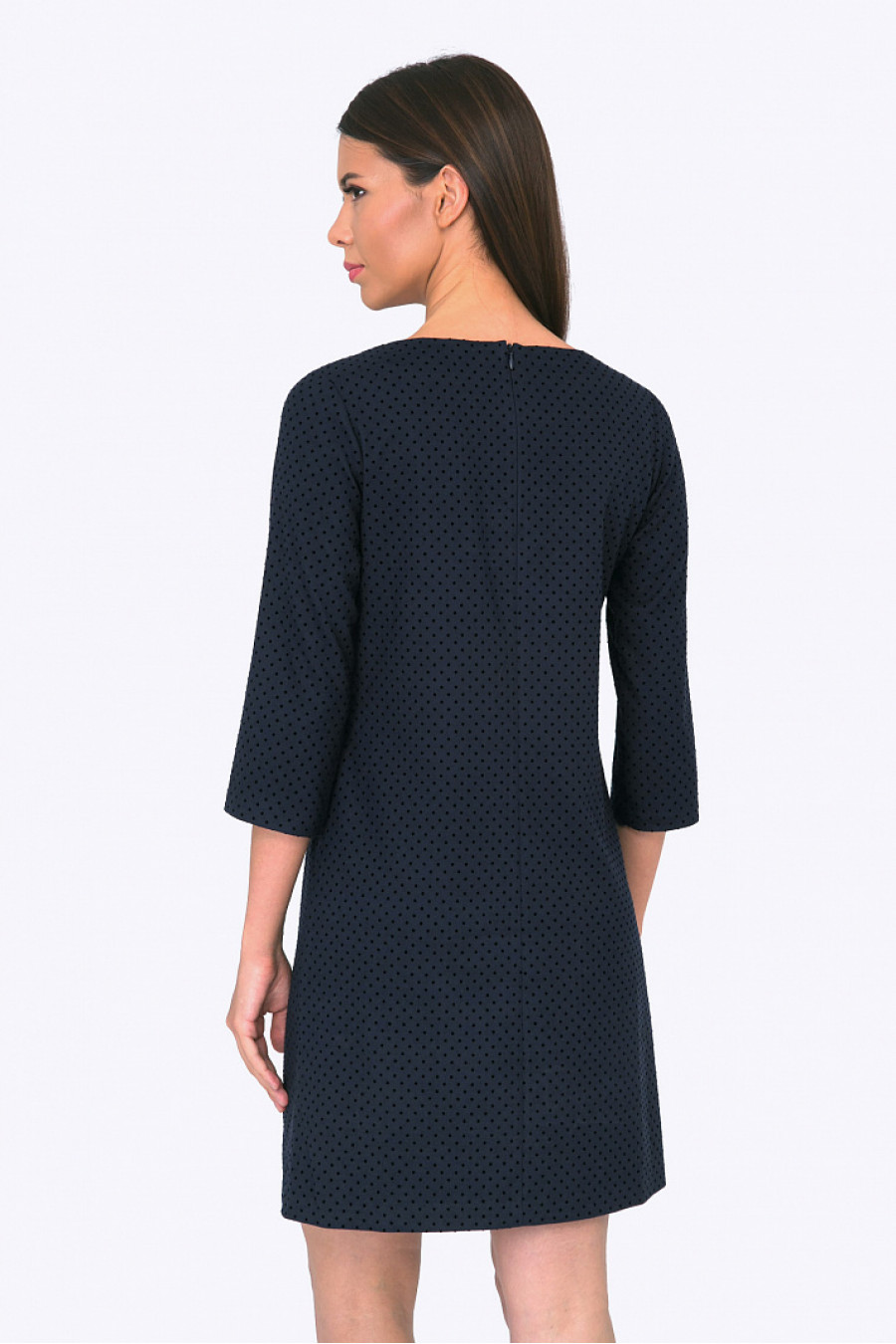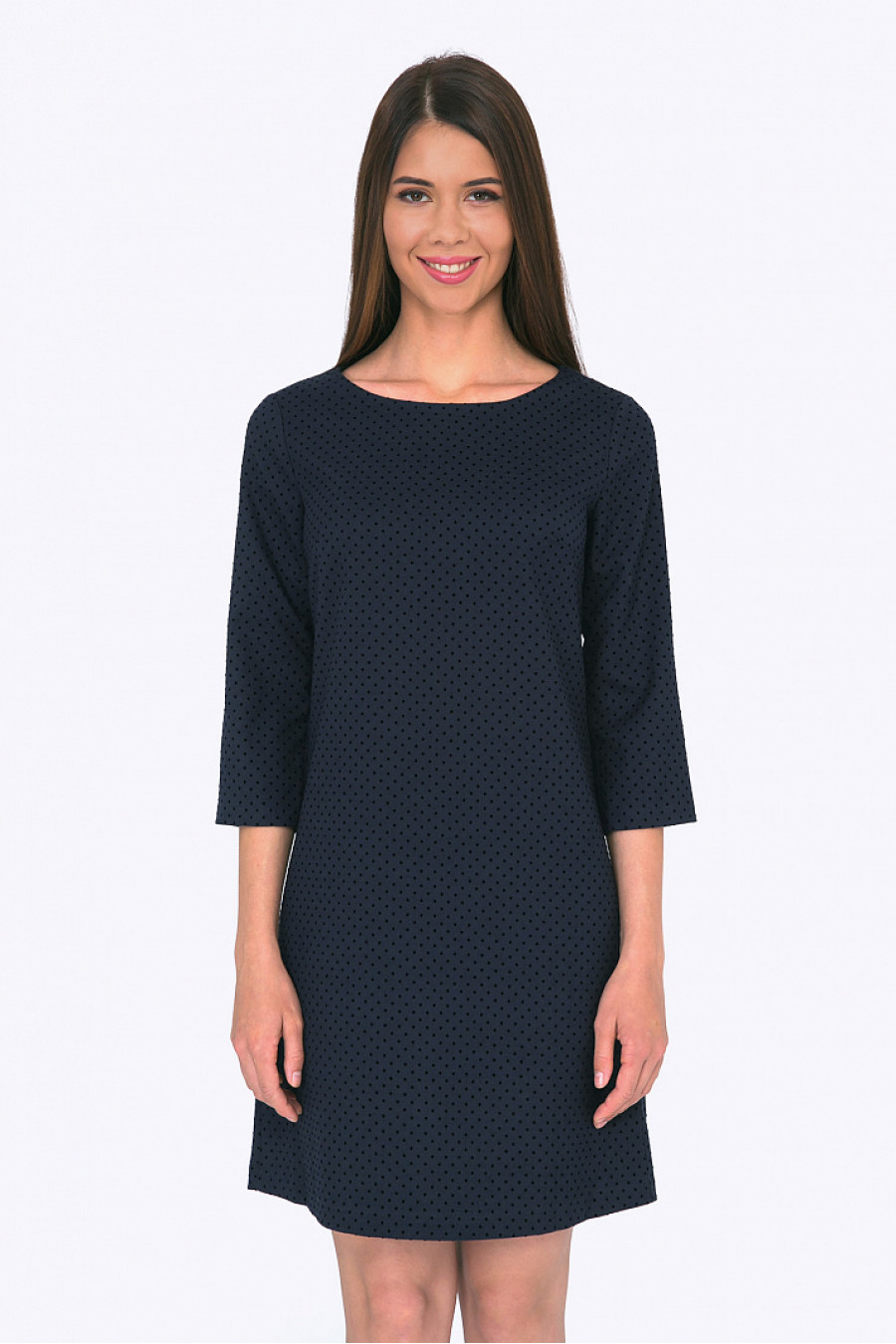 Элегантное платье прямого кроя. Ткань средней плотности в горох. Рукава 3/4, без подкладки. Очень комфортная и неприхотливая модель, хорошо подойдет на каждый день и для офиса.