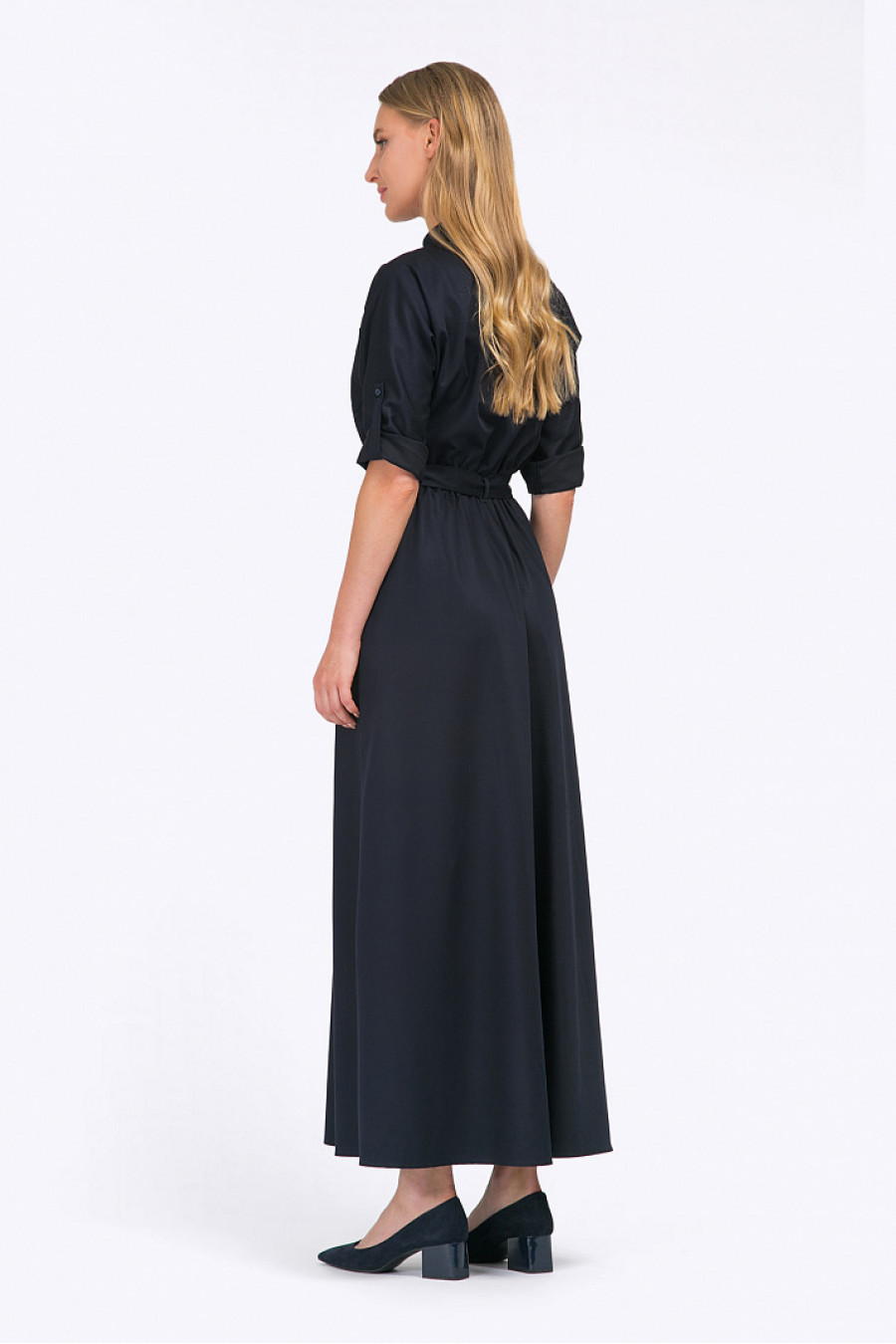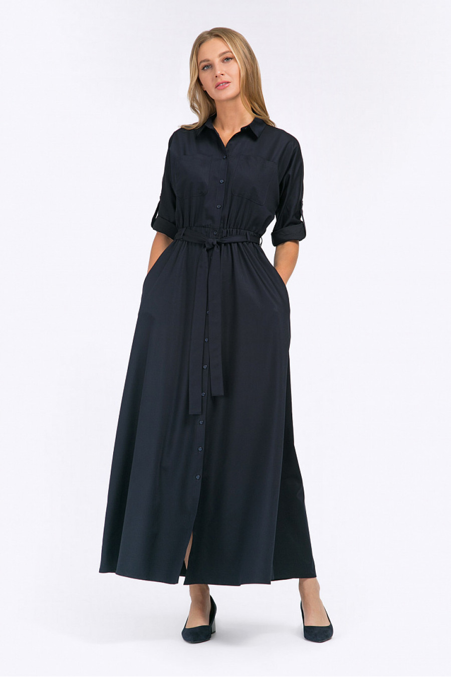 Сафари-стиль по прежнему - на гребне волны в этом сезоне. Трендовое платье-макси темно-синегоцвета - отличный выбор для создания актуального, энергичного look-а. Традиционные для фасона накладные карманы, рукава с подворотом, рубашечный воротничок - подчеркнут энергичность образа, а длинный расклешенный подол, собранный эстетичными складками на поясе - создаст женственный мотив. Платье будет идеально смотреться на шатенках и золотоволосых. Плотная ткань стильного плетения деним комфортна в носке и проста в уходе. Рост фотомодели 176 см.