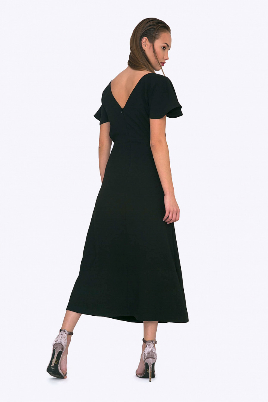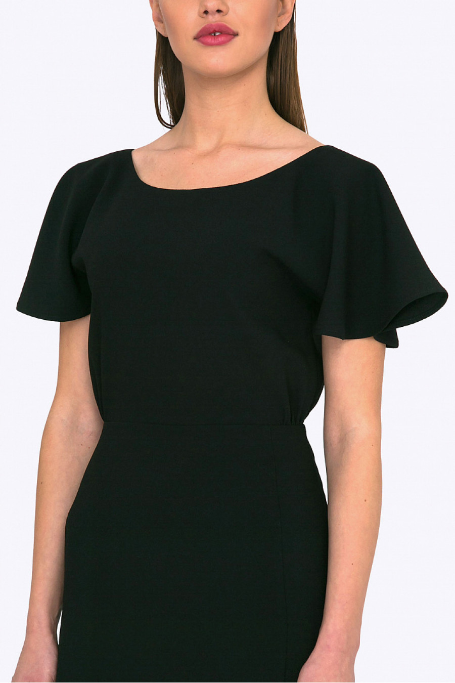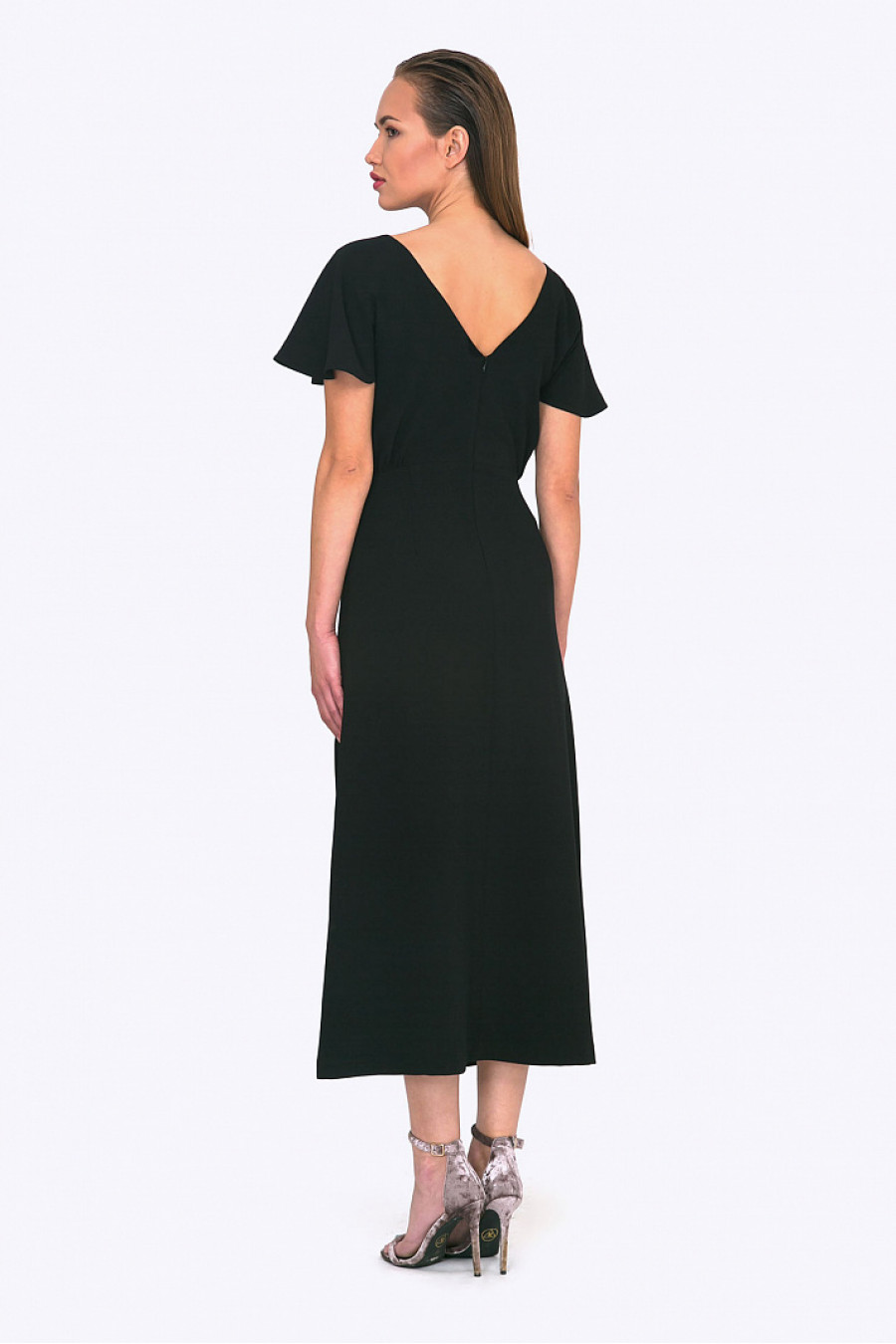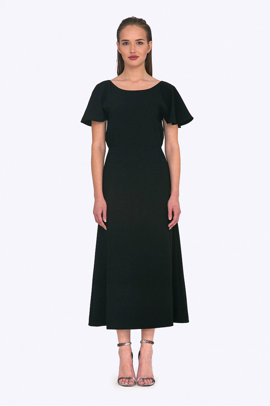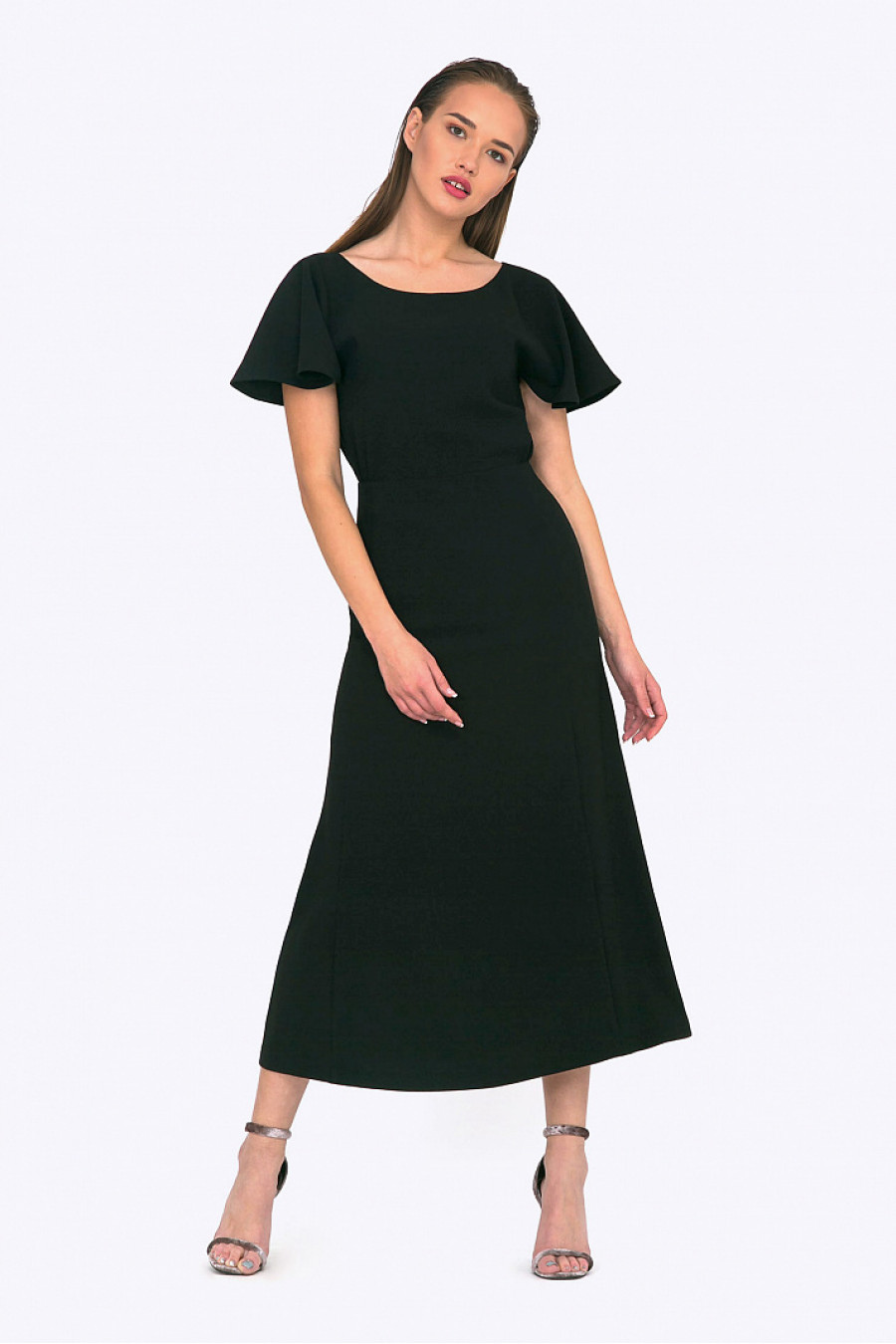 Нарядное платье с вырезом на спинке. Модель приталенного кроя со сборкой на талии. Короткий, расклешенный от плеча рукав с волнистым краем. Есть подкладка. Элегантное платье для торжественного мероприятия. Рост фотомодели 174 см.