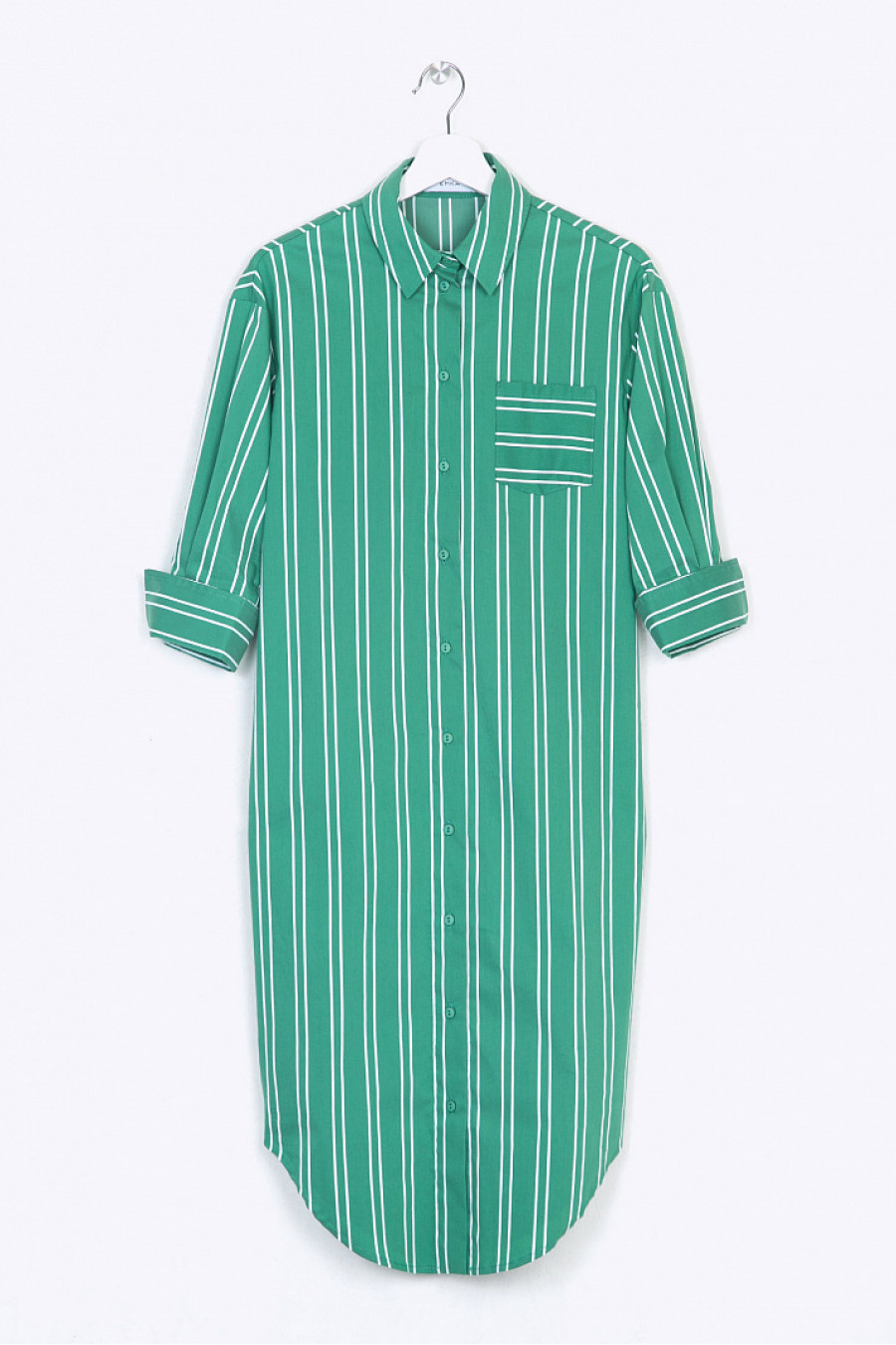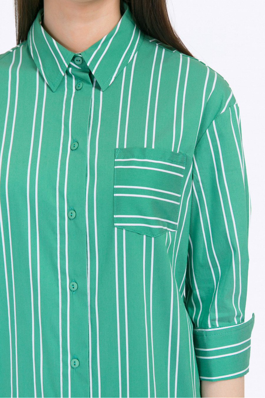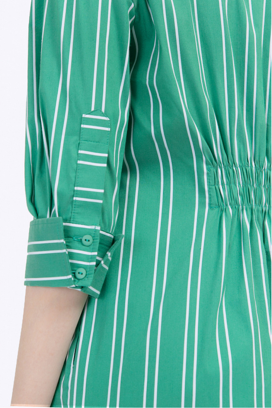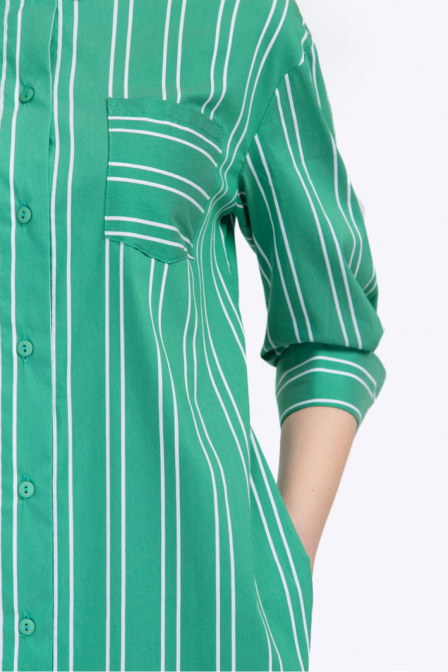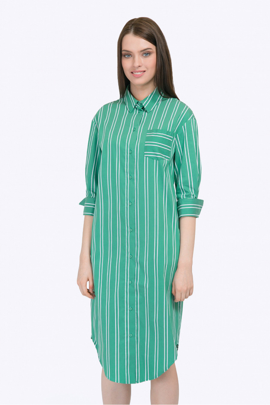 Удлинённое платье-рубаха с фигурным подолом и рукавами ¾. Выполнено из габардина зеленого цвета с геометрическим принтом «в полоску». Модель несёт все конструктивные элементы офисной рубашки – жёсткий отложной воротник, спереди имеются лаконичная застёжка на пуговичках и небольшой кармашек. Рукава декорированы манжетами с отворотами, спинка на линии талии присобрана на широкую резинку. Рост фотомодели 176 см.