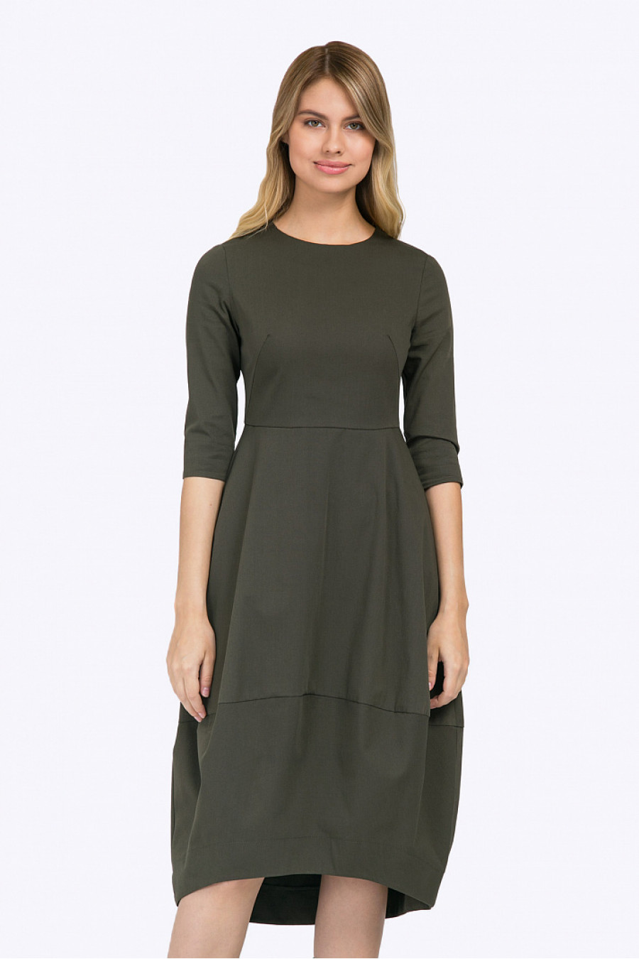 Платье цвета хаки с рукавами ¾. Выполнено из эластичного костюмногополотна с преобладанием натуральных волокон. Лиф модели облегающего силуэта,круглый вырез горловины сзади застёгивается на длинную молнию. Юбка «баллон»средней длины имеет фигурный подол и боковые карманы. Рост фотомодели 177 см.