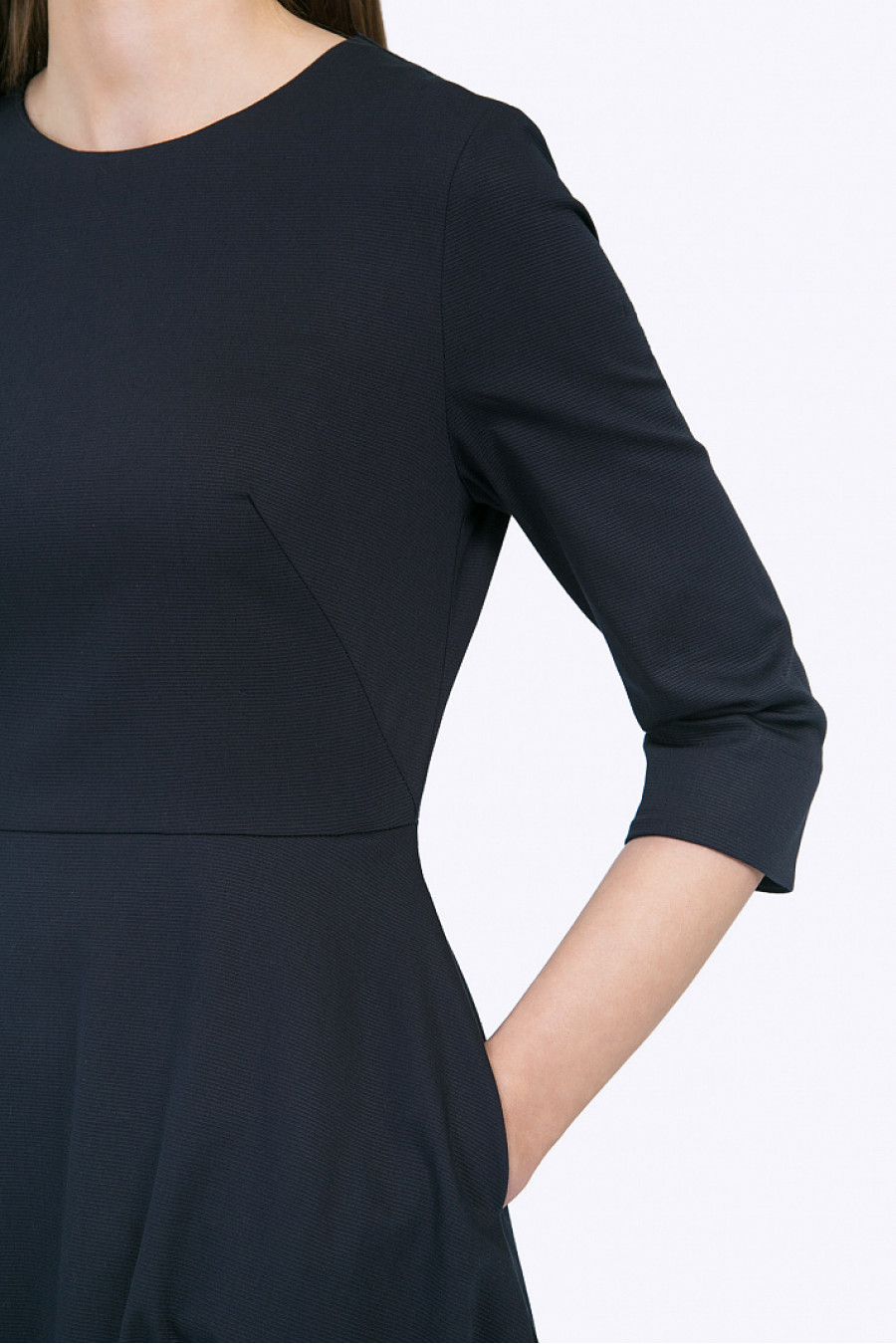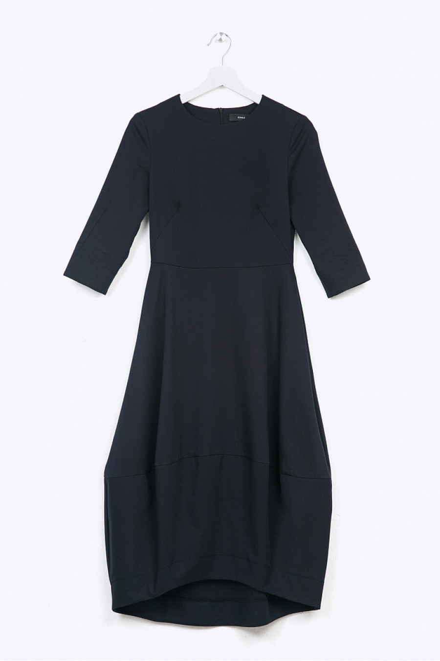 Отрезное по линии талии тёмно-синее платье с юбкой-баллоном и рукавами, чуть прикрывающими локти. Основной акцент модели делается на оригинально выполненной юбке с боковыми карманами, которую уравновешивает лаконично скроенный лиф с небольшими диагональными вытачками и скрытой молнией сзади.Выполнено из ткани, содержащей натуральные волокна.Модель без подкладки. Рост фотомодели 176 см. Маломерит на размер.