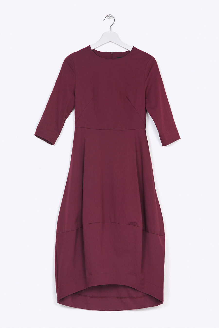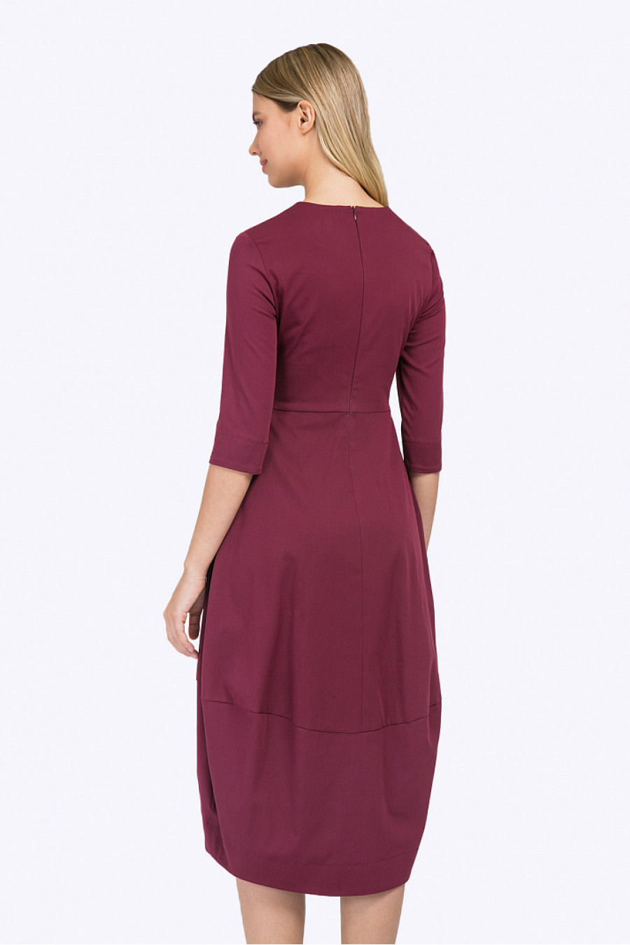 Отрезное по линии талии платье-миди глубокого бардового цвета. Модельимеет облегающий лиф с диагональными вытачками, узкими рукавами ¾ и круглымвырезом горловины, застёгивающимся на длинную молнию. Юбка «баллон» с подоломразной длины дополнена карманами в боковых швах. Рост фотомодели 177 см.