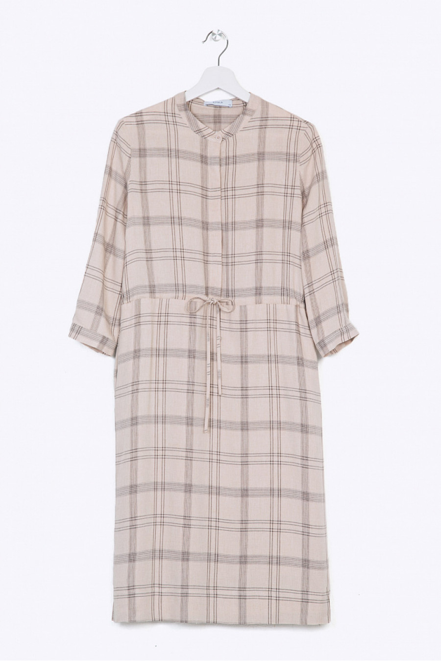 Платье прямого силуэта на кулиске в области талии. Модель имеет маленький воротник-стойку, скрытую застёжку, карманы в боковых швах. Рукава ¾ оформлены манжетами. Подол с боков декорирован небольшими разрезами. Платье выполнено из вискозы тёплого бежевого оттенка в крупную коричневую клетку. Рост фотомодели 177 см.