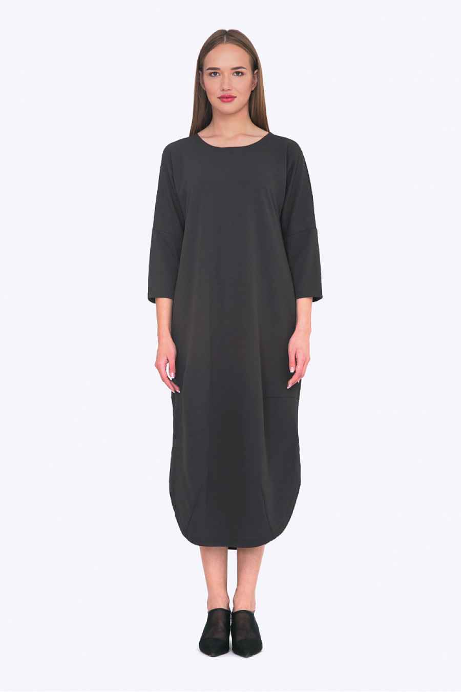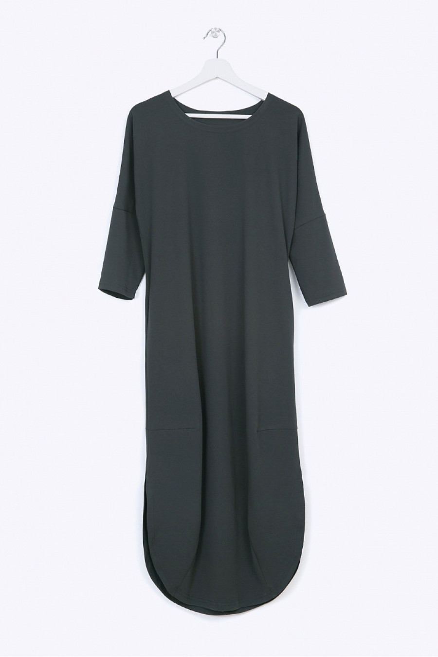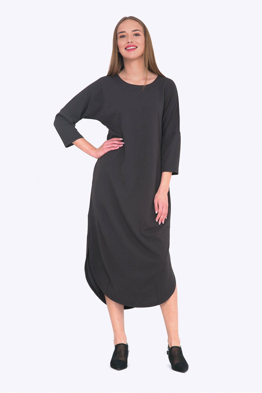 Платье миди свободного кроя с разрезами по бокам. Ткань эластичная темно-серого цвета. В боковых швах есть функциональные карманы. Платье без подкладки. Модель хорошо сидит по фигуре, не сковывает движения. Стильное платье на каждый день. Рост фотомодели 174 см.