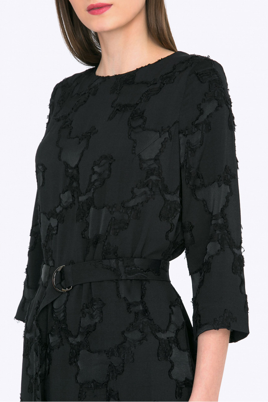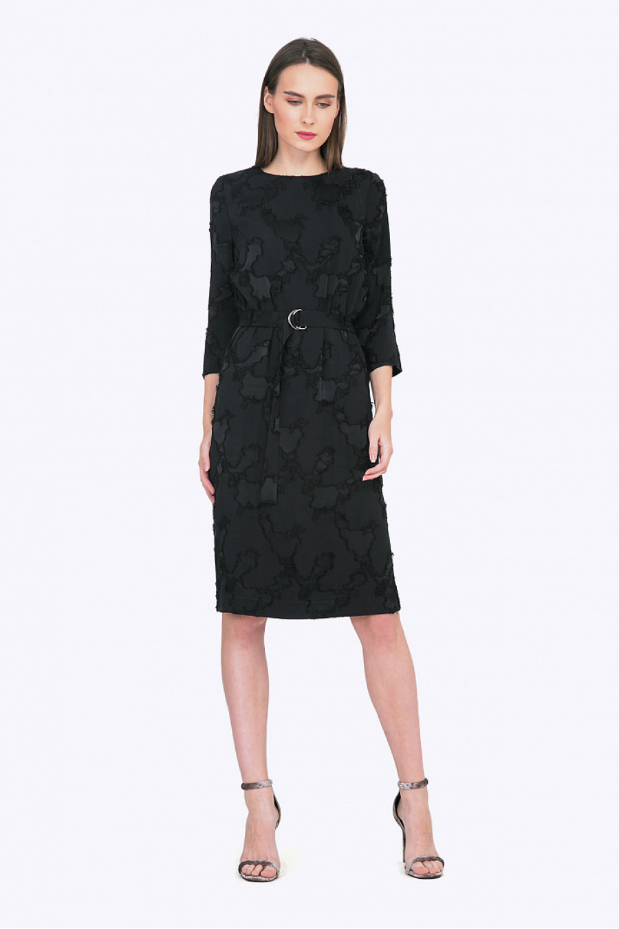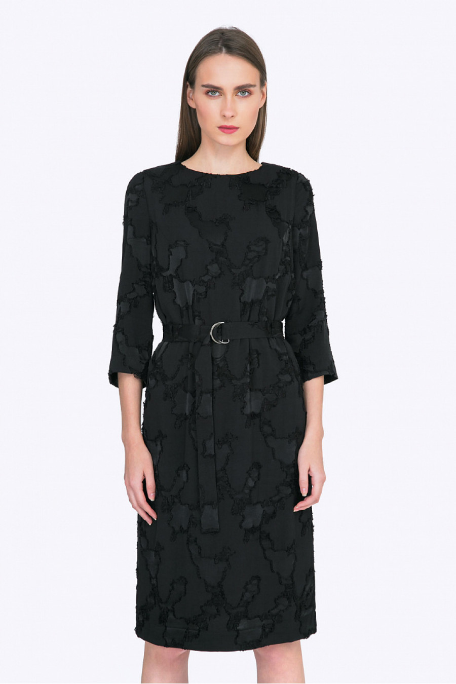 Нарядное платье прямого кроя с поясом.Ткань с рваным эффектом. Есть подкладка. Платье хорошо сидит по фигуре, зрительно вытягивая силуэт, выглядит очень элегантно и стильно. Прекрасный выбор для праздничного мероприятия. Рост фотомодели 177 см.
