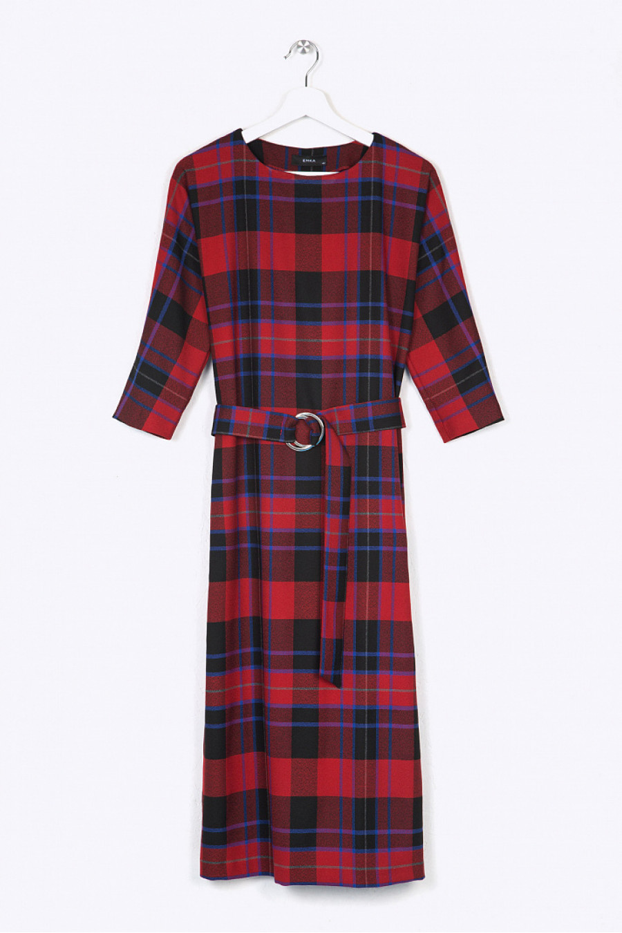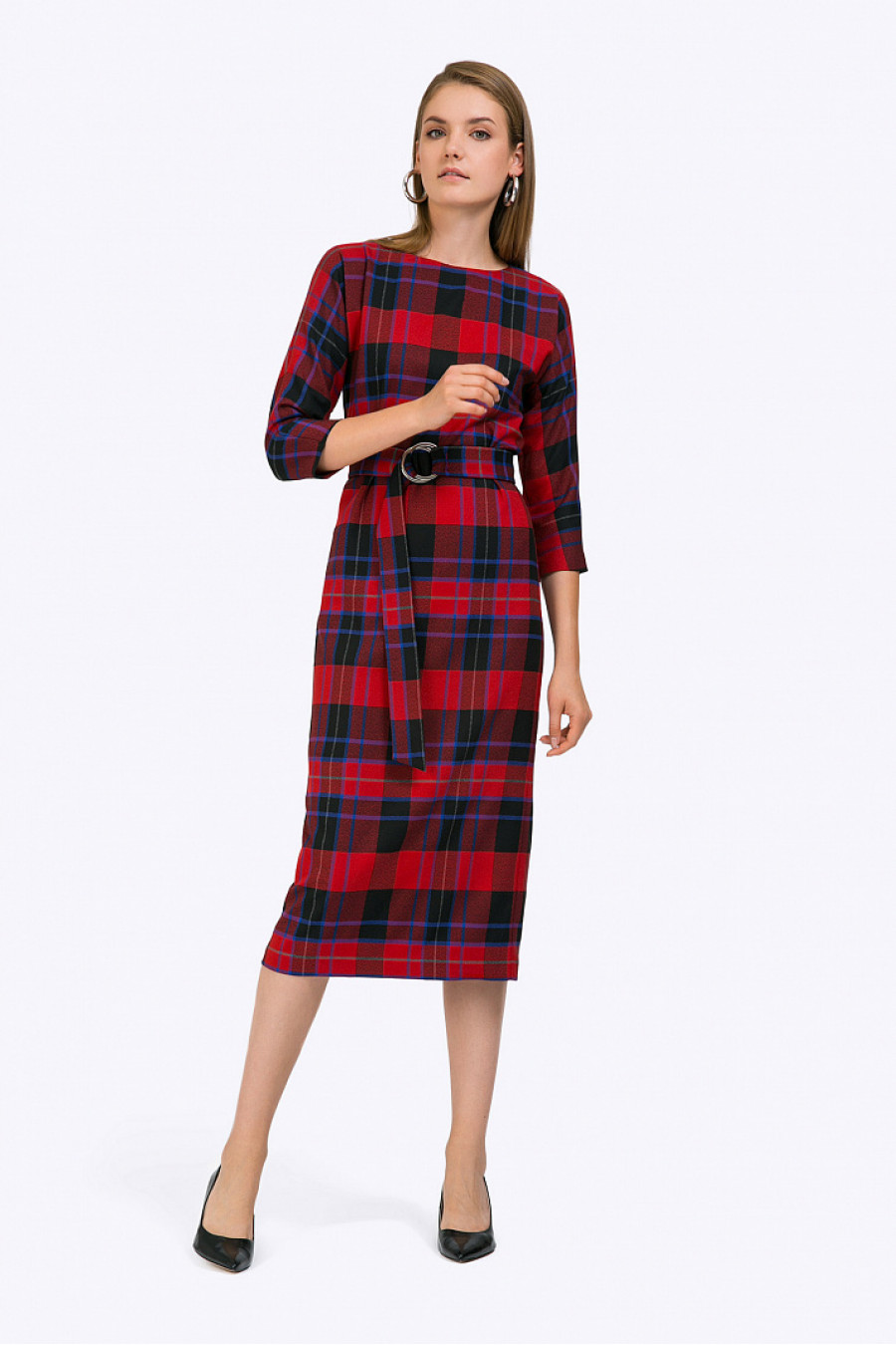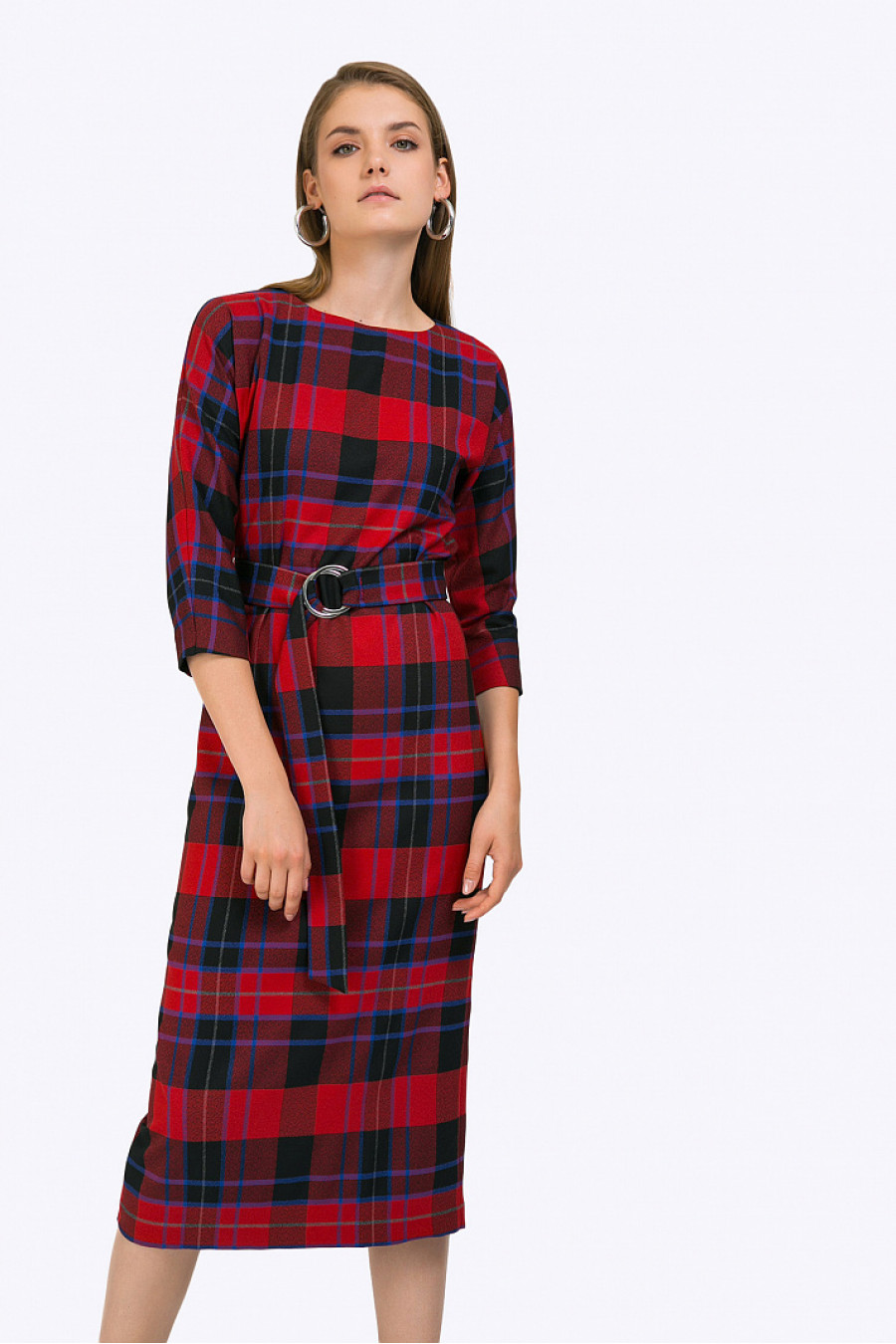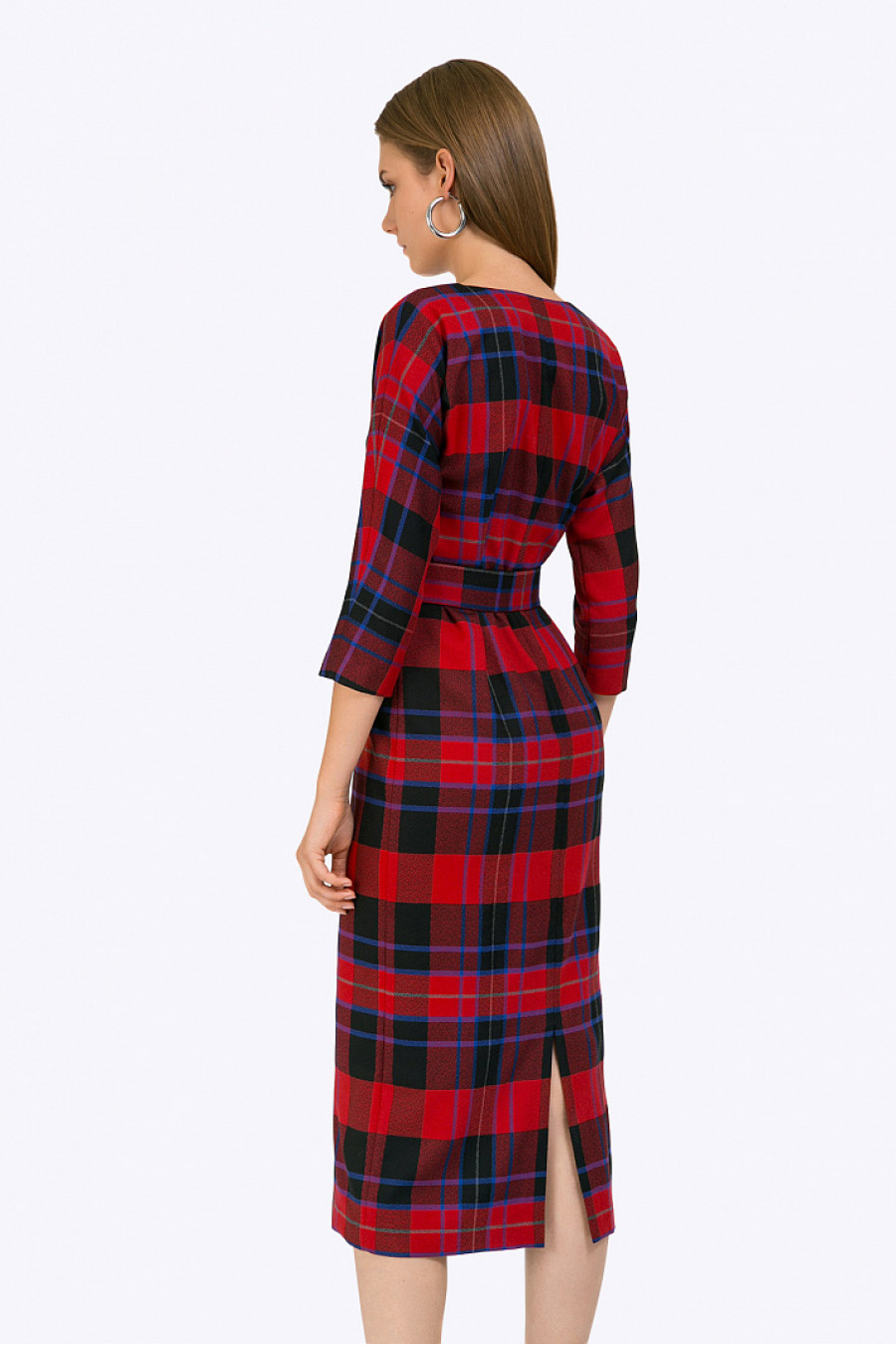 Платье-миди в крупную клетку, сочетающую тёплую и холодную цветовуюгамму. Модель прямого силуэта, свободно облегает фигуру. Имеет классический круглыйвырез горловины, цельнокроеные рукава ¾. Линия талии подчёркнута широким поясом скрупными кольцами, на спинке в срединном шве расположен разрез. Рост фотомодели 177 см.