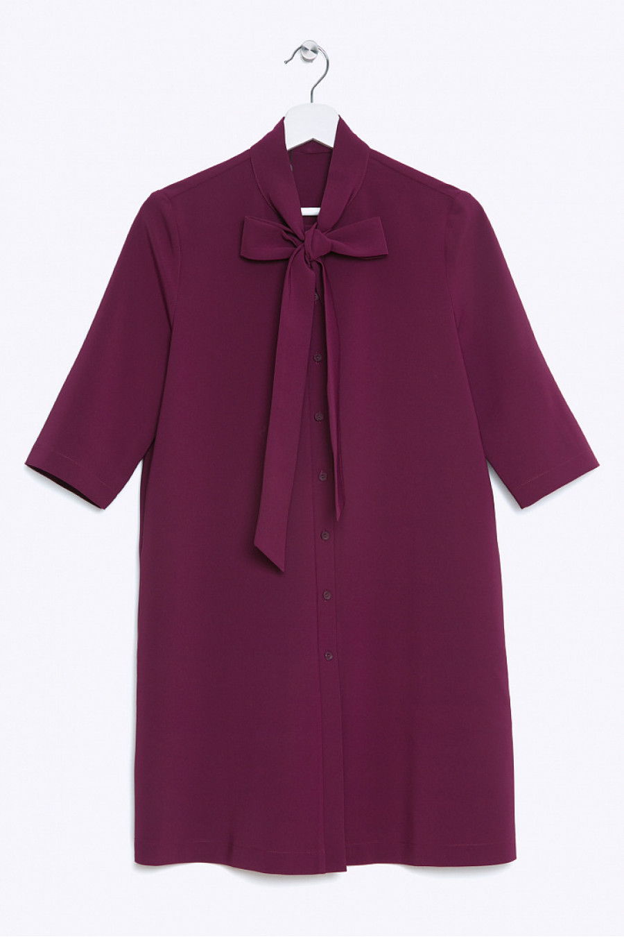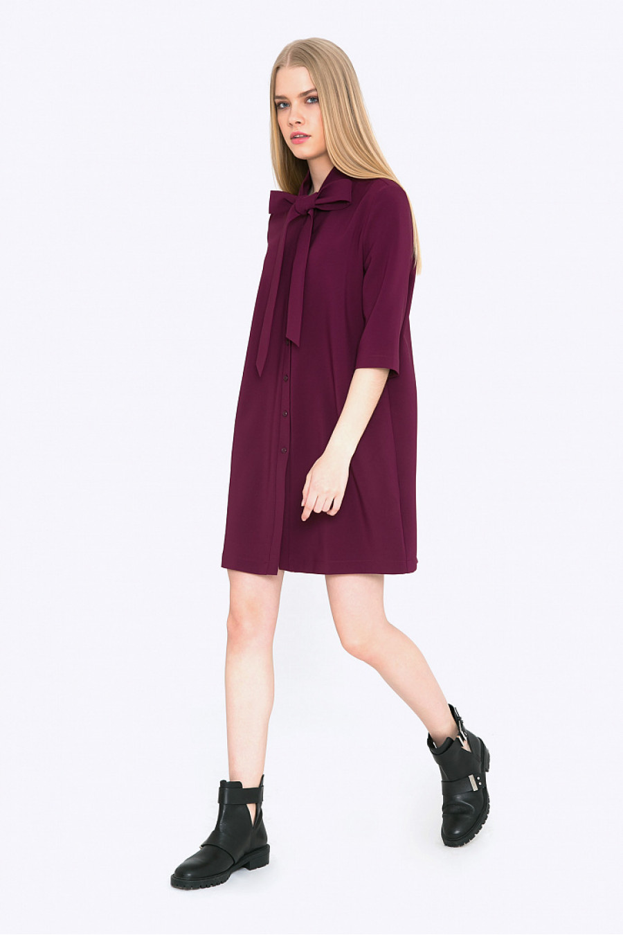 Стильное платье прямого кроя с бантом. Модель с рукавами 3/4, застежка на пуговицы. Ткань плотная темно-лилового цвета. Без подкладки. Платье хорошо сидит, не сковывает движения. Стильная и комфортная модель на каждый день. Рост фотомодели 170 см.