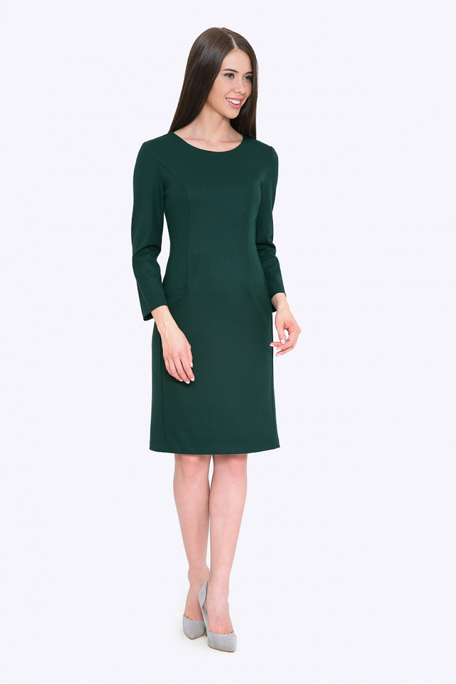 Приталенное платье зеленогоцвета с округлой горловиной. Ткань плотная приятная на ощупь. Элегантная модель приталенного силуэта, хорошо сидит и стройнит силуэт. Подойдет как для работы, так и на выход. Рост фотомодели 172см. Естьподкладка. Длина градируется от размера к размеру.