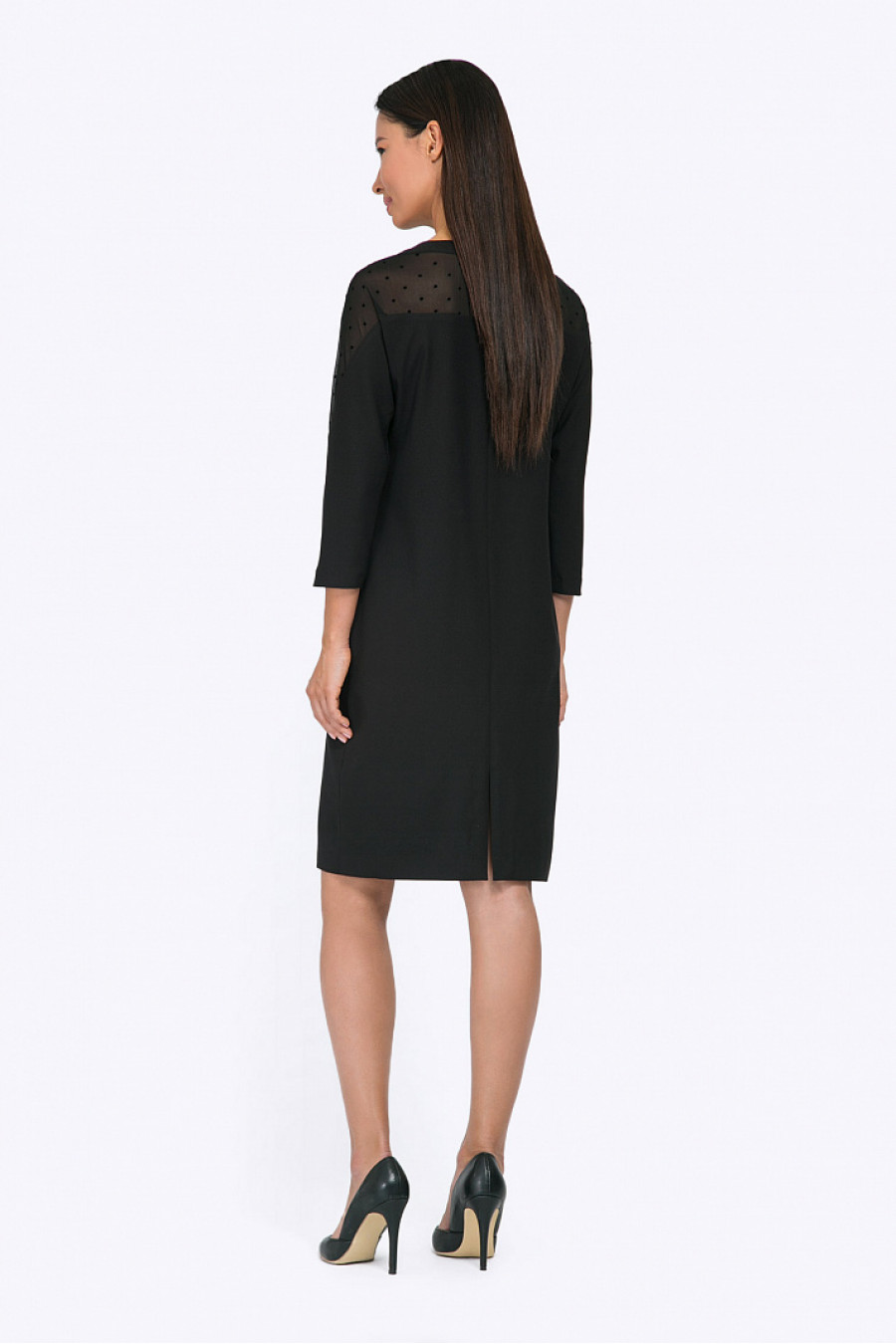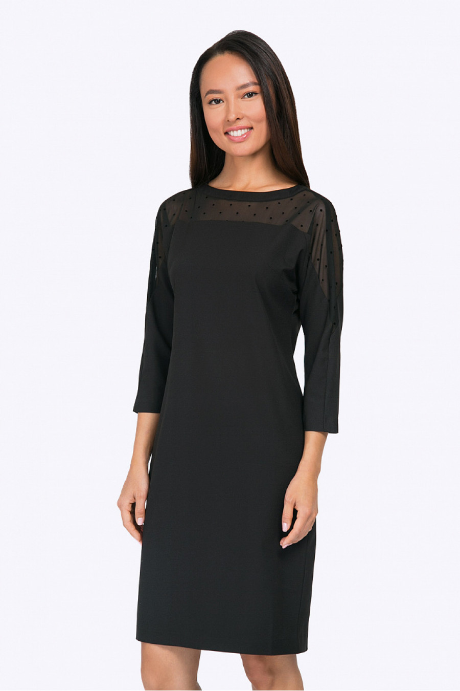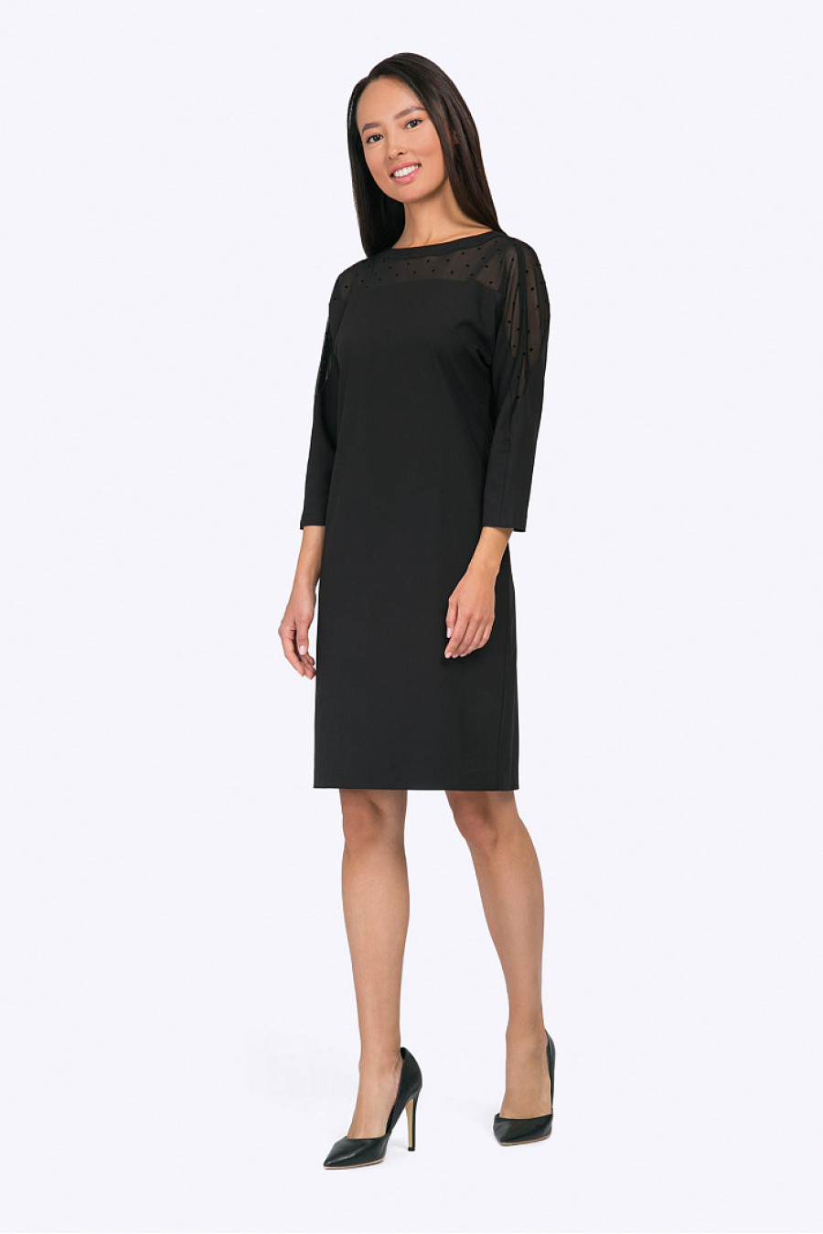 Маленькое чёрное платье с рукавами ¾. Модель имеет прямой силуэт исвободно облегает фигуру. Строгость линий и цвета смягчает интересное конструктивноерешение верхней части изделия из прозрачной в мелкую мушку ткани, выполненной в