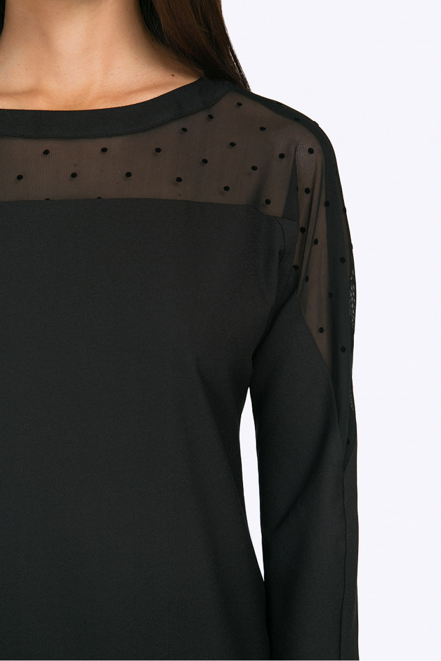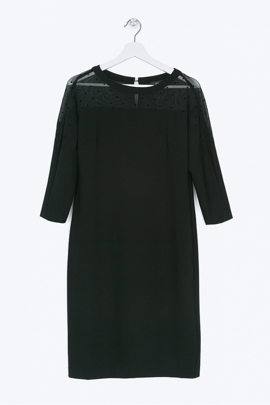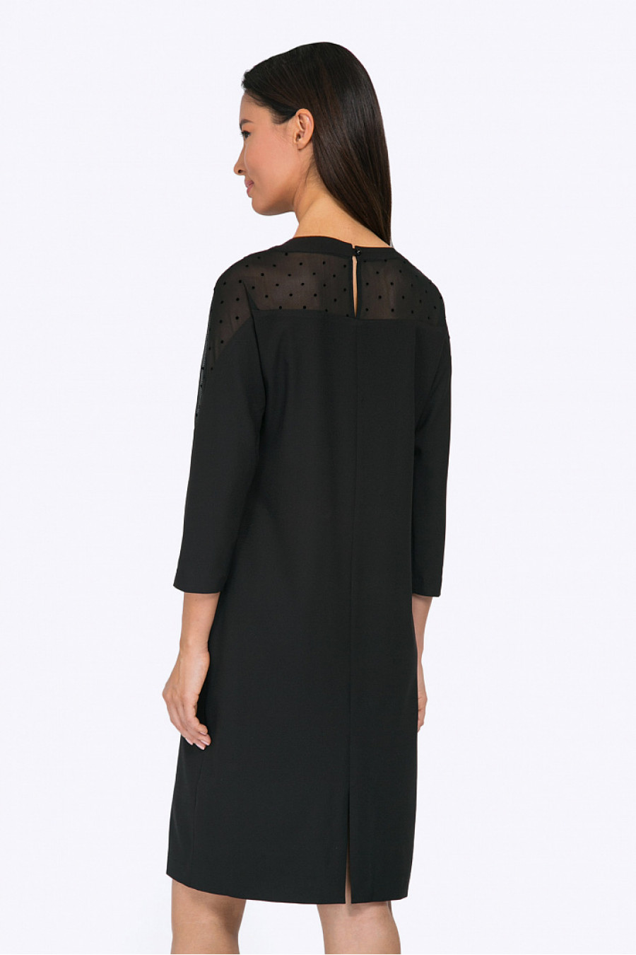 Маленькое чёрное платье с рукавами ¾. Модель имеет прямой силуэт исвободно облегает фигуру. Строгость линий и цвета смягчает интересное конструктивноерешение верхней части изделия из прозрачной в мелкую мушку ткани, выполненной в