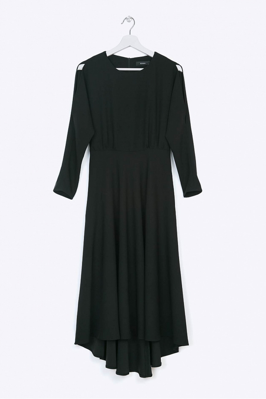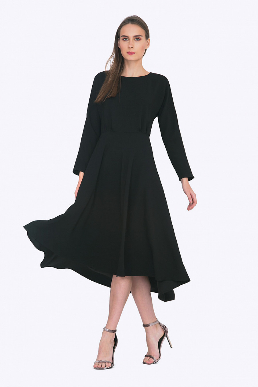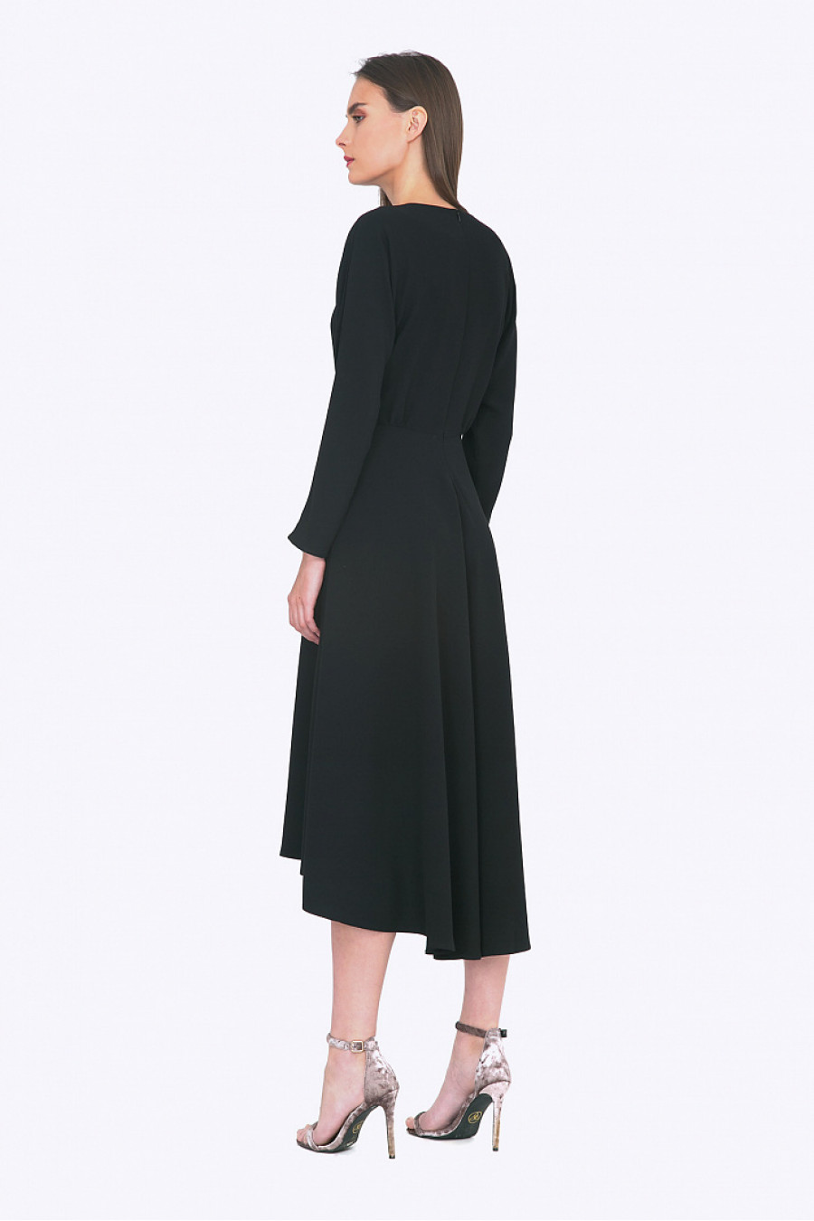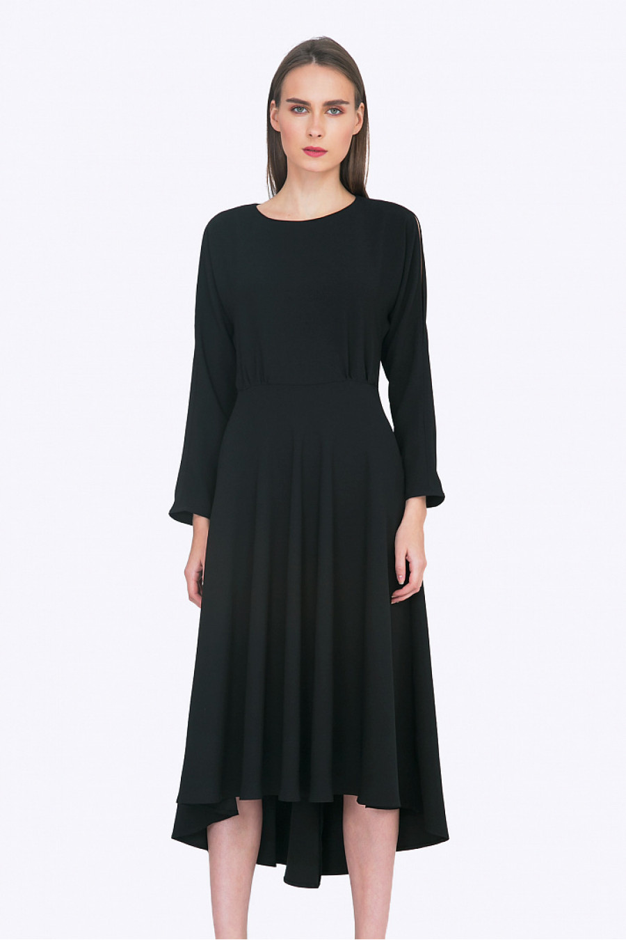Платье приталенного кроя с асимметричным низом. Цельнокроеные рукава с разрезами. Ткань средней плотности. Модель без подкладки.Стильное женственное платье на каждый день и для праздничного мероприятия. Рост фотомодели 177см.