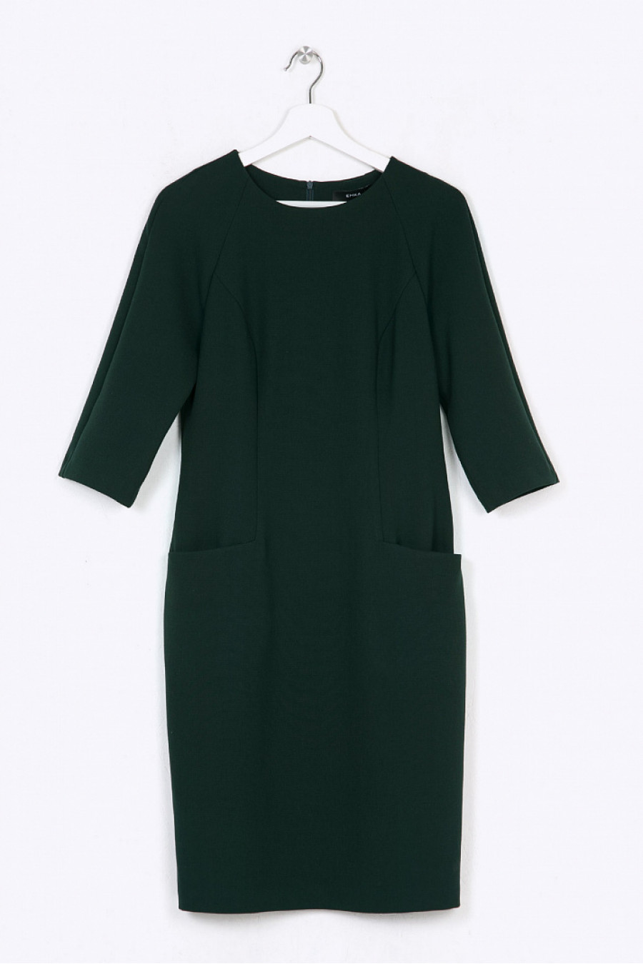Тёмно-зелёное платье из плотной ткани, в деловом стиле. Модельимеет полуприталенный силуэт, спереди рельефы с подрезнымикарманами, на спинке длинную застёжку-молнию и небольшую шлицу,круглый вырез горловины. Рукава-реглан имеют длину ¾. Рост фотомодели 177 см.