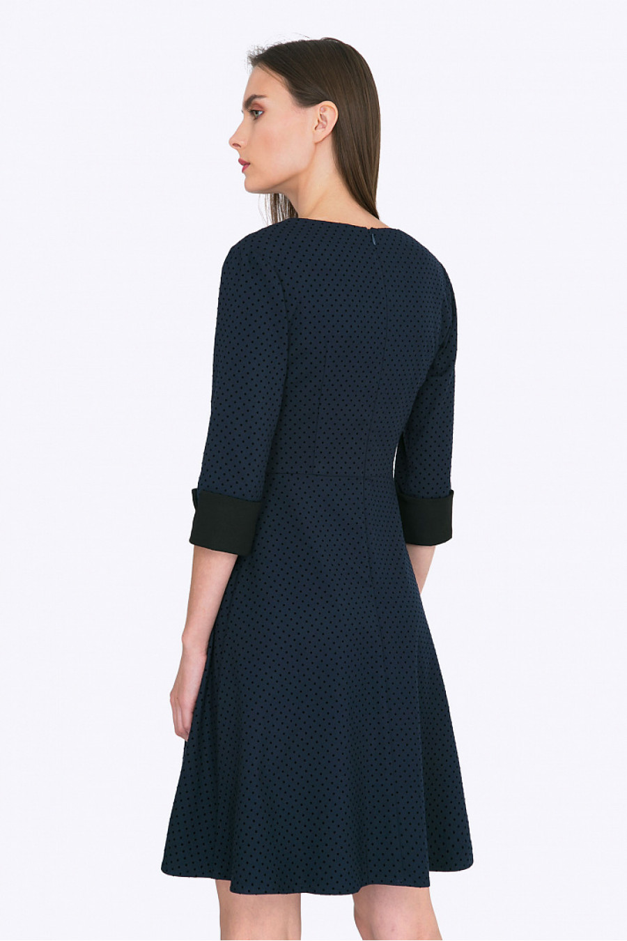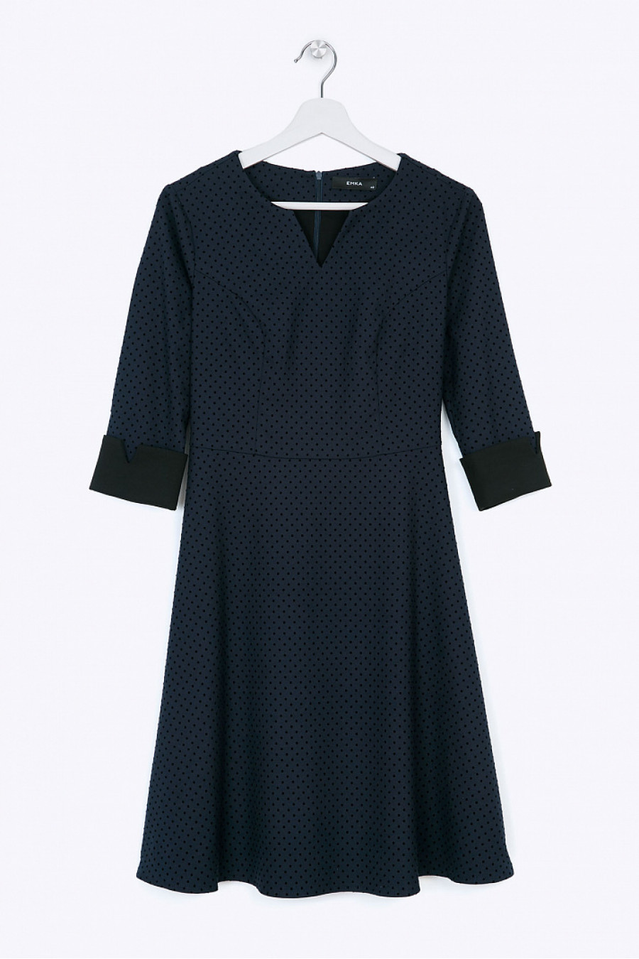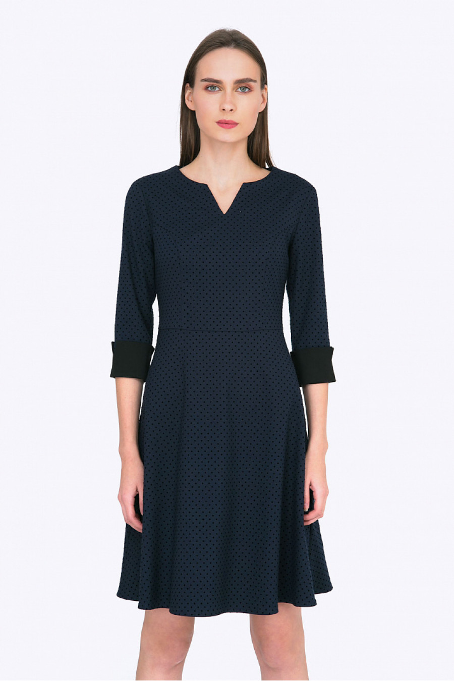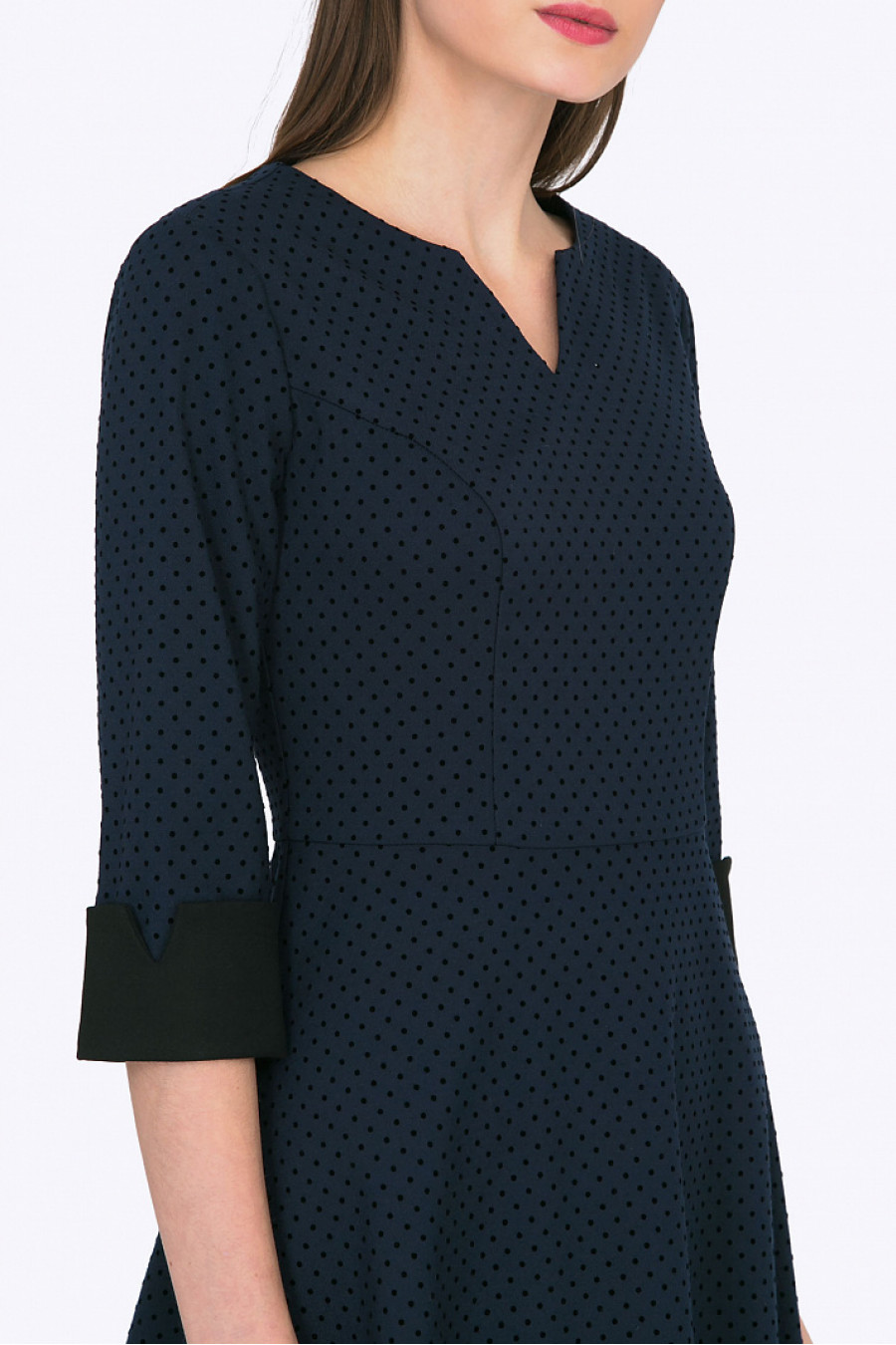 Приталенное платье. Ткань в мелкий горох. На модели классический круглый воротник с вырезом. Есть подкладка. Платье хорошо сидит по фигуре. Идеально подойдет для делового лука или на каждый день. Рост фотомодели 177см.
