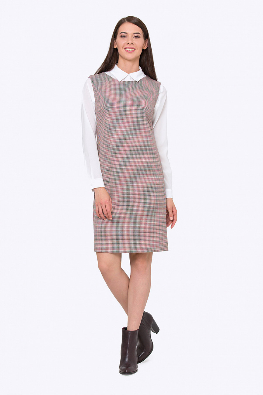 Платье прямого кроя без рукавов. Ткань плотная в гусиную лапку. Без подкладки. По бокам в боковых швах есть карманы. Вхолодную пору многие истинные модницы и бизнес-леди отдают предпочтение платью без рукавов.Такую модельпринято носить поверх блузки, рубашки или водолазки,комплект необычайно удобен и выглядит стильно. Образ на фото дополненБлузка b 2260/makarena. Рост фотомодели 172см.