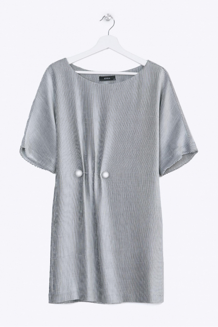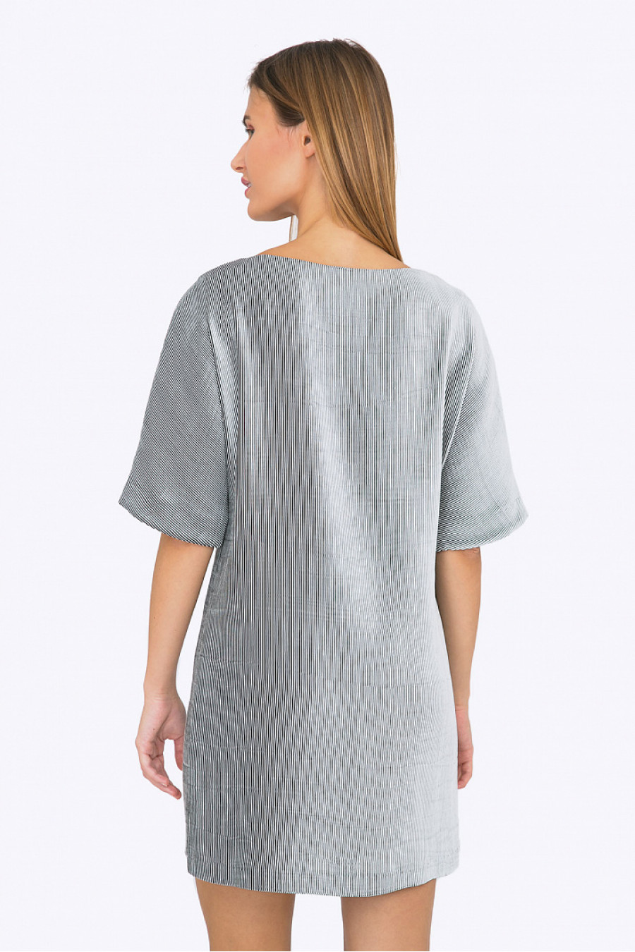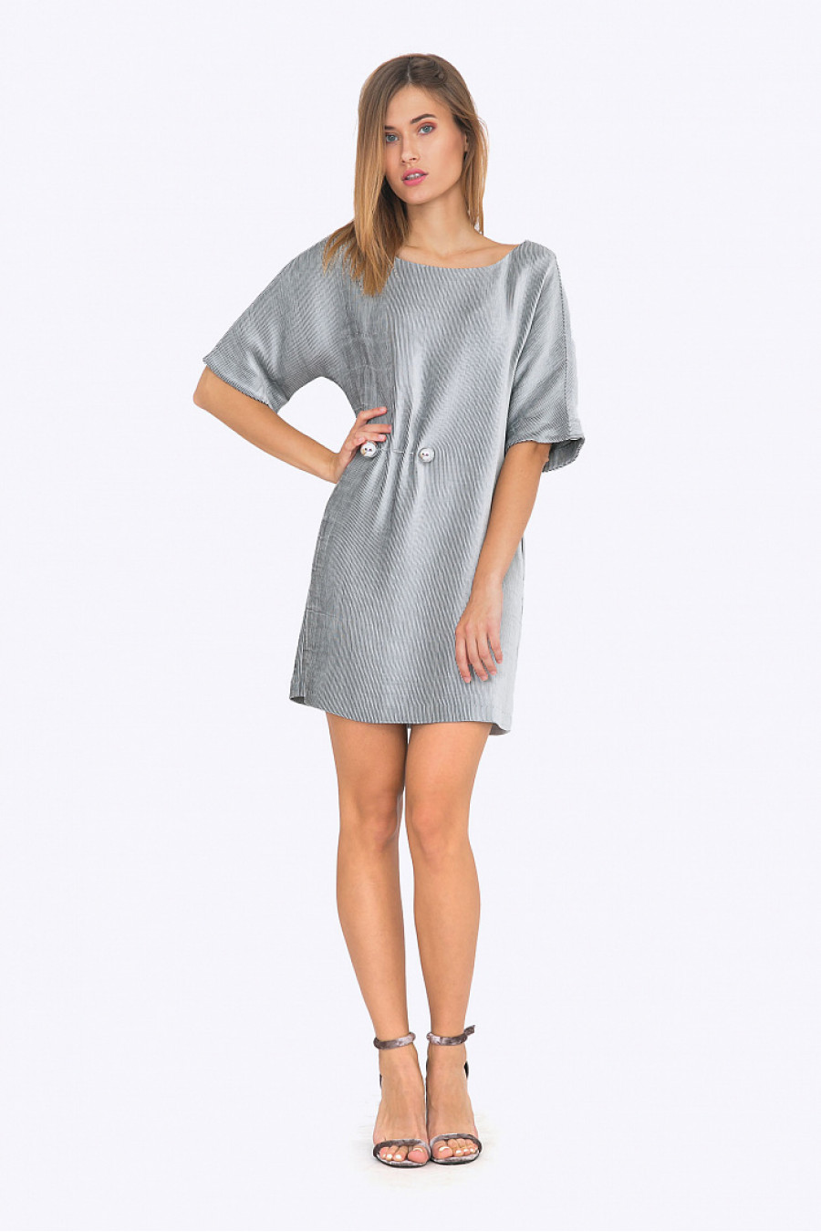 Нарядное платье прямого кроя с брошкой. Ткань структурная в полоску. Без подкладки. Рукава цельнокроеные. Стильное платье для праздничного мероприятия. Рост фотомодели 175 см.