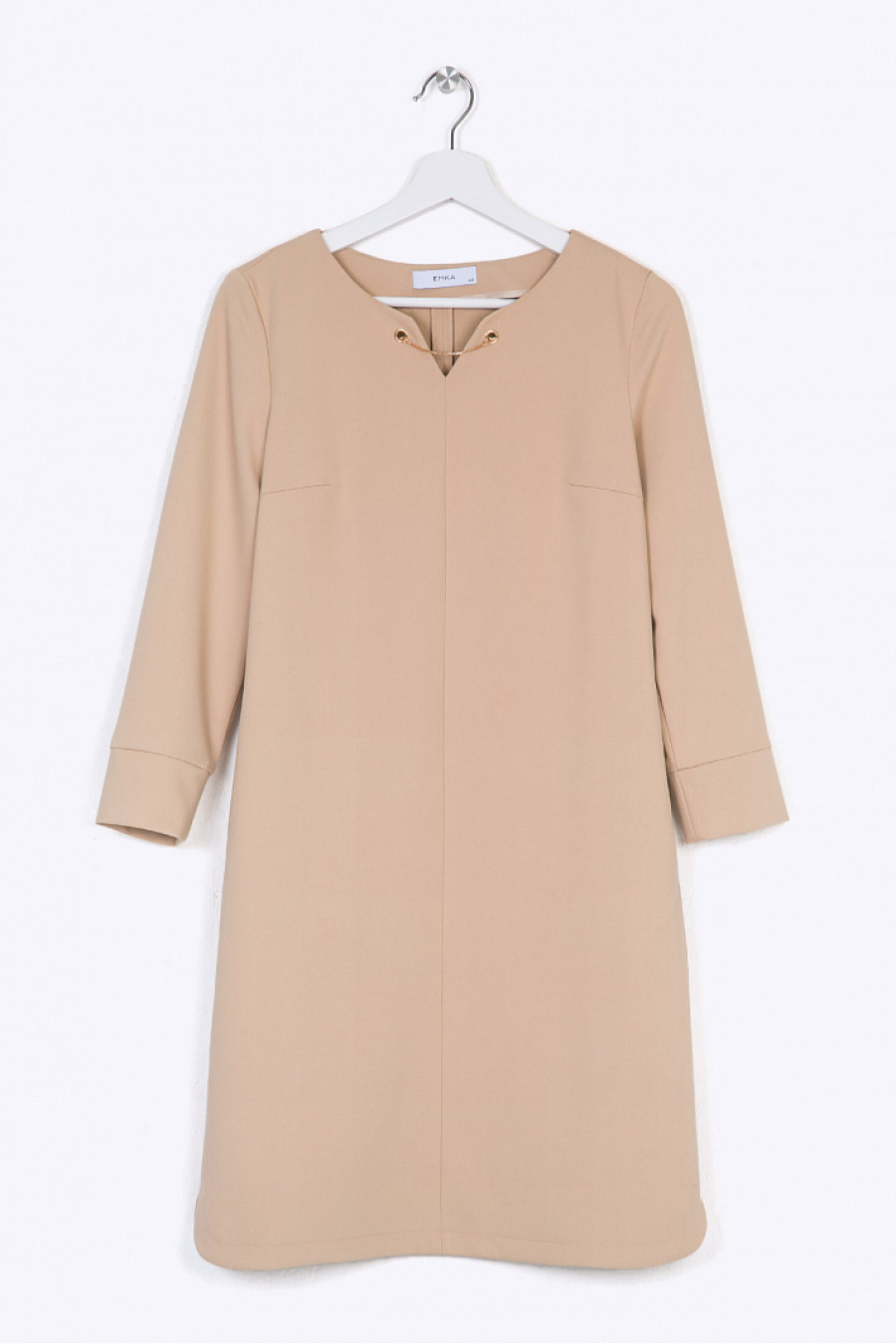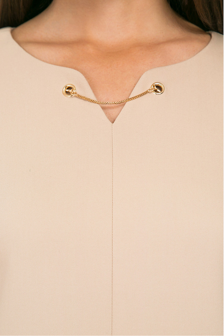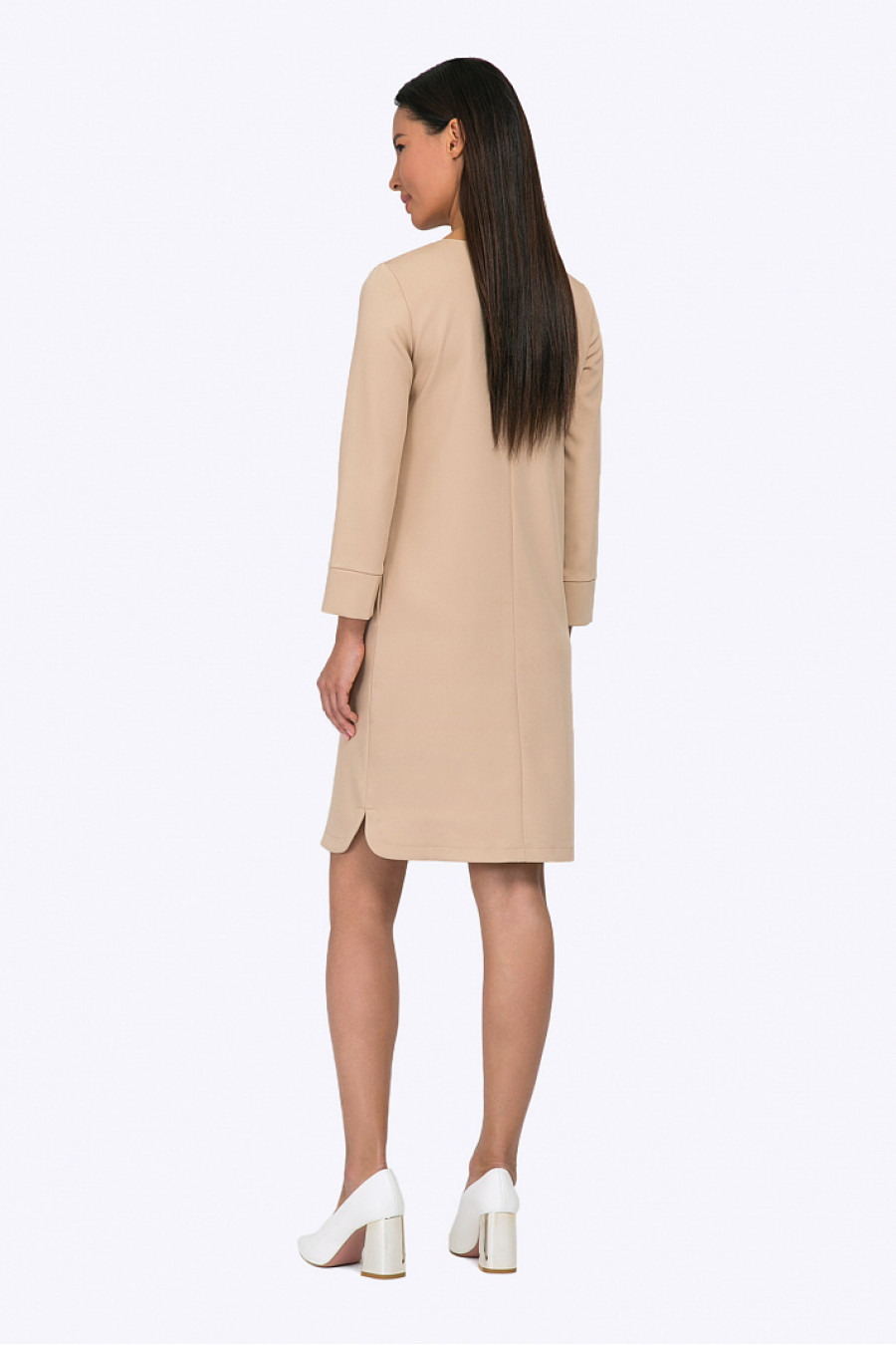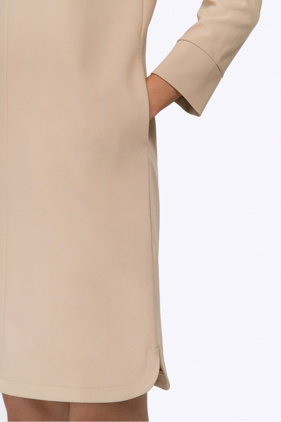 Платье нейтрального бежевого цвета в стиле минимализма из плотной ткани. Модель имеетпрямой крой и свободно облегает фигуру, в боковых швах расположены карманы.Укороченные рукава дополнены широкими манжетами. В качестве основного акцентапредлагается украшенный скромным золотистым элементом фигурный вырез горловины,перекликающийся по форме с боковыми разрезами на подоле. Рост фотомодели 175см.