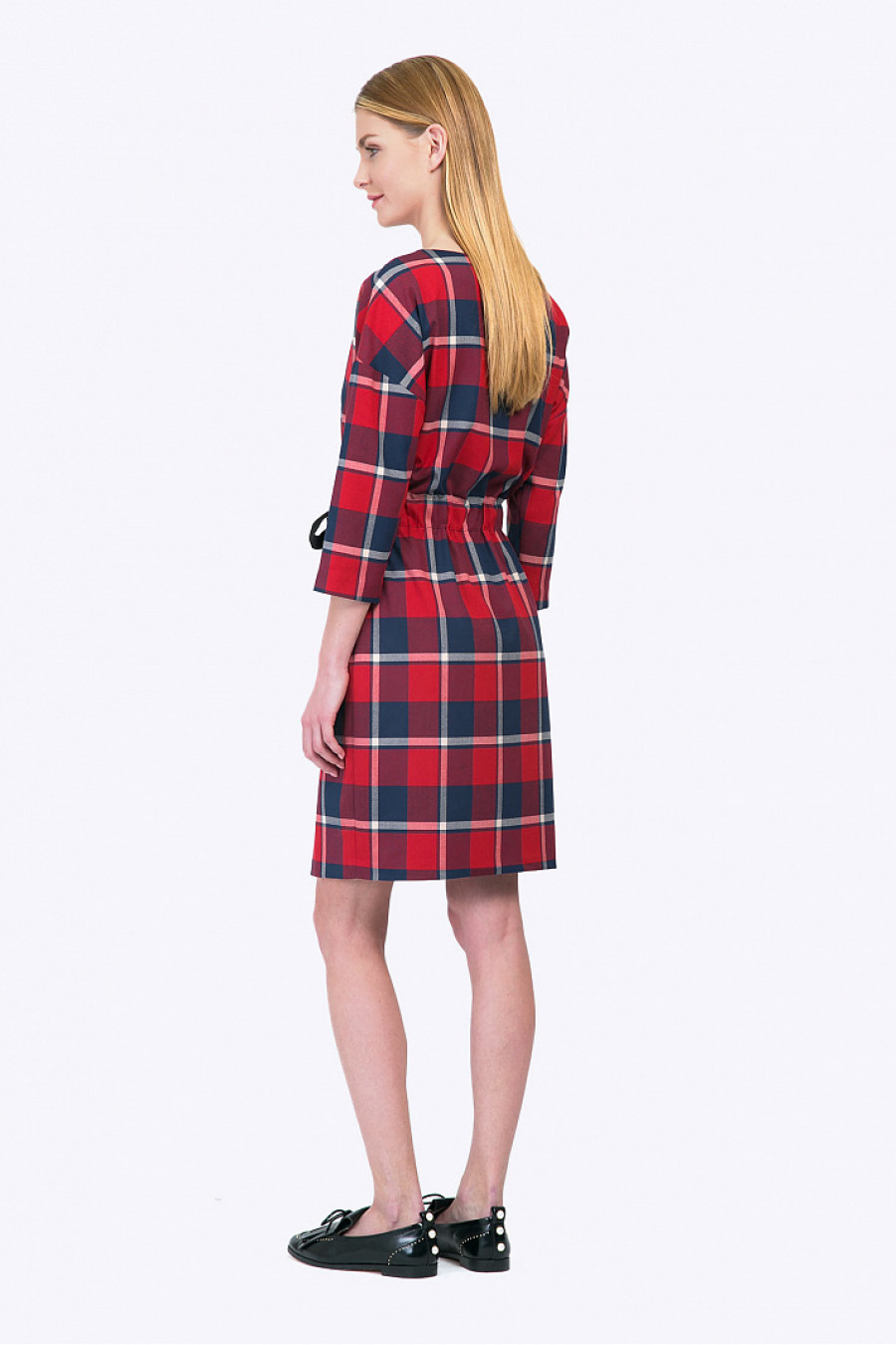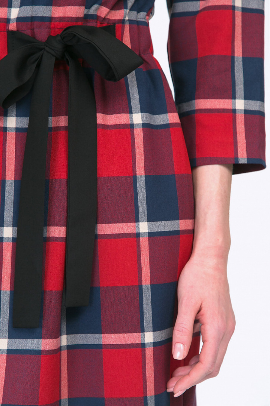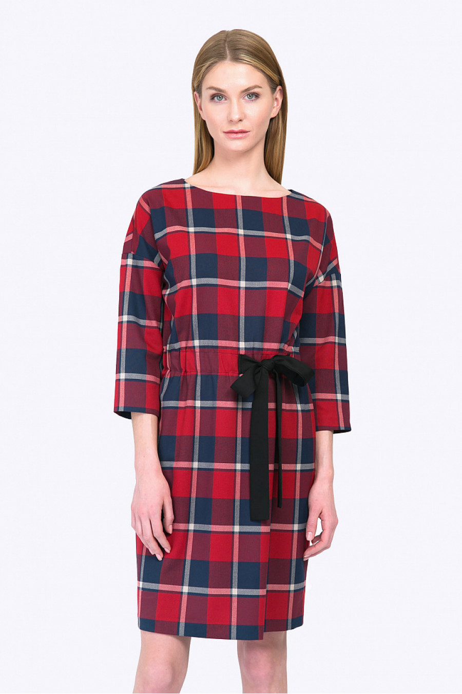 Якрое и выразительное, это стильное ретро-платье - прекрасный выбор для создания актуального делового образа. Лаконичный креативный дизайн с акцентом на декоративном поясе-банте сделает образ незабываемым. Красная сумка и мокасины дополнят модный сет. Модель без подкладки. Рост фотомодели 175 см.