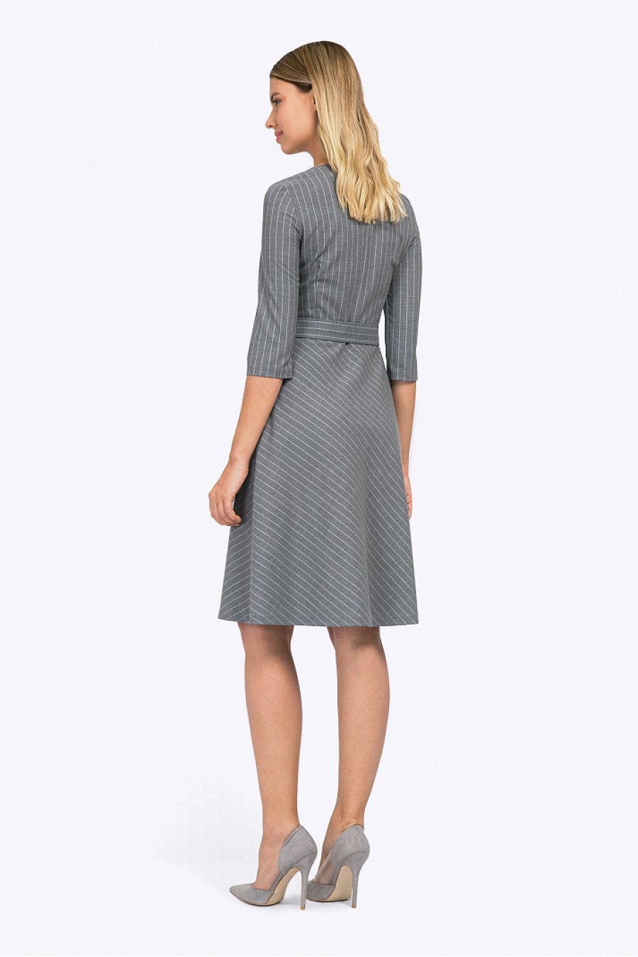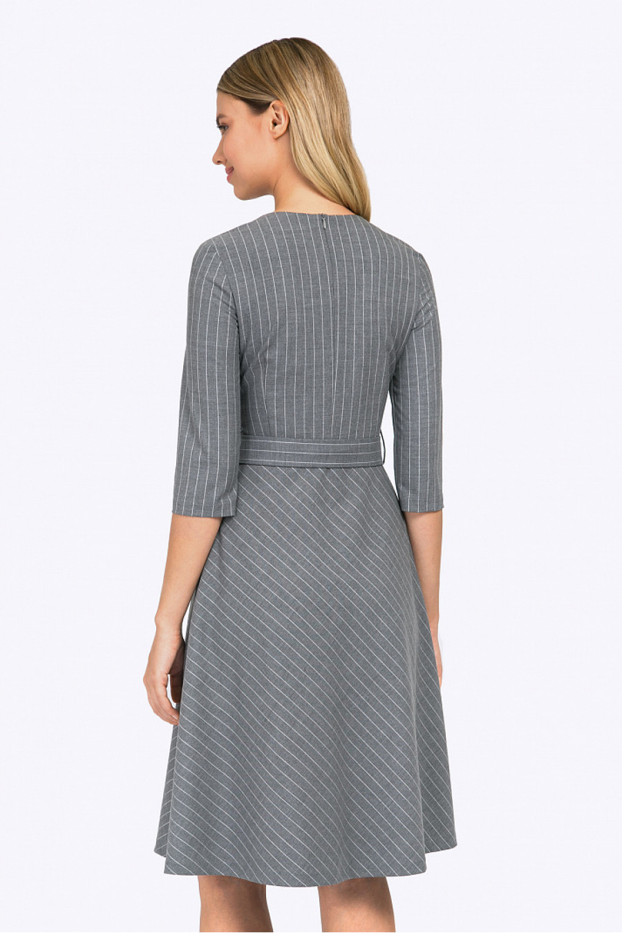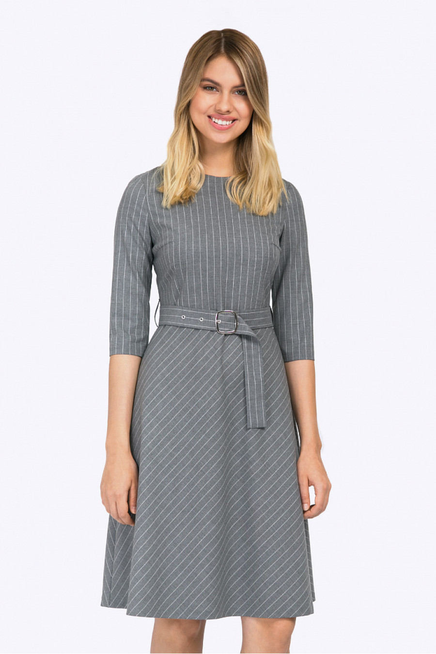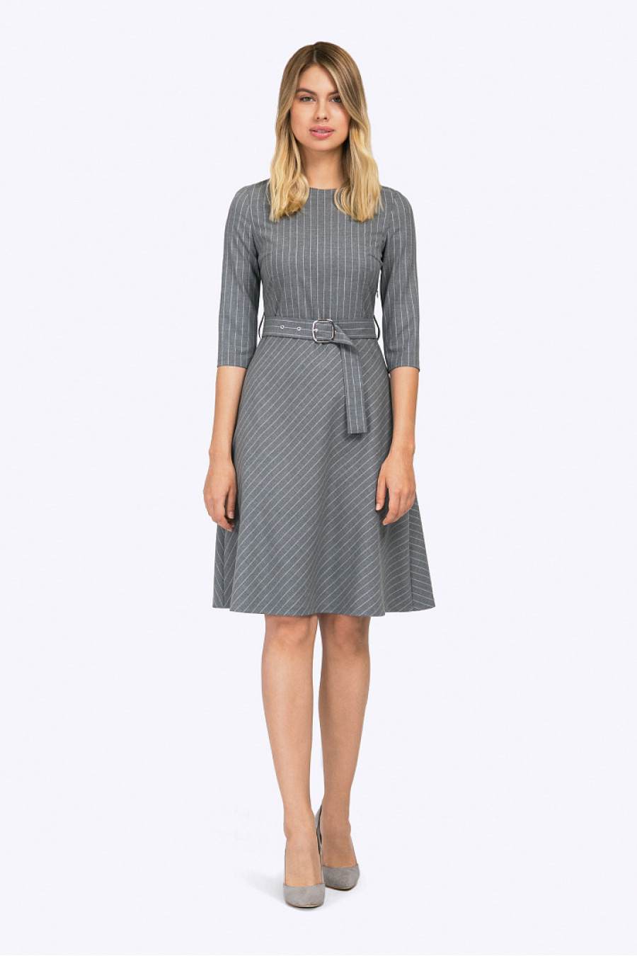 Отрезное по линии талии серое в белую полоску платье-миди из смесовыйкостюмной ткани. Лиф модели прилегающего силуэта с узкими рукавами ¾ и круглымвырезом горловины с застёжкой-молнией. Юбка расклешённого книзу А-силуэта. Линияталии подчёркнута широким поясом с прямоугольной металлической пряжкой.Украшением модели служит удачное сочетание вертикальных и диагональных белыхполос. Рост фотомодели 177 см.