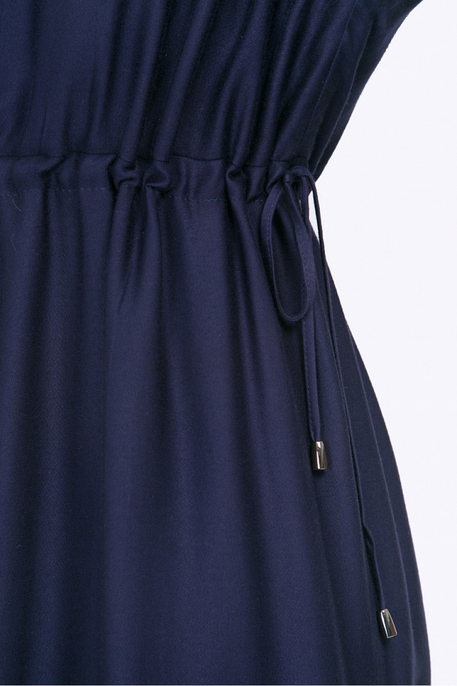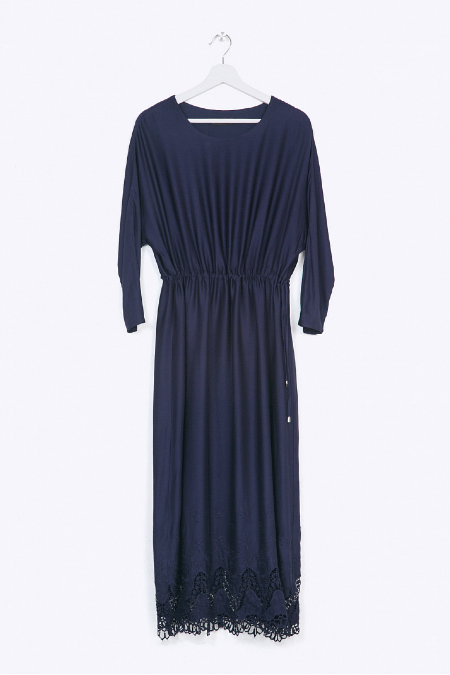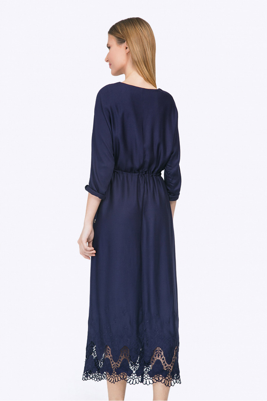 Синее платье с широкой ажурной каймой по низу изделия и цельнокроеными рукавами 3-4 с небольшими отворотами. Модель имеет свободный прямой силуэт, круглый вырез горловины, линия талия подчёркнута узкой кулиской с затягивающимся сбоку шнурком.Есть подкладка.Рост фотомодели 175 см.