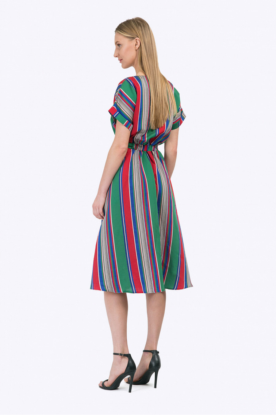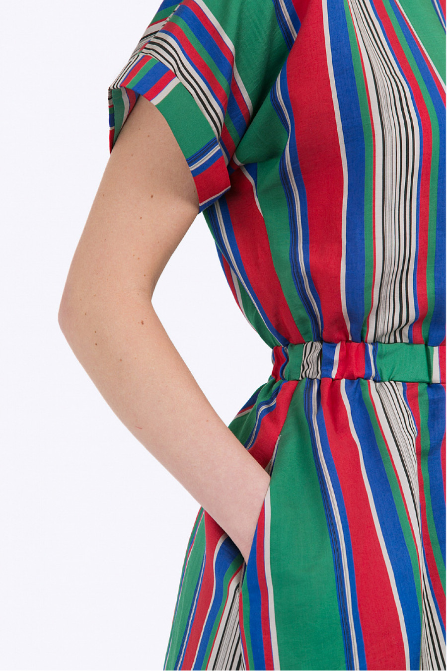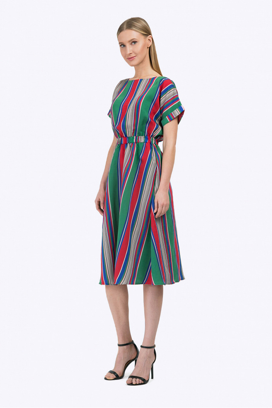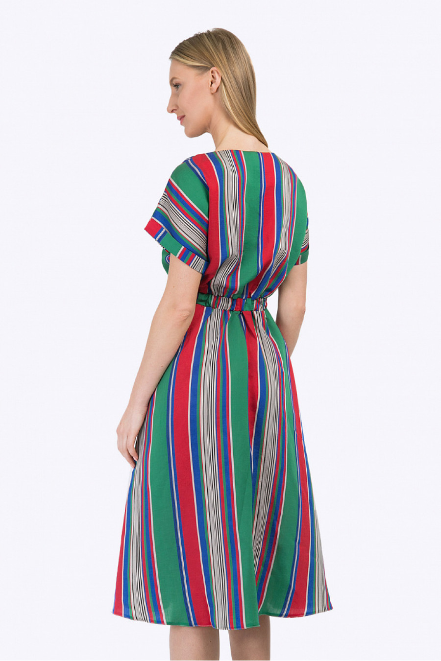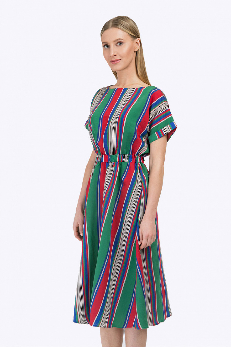 Платье в разноцветную полоску с короткими рукавами-кимоно. Линия талии подчёркнута широкой резинкой, рукава декорированы небольшими отворотами. Юбка А-силуэта средней длины дополнена втачными карманами. Модель выполнена из тенсела – экологичного материла, производящегося из эвкалипта. Что обеспечивает ткани повышенную прочность, гигроскопичность и антибактериальный эффект. Рост фотомодели 177 см.